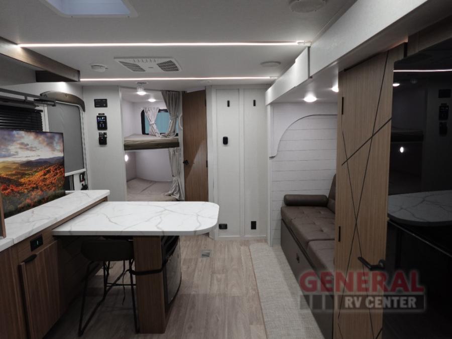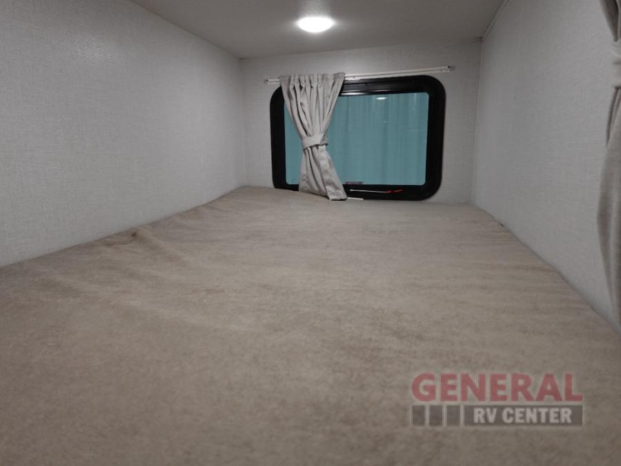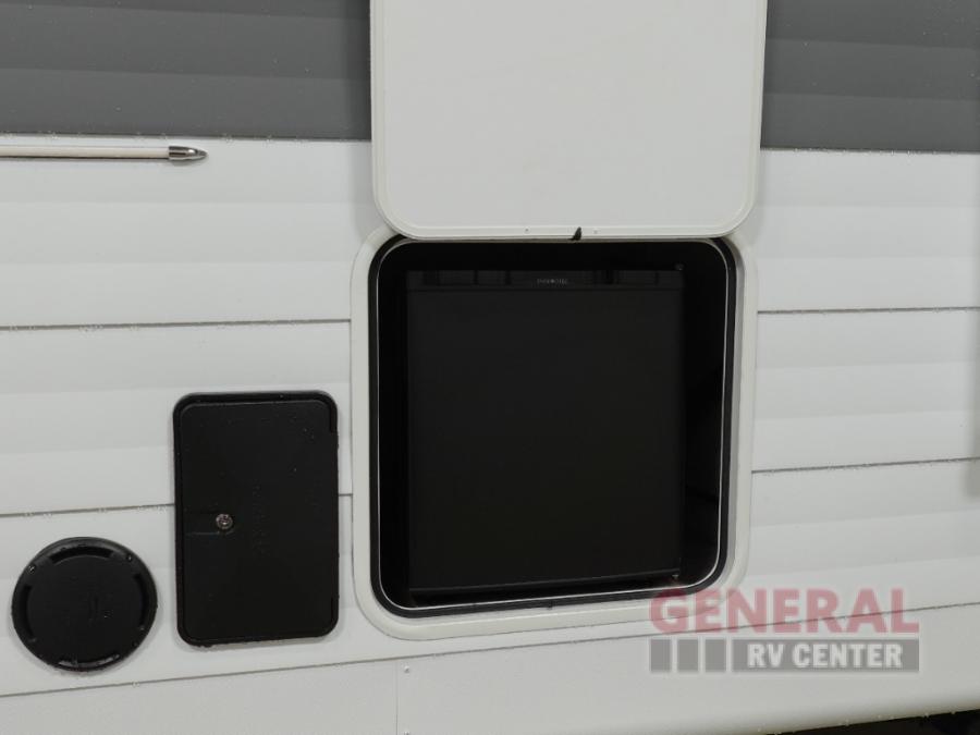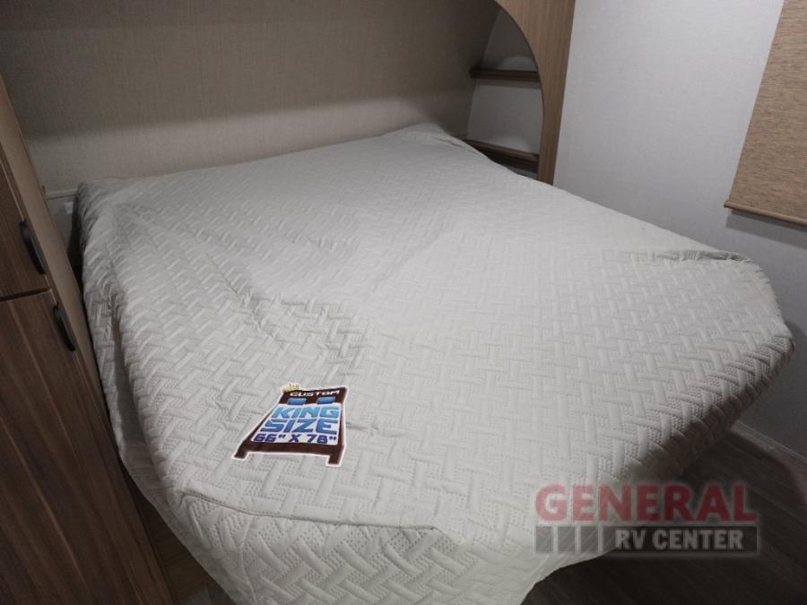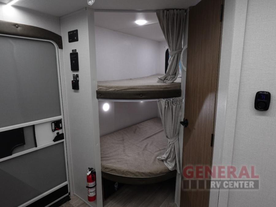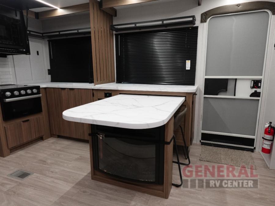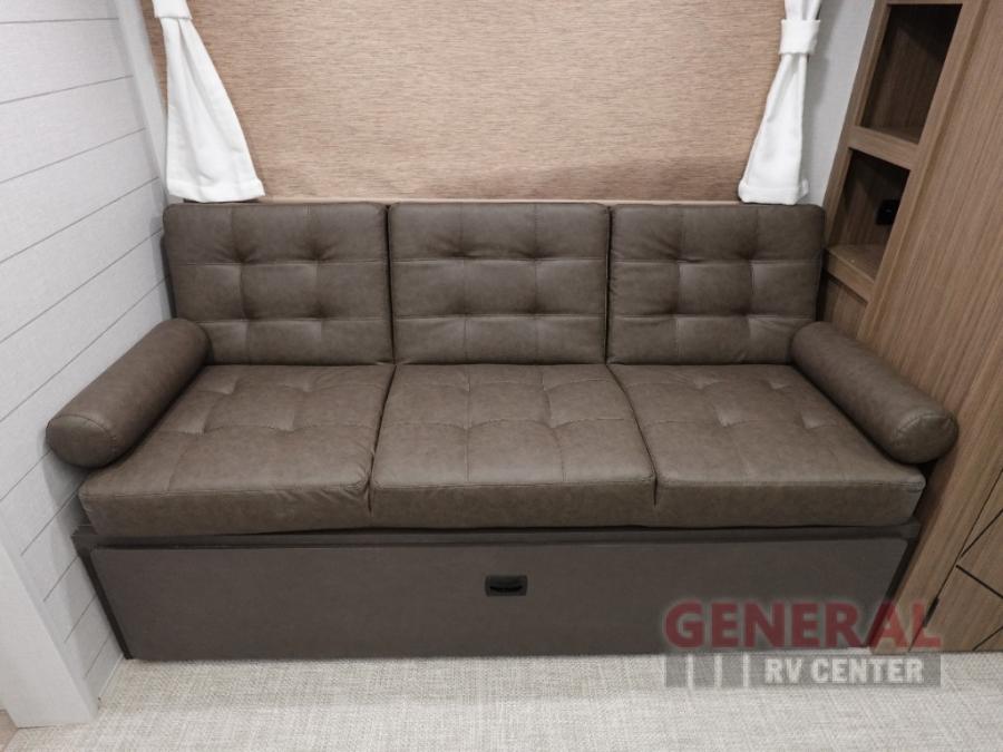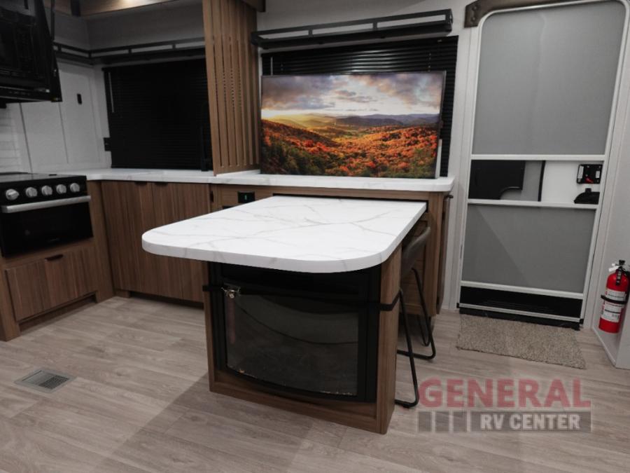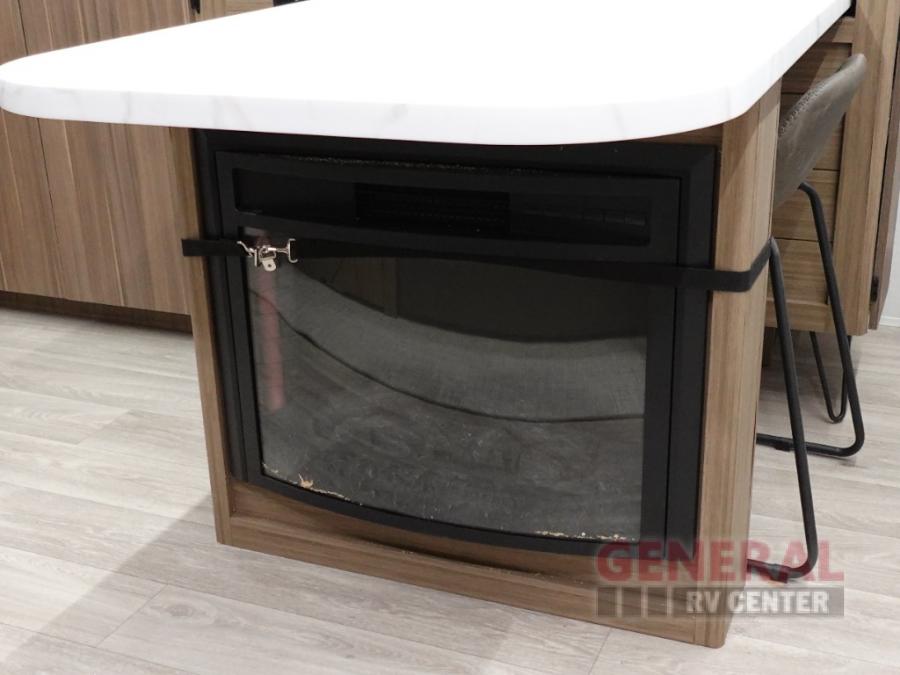 You can enjoy at-home comforts wherever you decide to camp in this travel trailer. The custom king bed with Versa Tilt includes dual shelves and a wardrobe so you can keep your space tidy. If you have a guest or two little ones, they can sleep on the jackknife sofa within the large slide out or on the double-size bunks right next to the full bath. Once you've made breakfast in the fully equipped kitchen, you can utilize the pull-out table to dine at. There is also a fireplace below the table, which will be perfect for cozy evenings indoors.