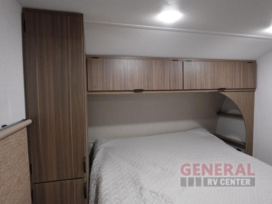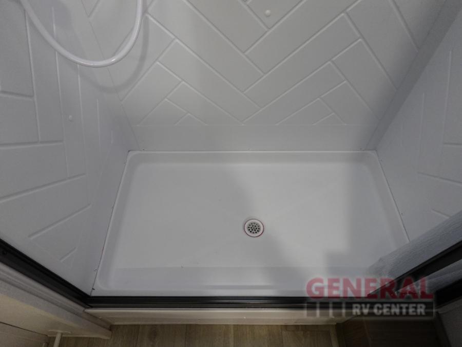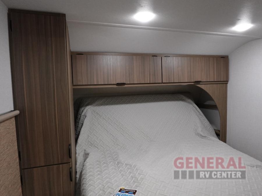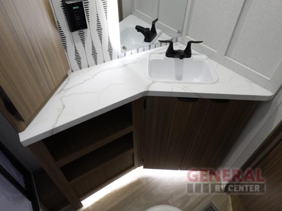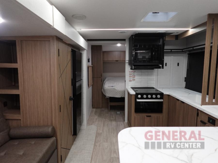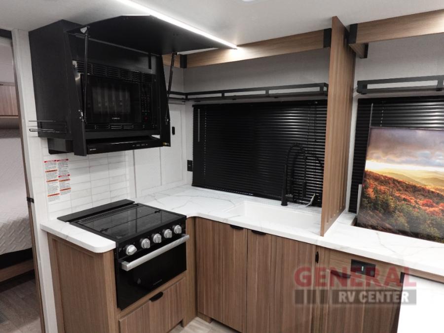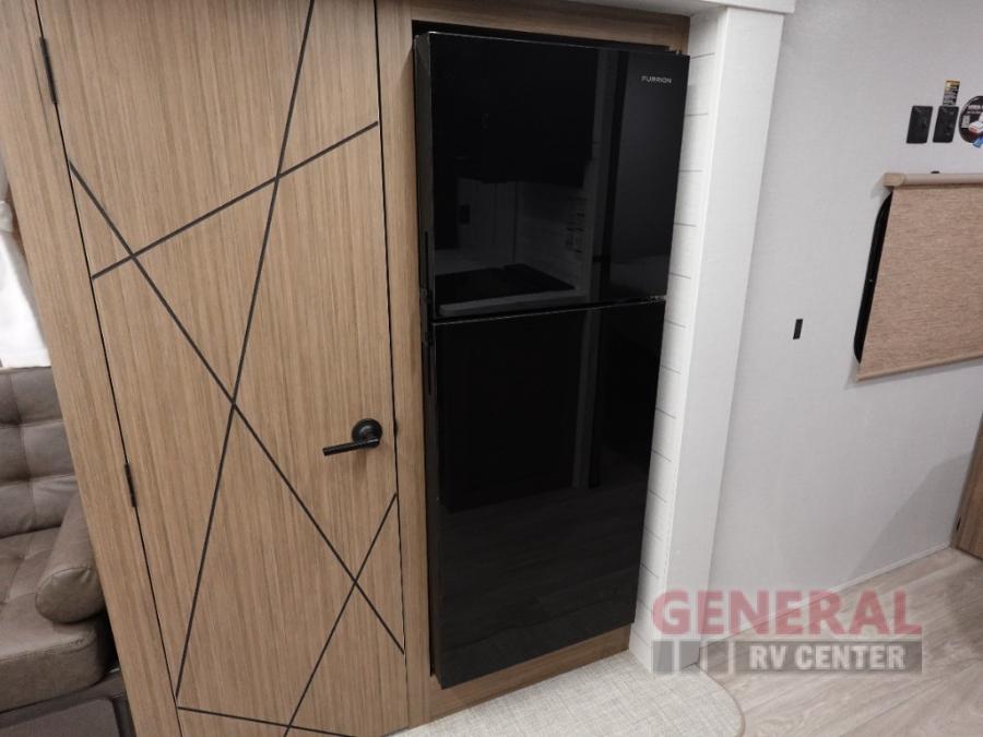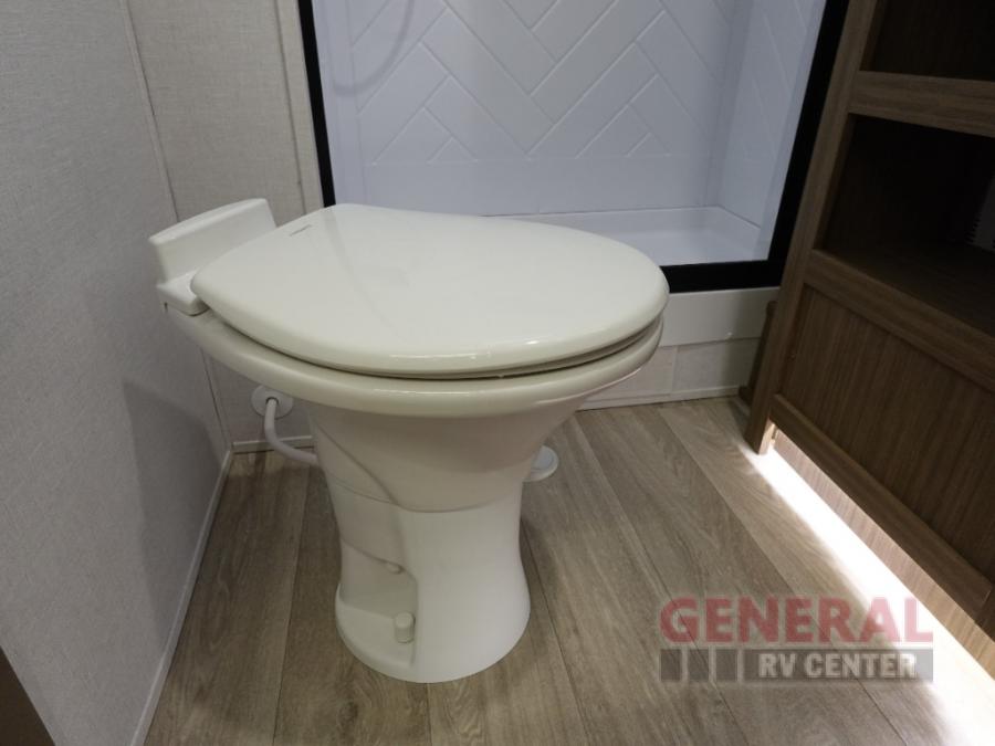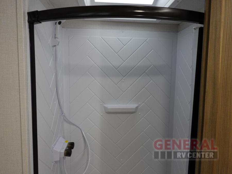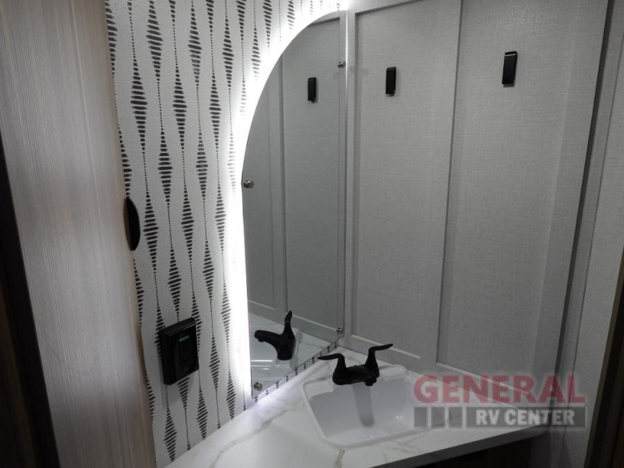 You can enjoy at-home comforts wherever you decide to camp in this travel trailer. The custom king bed with Versa Tilt includes dual shelves and a wardrobe so you can keep your space tidy. If you have a guest or two little ones, they can sleep on the jackknife sofa within the large slide out or on the double-size bunks right next to the full bath. Once you've made breakfast in the fully equipped kitchen, you can utilize the pull-out table to dine at. There is also a fireplace below the table, which will be perfect for cozy evenings indoors.