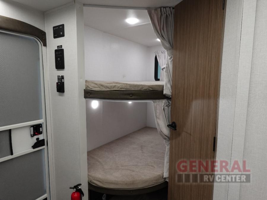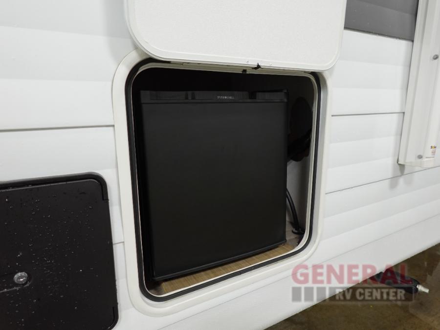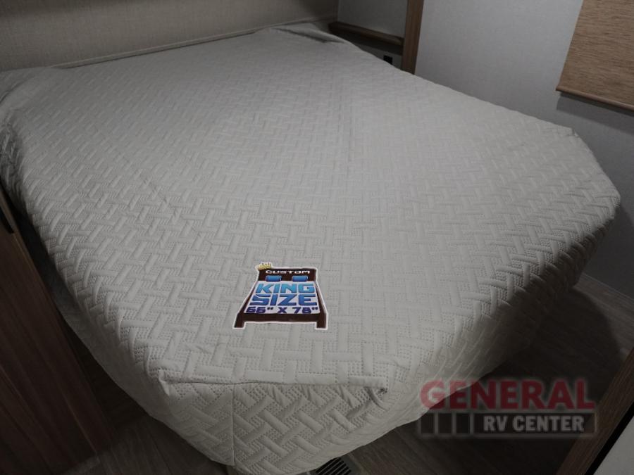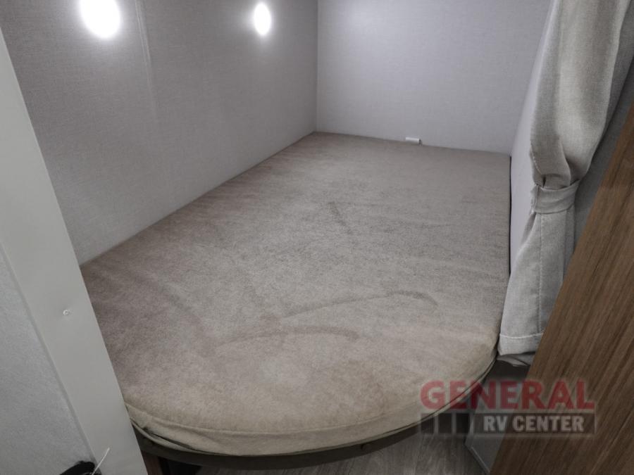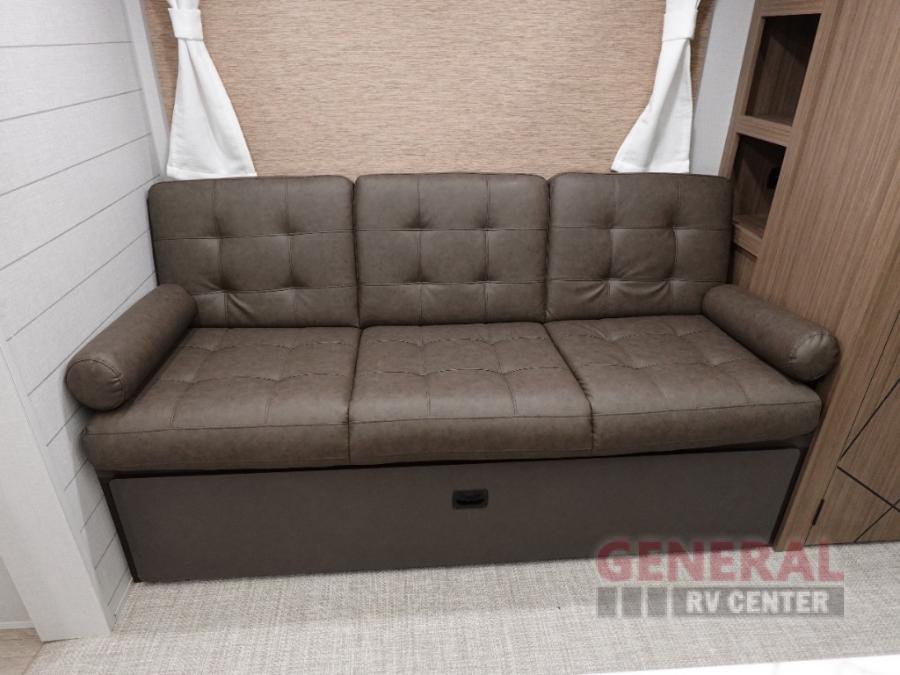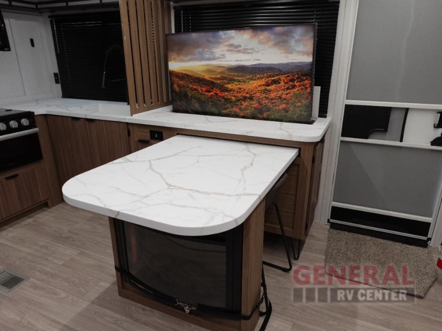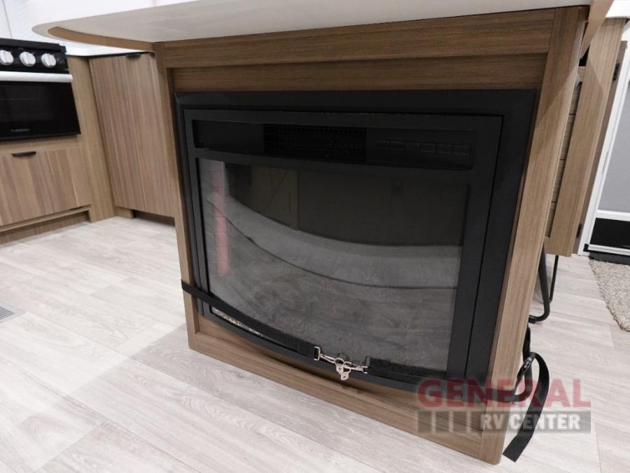 You can enjoy at-home comforts wherever you decide to camp in this travel trailer. The custom king bed with Versa Tilt includes dual shelves and a wardrobe so you can keep your space tidy. If you have a guest or two little ones, they can sleep on the jackknife sofa within the large slide out or on the double-size bunks right next to the full bath. Once you've made breakfast in the fully equipped kitchen, you can utilize the pull-out table to dine at. There is also a fireplace below the table, which will be perfect for cozy evenings indoors.