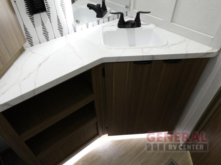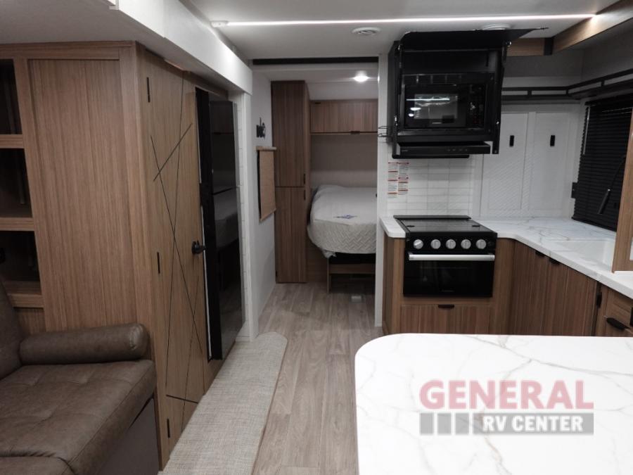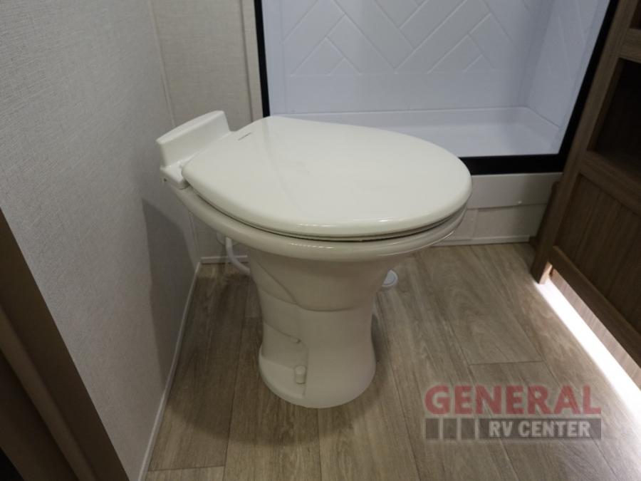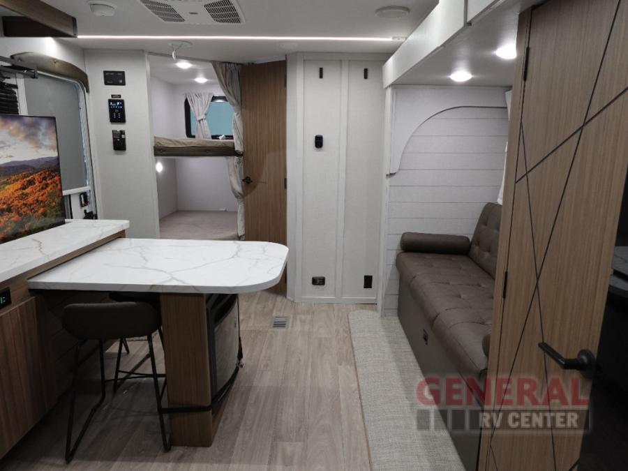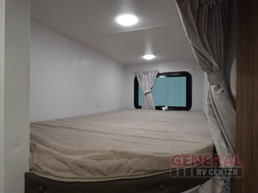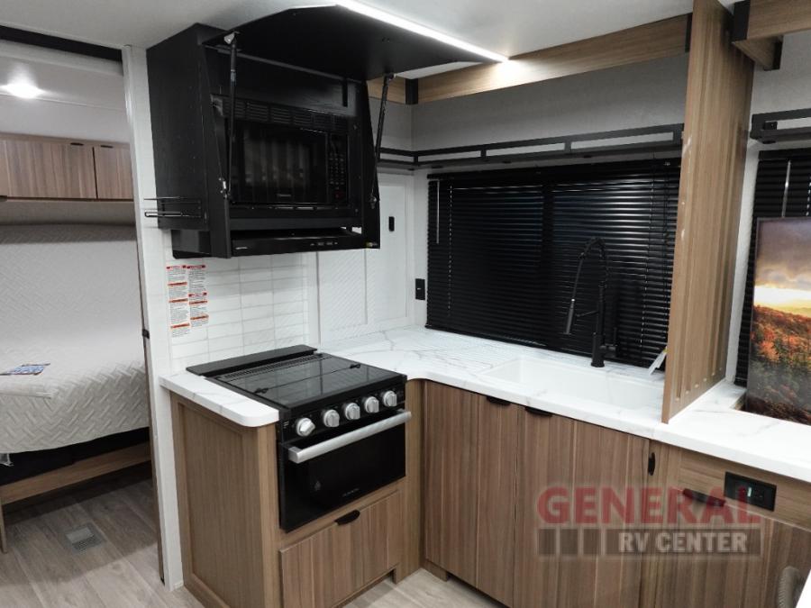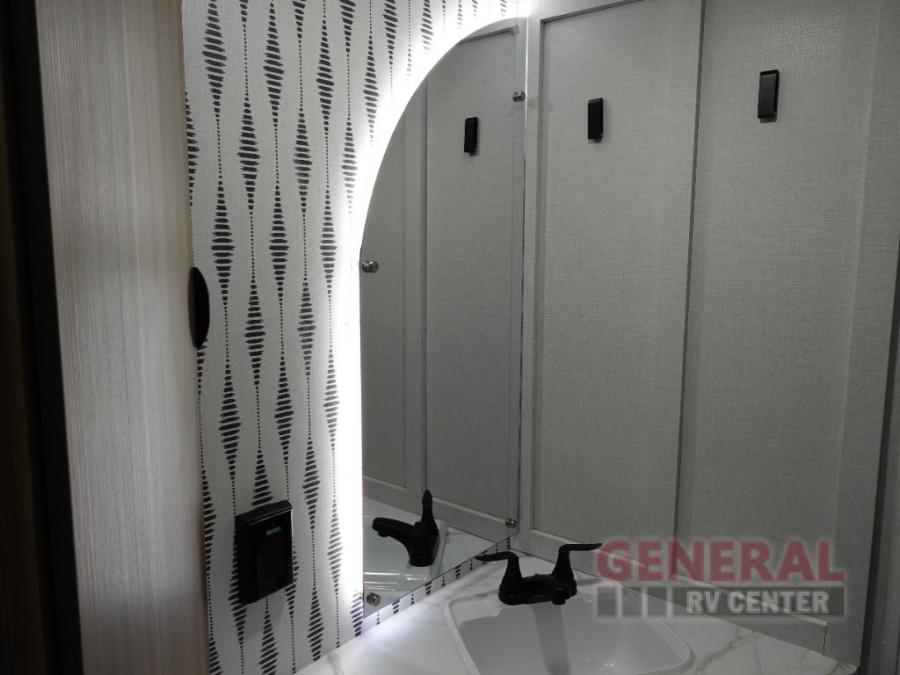 You can enjoy at-home comforts wherever you decide to camp in this travel trailer. The custom king bed with Versa Tilt includes dual shelves and a wardrobe so you can keep your space tidy. If you have a guest or two little ones, they can sleep on the jackknife sofa within the large slide out or on the double-size bunks right next to the full bath. Once you've made breakfast in the fully equipped kitchen, you can utilize the pull-out table to dine at. There is also a fireplace below the table, which will be perfect for cozy evenings indoors.
