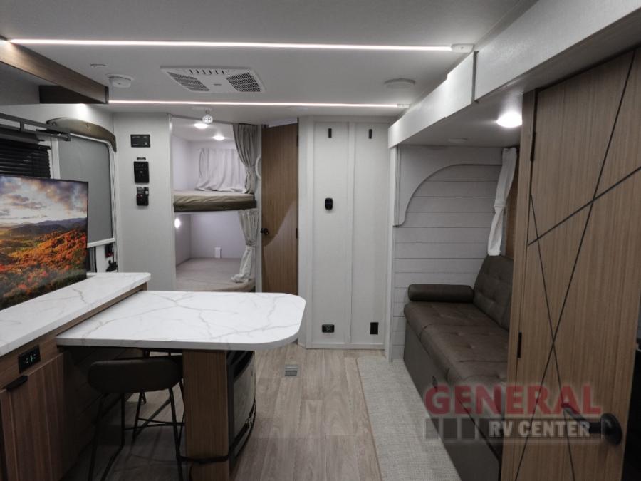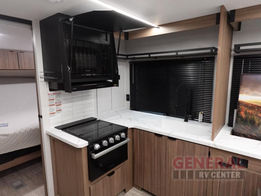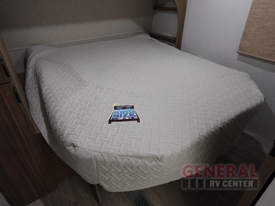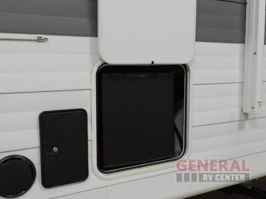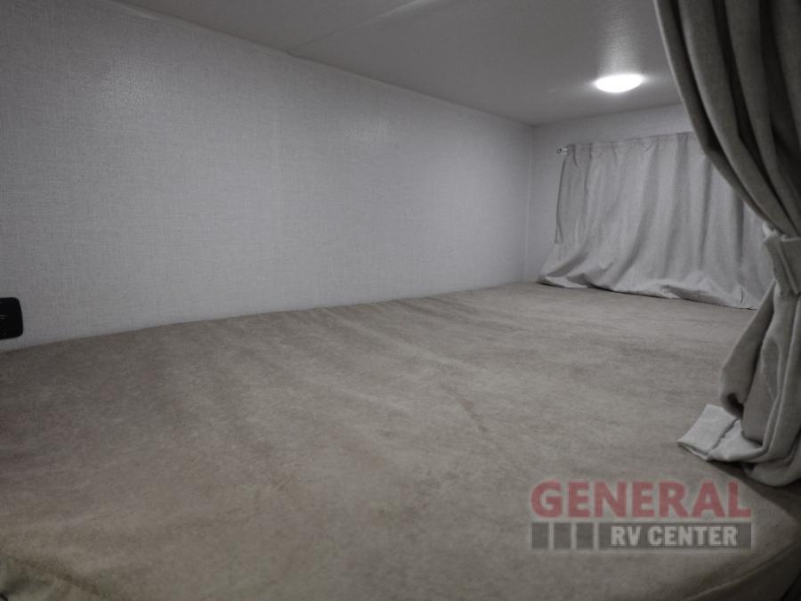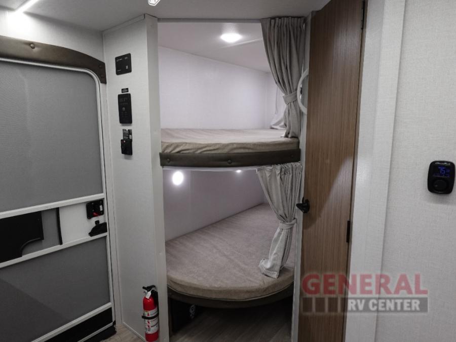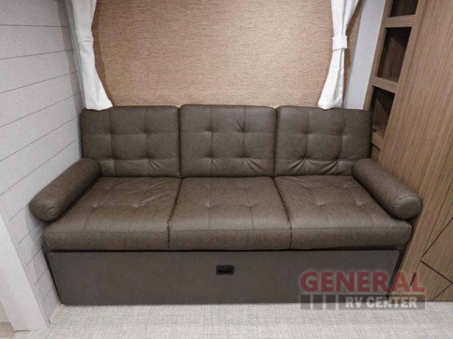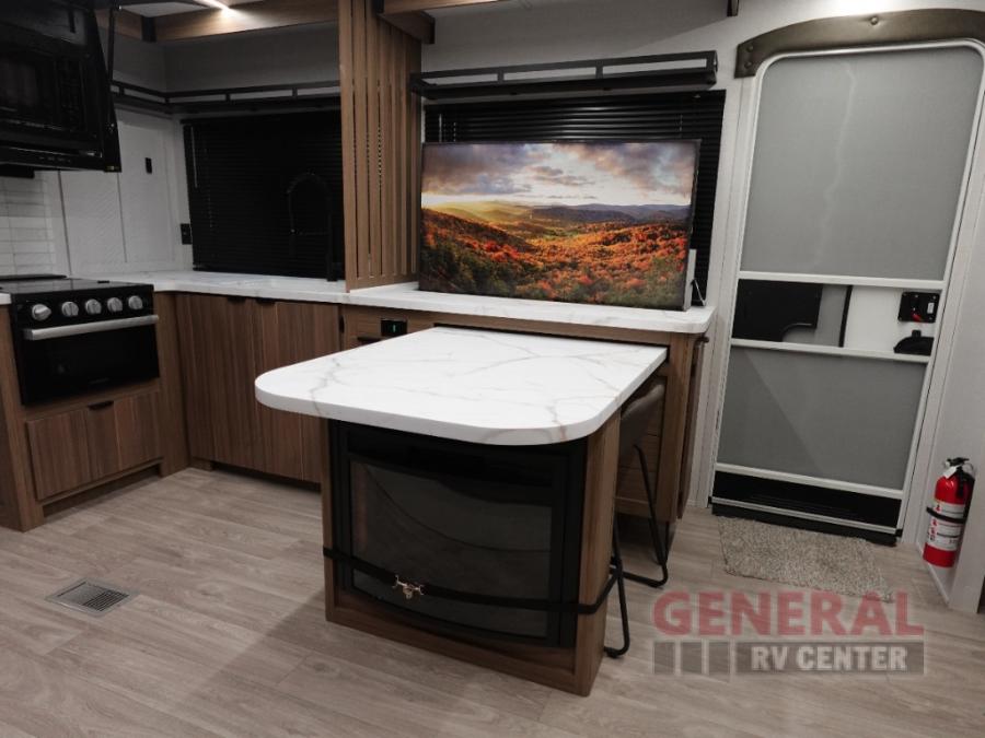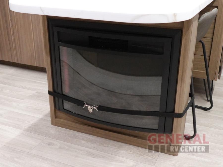You can enjoy at-home comforts wherever you decide to camp in this travel trailer. The custom king bed with Versa Tilt includes dual shelves and a wardrobe so you can keep your space tidy. If you have a guest or two little ones, they can sleep on the jackknife sofa within the large slide out or on the double-size bunks right next to the full bath. Once you've made breakfast in the fully equipped kitchen, you can utilize the pull-out table to dine at. There is also a fireplace below the table, which will be perfect for cozy evenings indoors.
