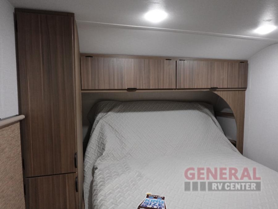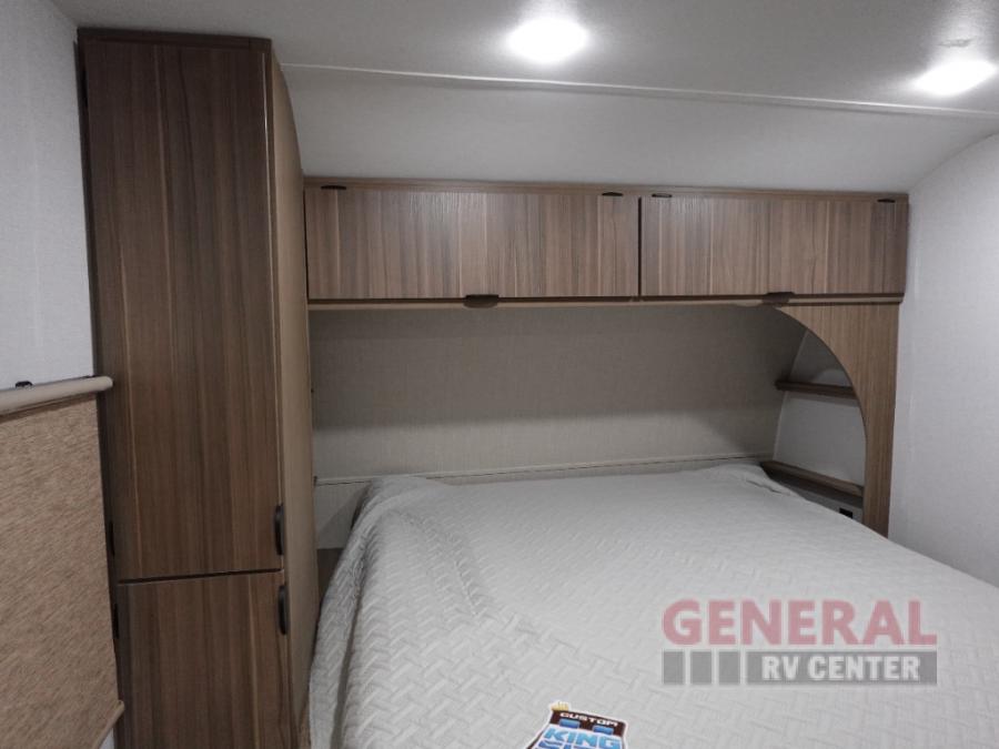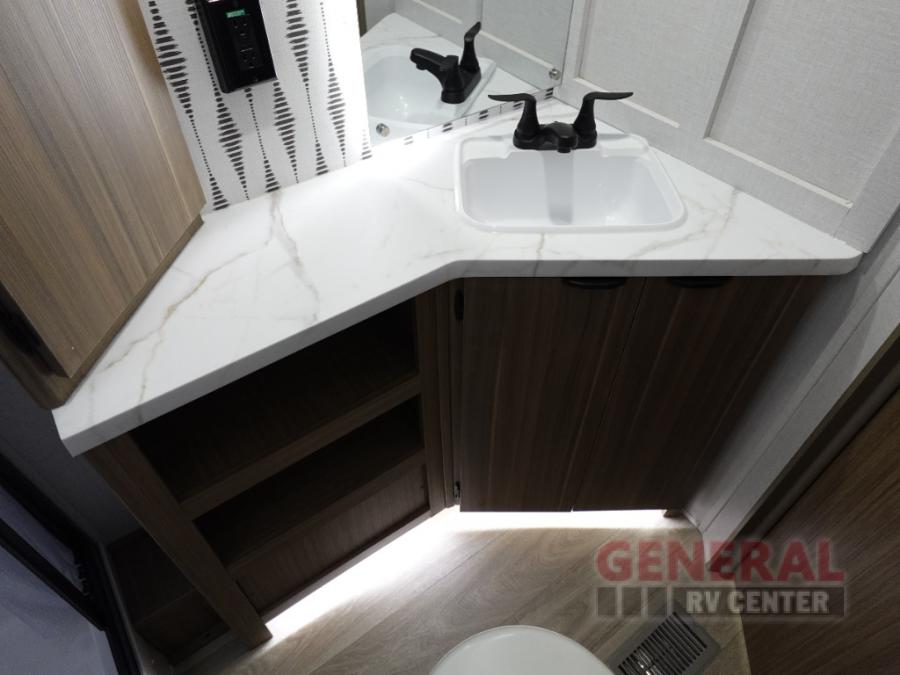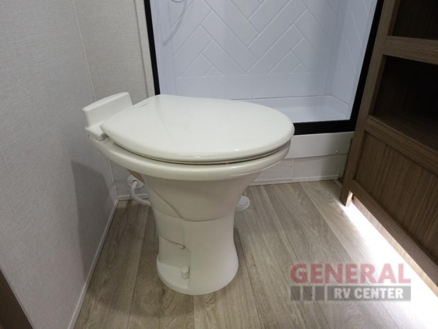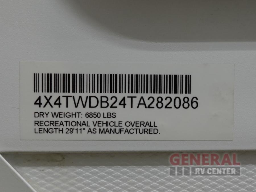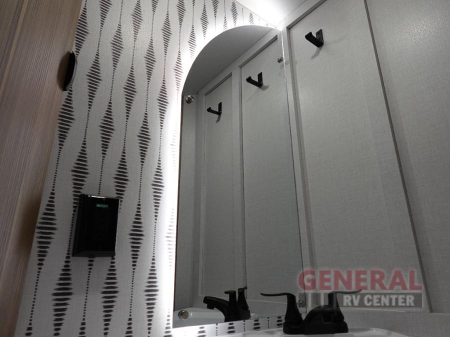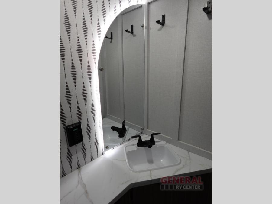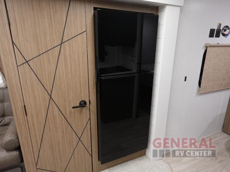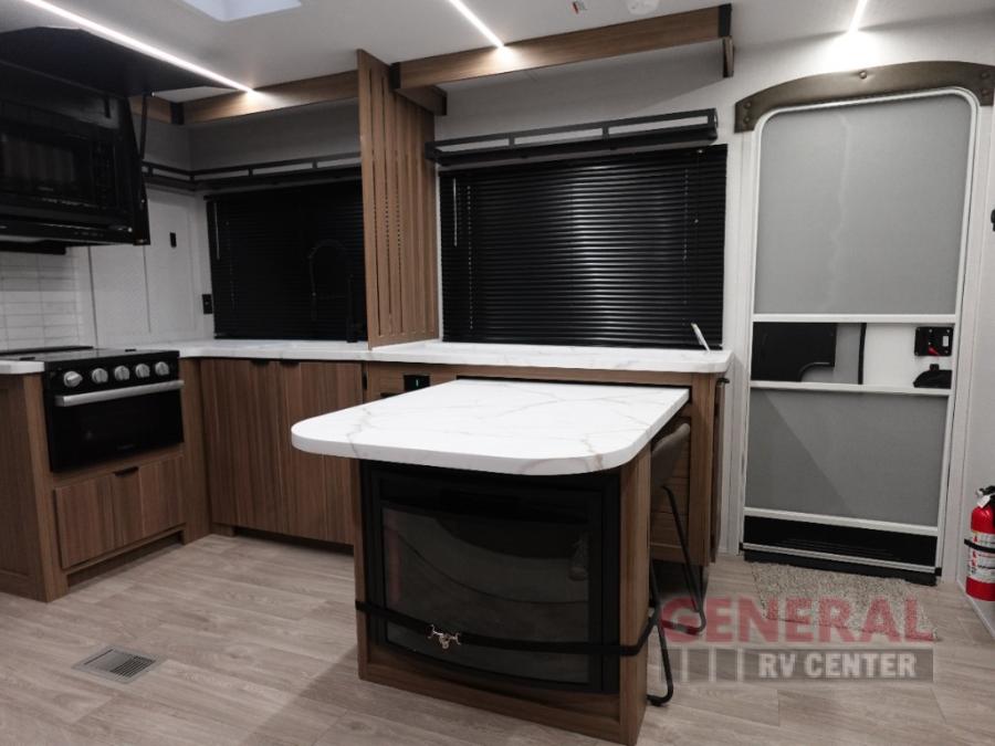 You can enjoy at-home comforts wherever you decide to camp in this travel trailer. The custom king bed with Versa Tilt includes dual shelves and a wardrobe so you can keep your space tidy. If you have a guest or two little ones, they can sleep on the jackknife sofa within the large slide out or on the double-size bunks right next to the full bath. Once you've made breakfast in the fully equipped kitchen, you can utilize the pull-out table to dine at. There is also a fireplace below the table, which will be perfect for cozy evenings indoors.