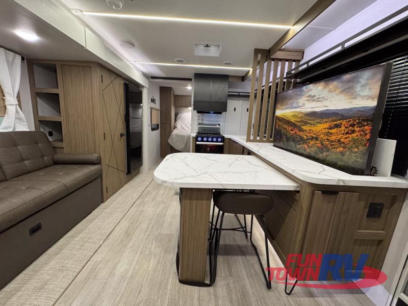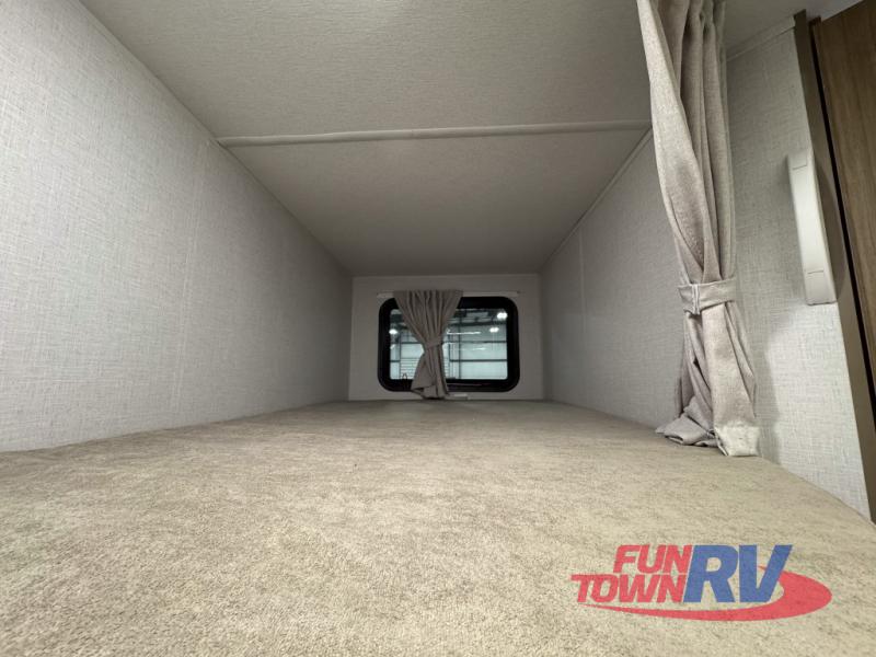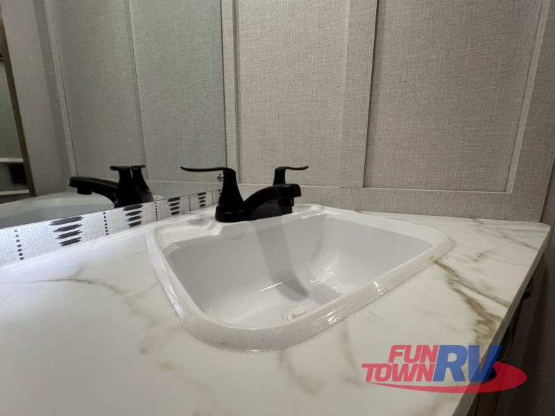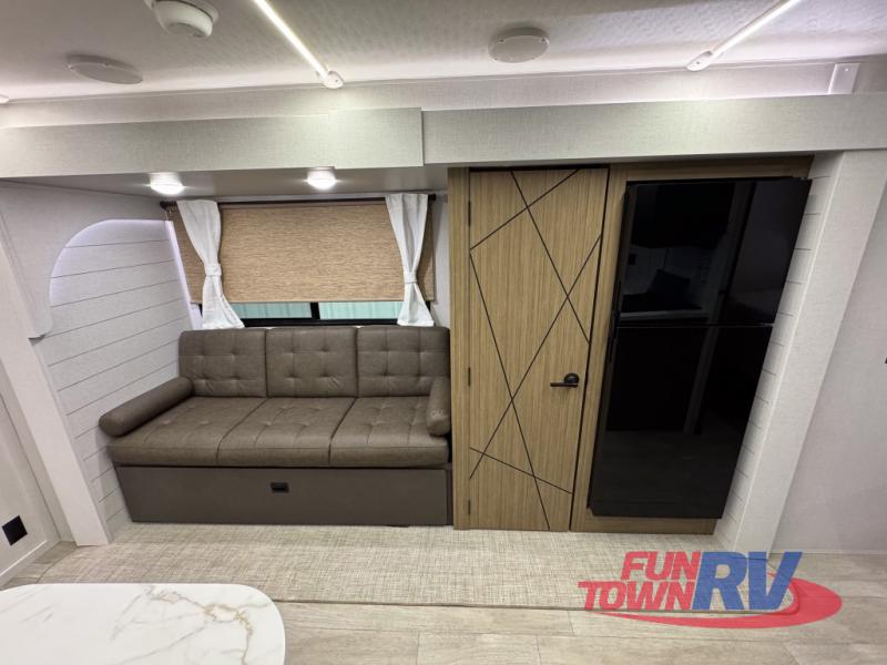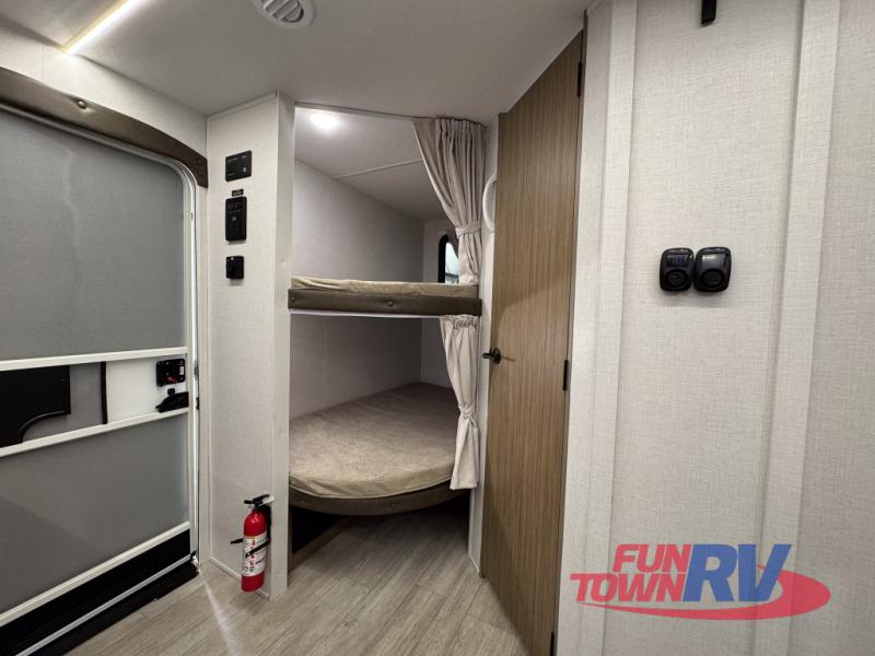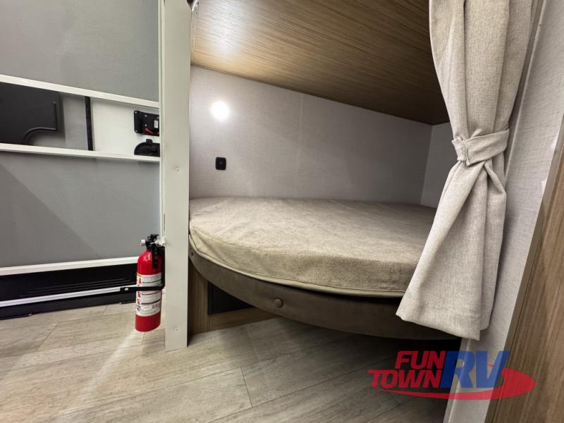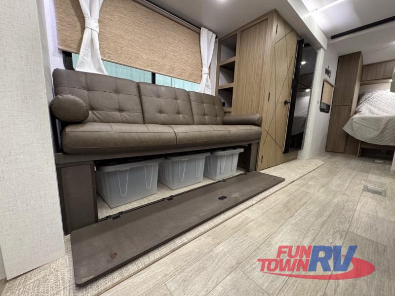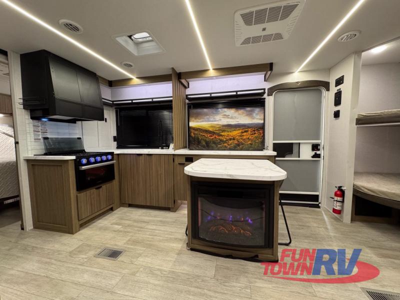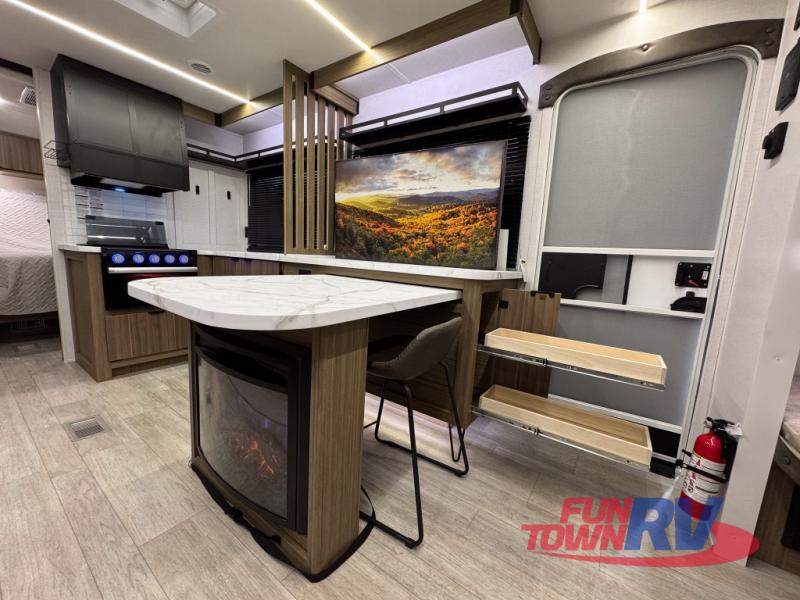 You can enjoy at-home comforts wherever you decide to camp in this travel trailer. The custom king bed with Versa Tilt includes dual shelves and a wardrobe so you can keep your space tidy. If you have a guest or two little ones, they can sleep on the jackknife sofa within the large slide out or on the double-size bunks right next to the full bath. Once you've made breakfast in the fully equipped kitchen, you can utilize the pull-out table to dine at. There is also a fireplace below the table, which will be perfect for cozy evenings indoors.