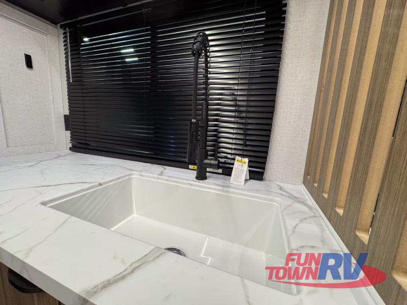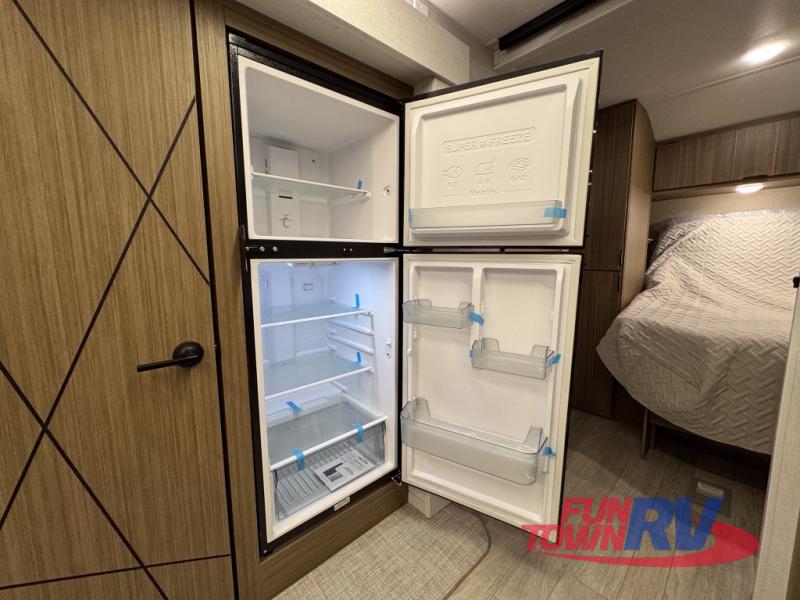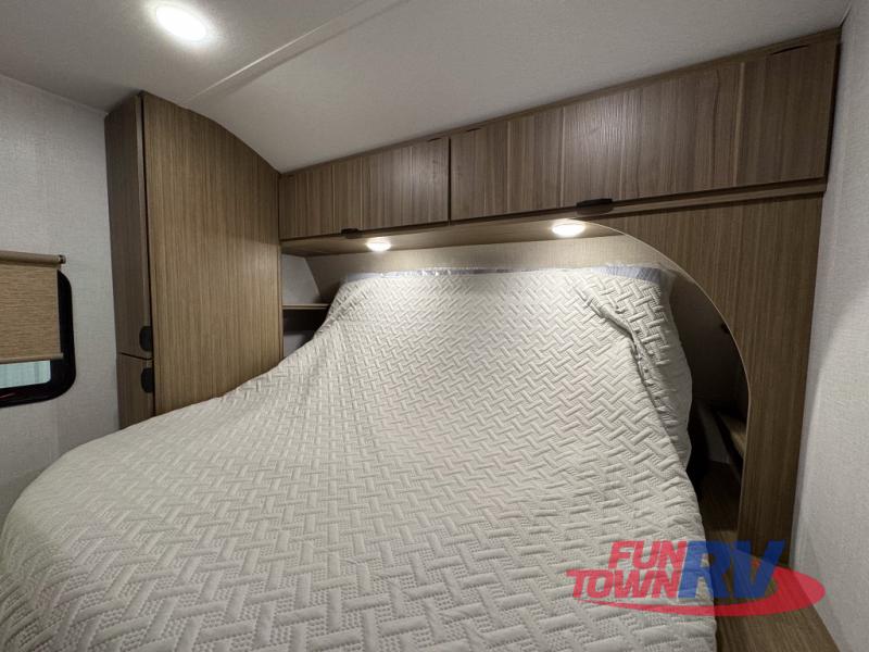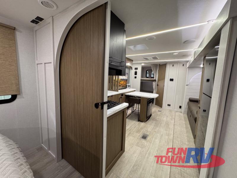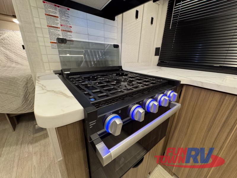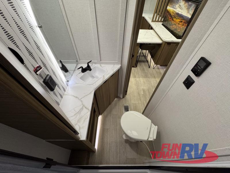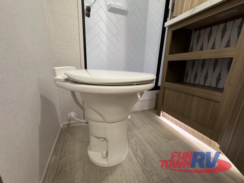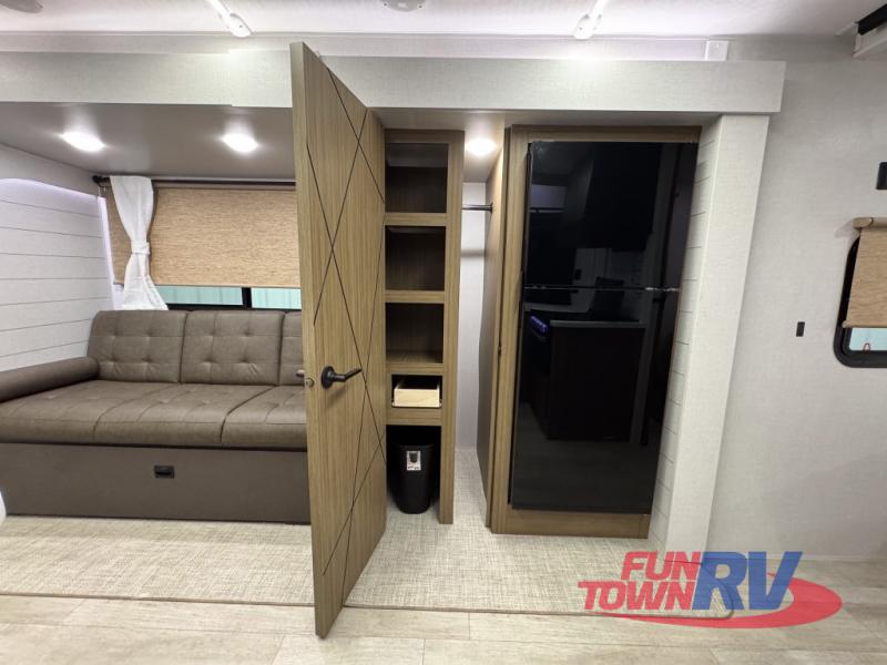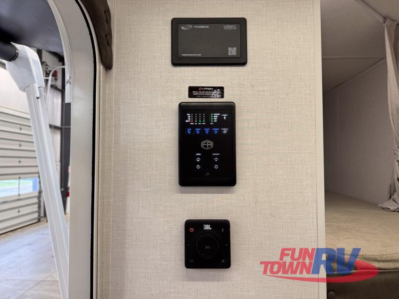 You can enjoy at-home comforts wherever you decide to camp in this travel trailer. The custom king bed with Versa Tilt includes dual shelves and a wardrobe so you can keep your space tidy. If you have a guest or two little ones, they can sleep on the jackknife sofa within the large slide out or on the double-size bunks right next to the full bath. Once you've made breakfast in the fully equipped kitchen, you can utilize the pull-out table to dine at. There is also a fireplace below the table, which will be perfect for cozy evenings indoors.