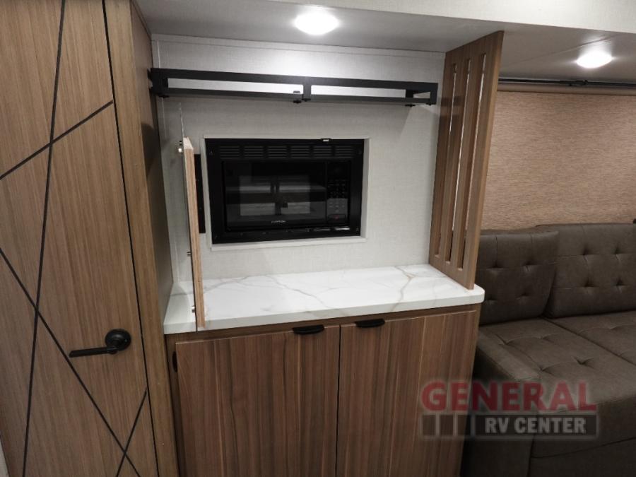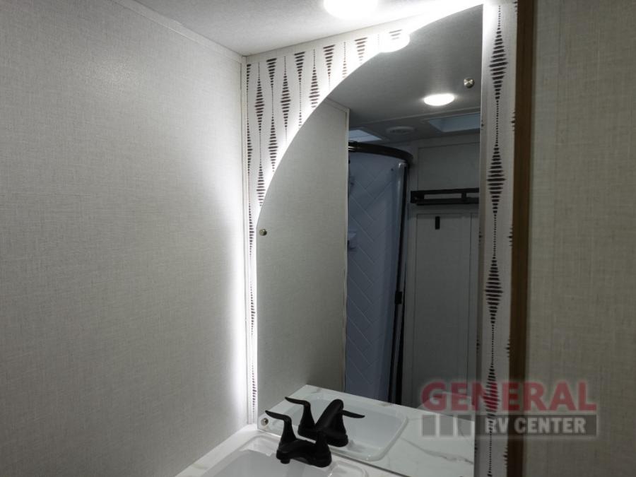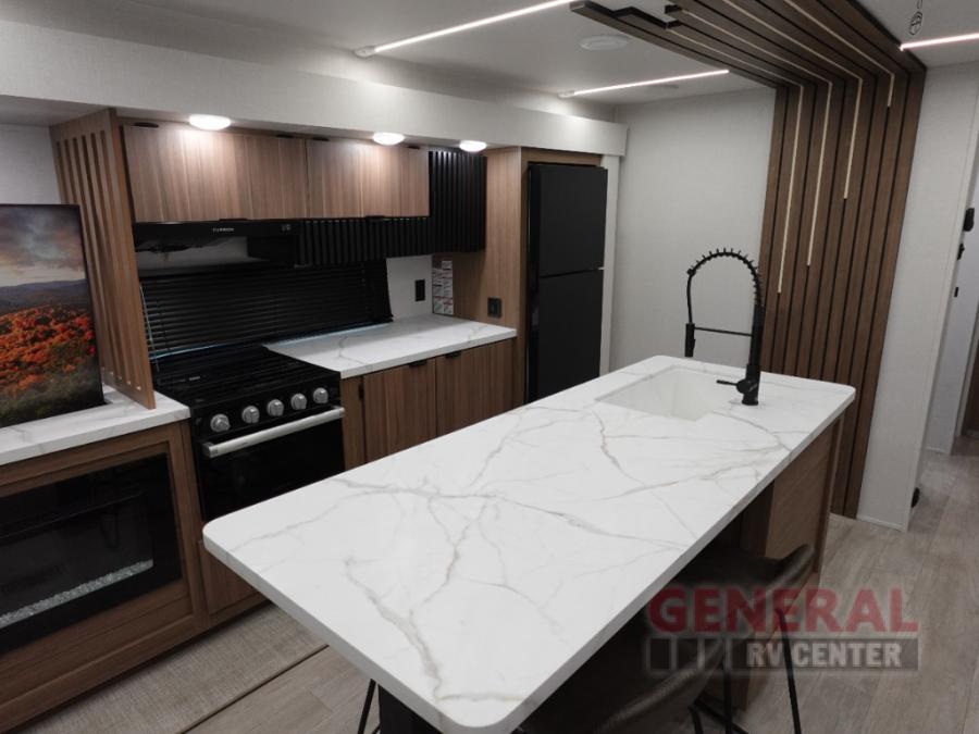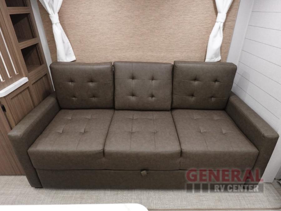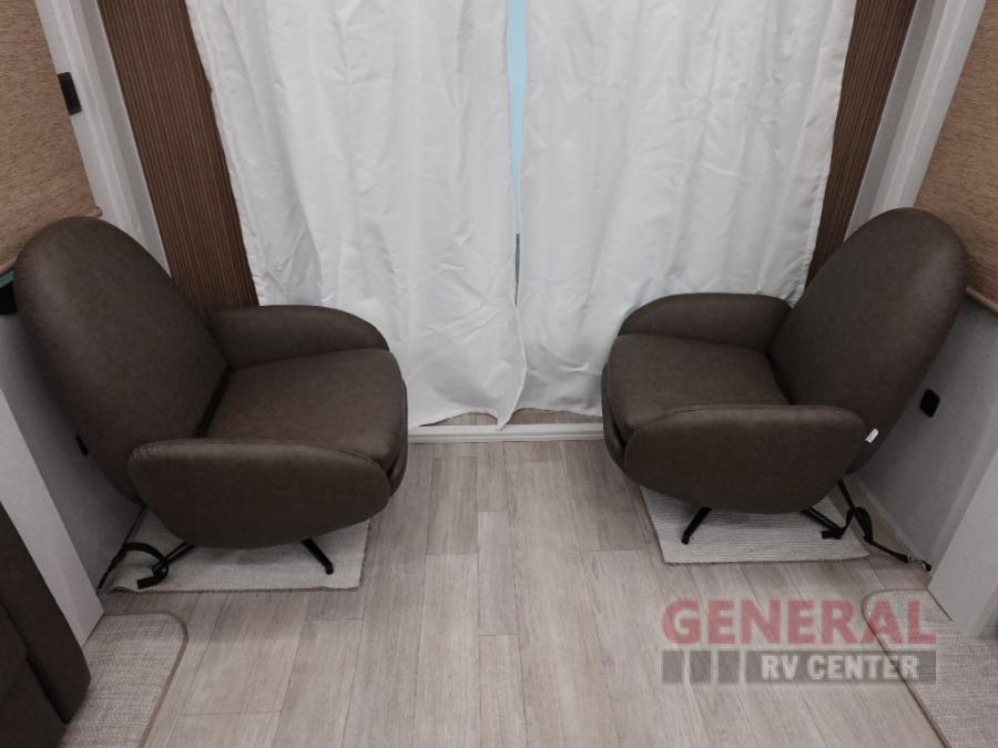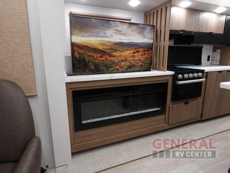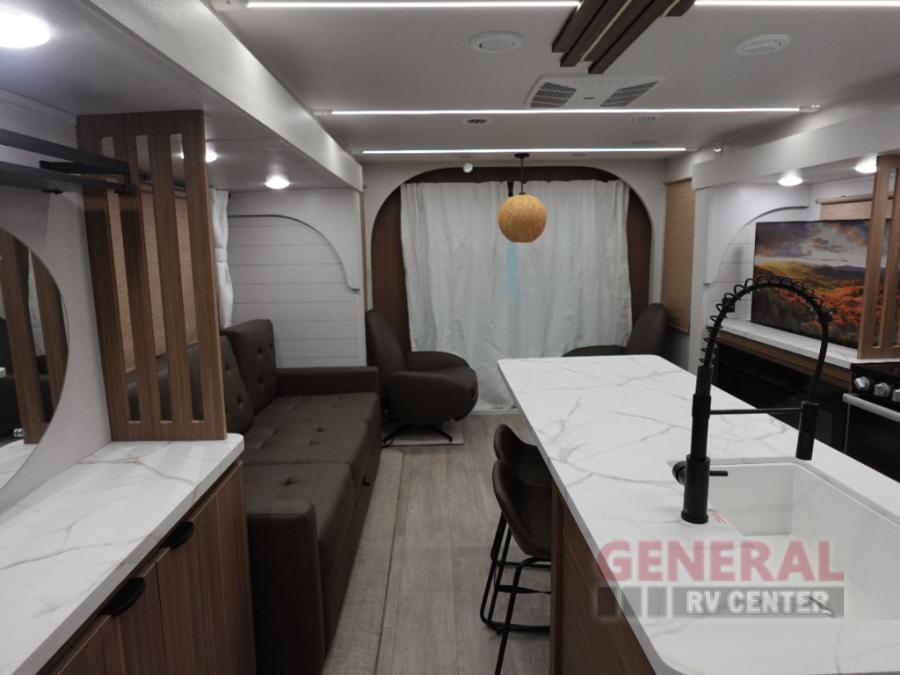 Find your zen int this spacious travel trailer for four! Once you've unloaded your gear, you can head inside to make lunch at the kitchen island with four chairs. An 80" trundle sofa provides additional seating space plus sleeping space for guests. You will love the rear custom recliners that are conveniently located next to the fireplace. The full bath is located towards the front next to the private bedroom so you can easily use the restroom at night, and you're sure to get a great night's rest on the custom king bed with Versa Tilt. This unit also includes washer and dryer prep, giving you the option to add these appliances.