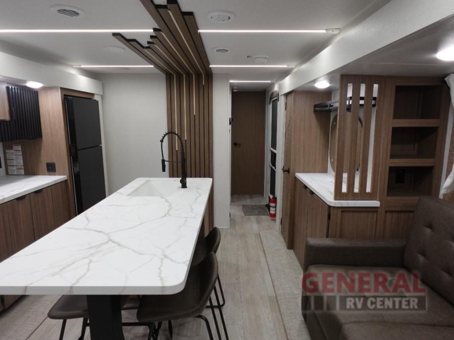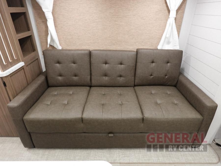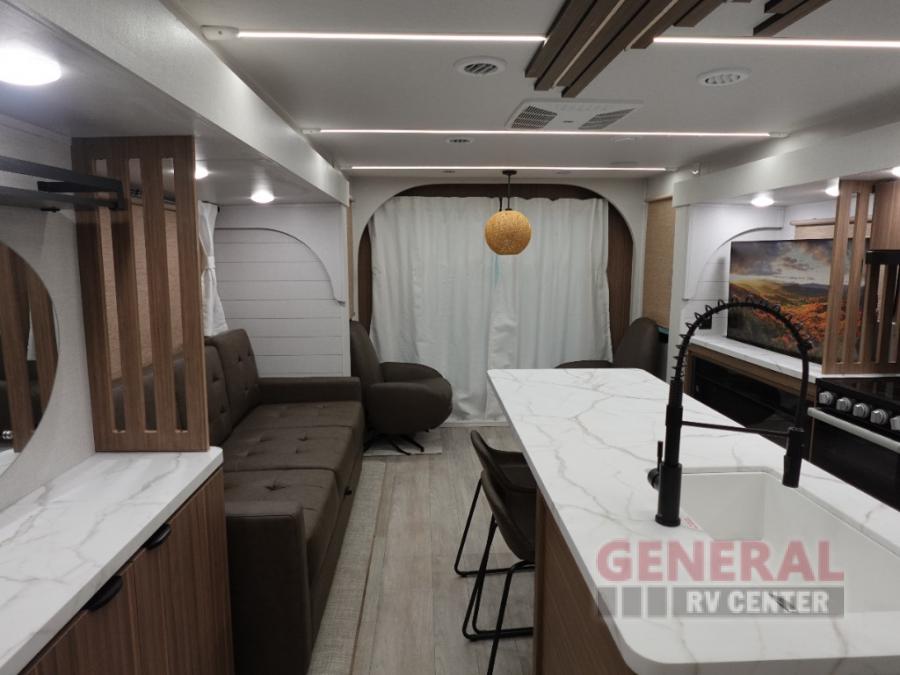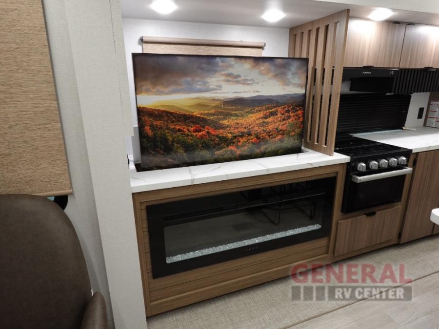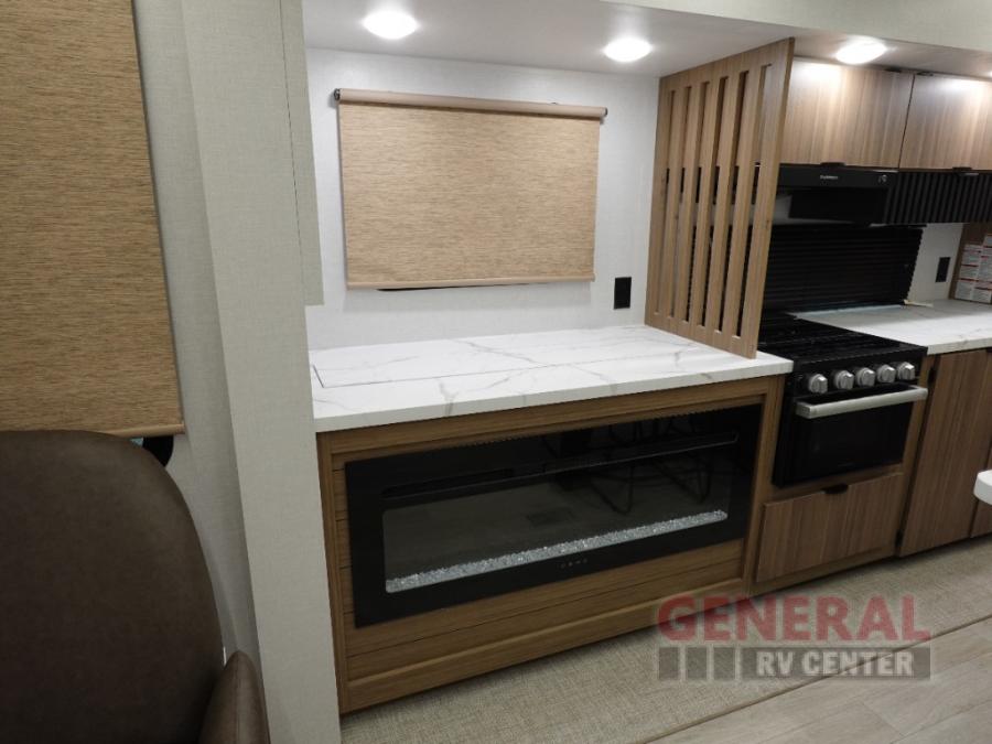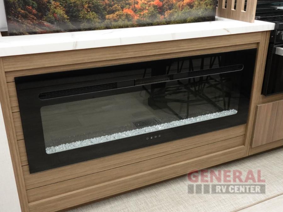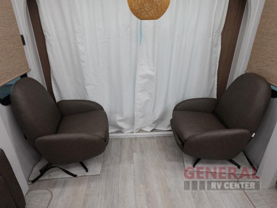 Find your zen int this spacious travel trailer for four! Once you've unloaded your gear, you can head inside to make lunch at the kitchen island with four chairs. An 80" trundle sofa provides additional seating space plus sleeping space for guests. You will love the rear custom recliners that are conveniently located next to the fireplace. The full bath is located towards the front next to the private bedroom so you can easily use the restroom at night, and you're sure to get a great night's rest on the custom king bed with Versa Tilt.