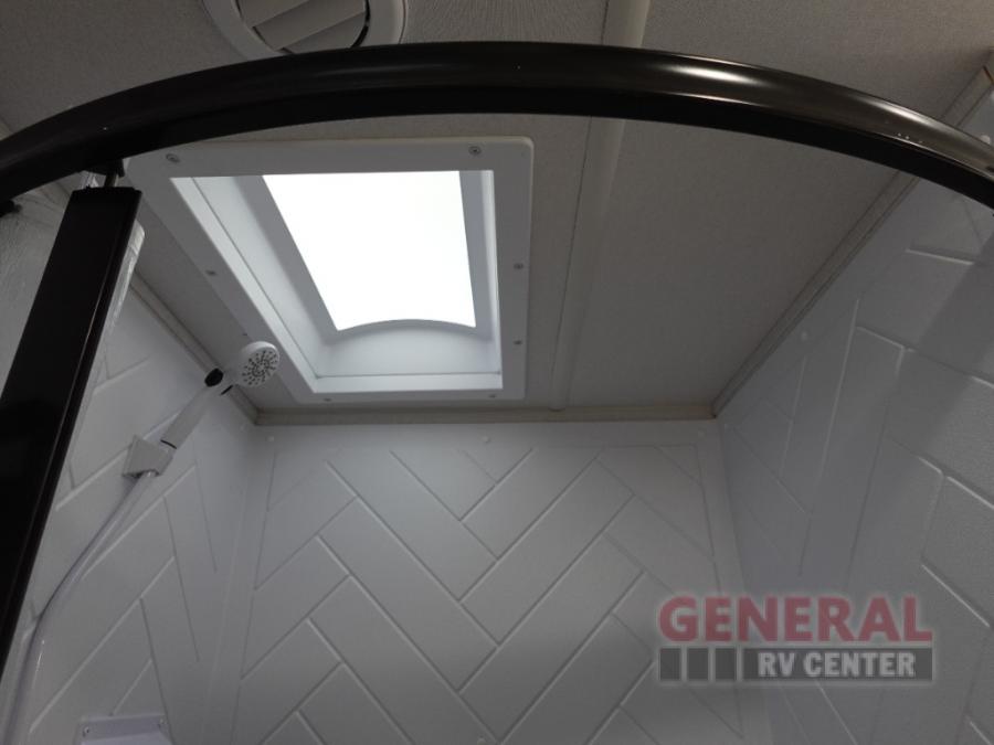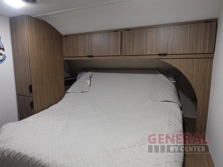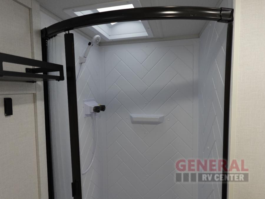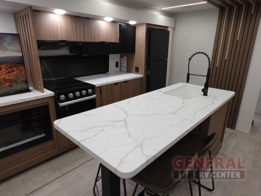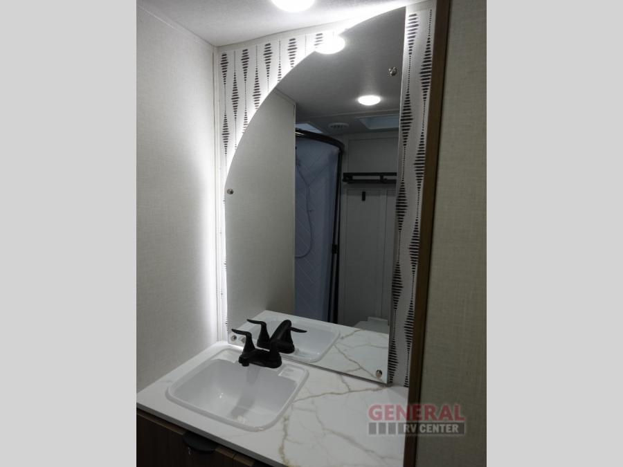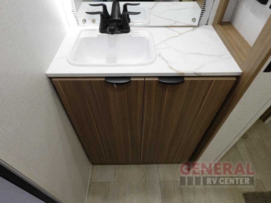 Find your zen int this spacious travel trailer for four! Once you've unloaded your gear, you can head inside to make lunch at the kitchen island with four chairs. An 80" trundle sofa provides additional seating space plus sleeping space for guests. You will love the rear custom recliners that are conveniently located next to the fireplace. The full bath is located towards the front next to the private bedroom so you can easily use the restroom at night, and you're sure to get a great night's rest on the custom king bed with Versa Tilt.