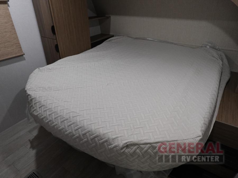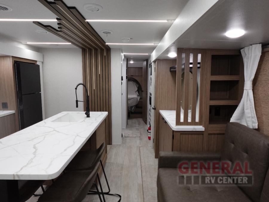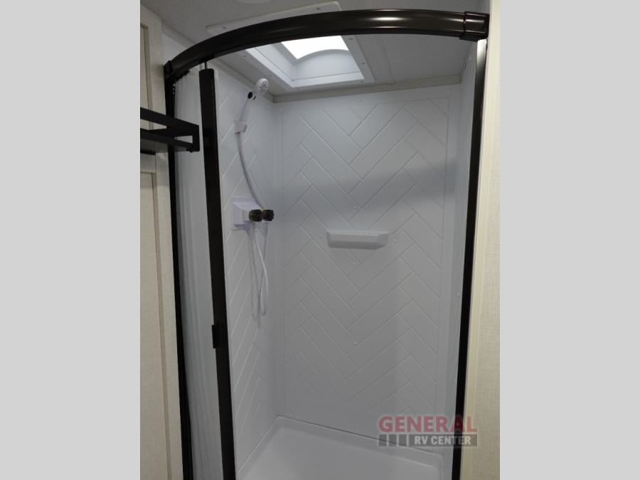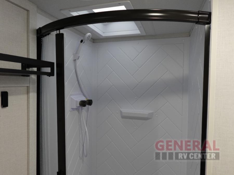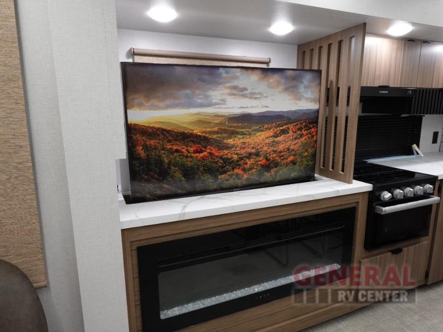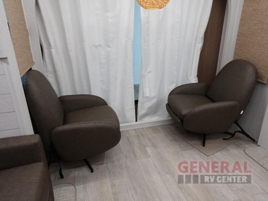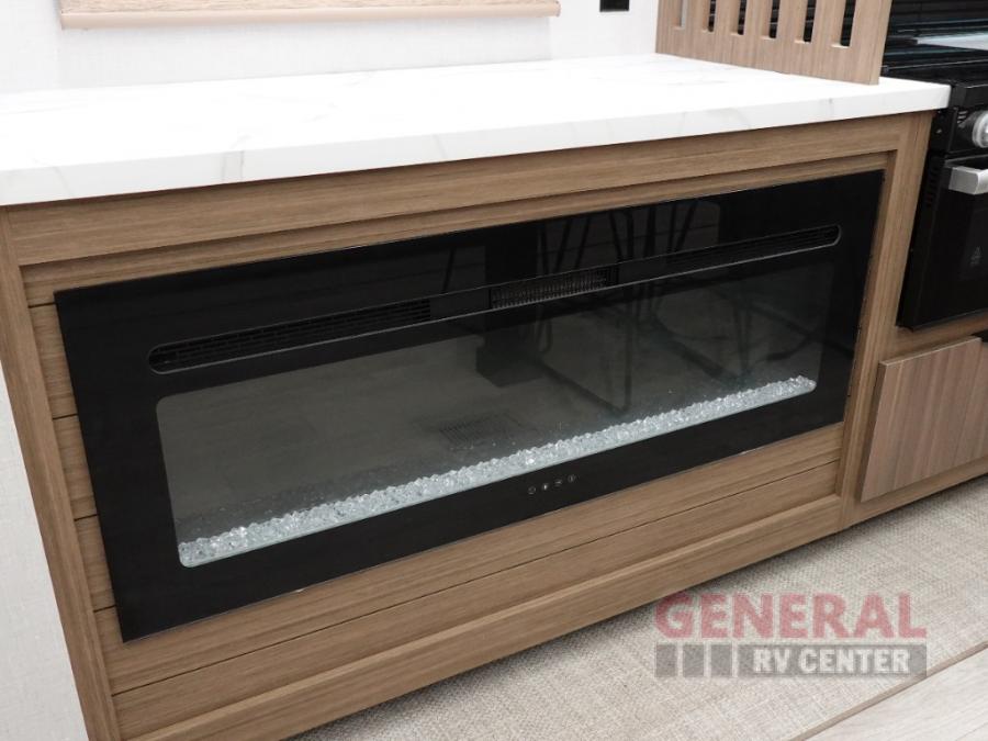 Find your zen int this spacious travel trailer for four! Once you've unloaded your gear, you can head inside to make lunch at the kitchen island with four chairs. An 80" trundle sofa provides additional seating space plus sleeping space for guests. You will love the rear custom recliners that are conveniently located next to the fireplace. The full bath is located towards the front next to the private bedroom so you can easily use the restroom at night, and you're sure to get a great night's rest on the custom king bed with Versa Tilt. This unit also includes washer and dryer prep, giving you the option to add these appliances.