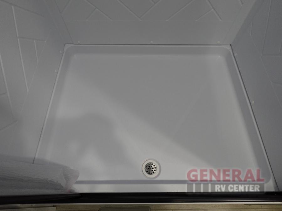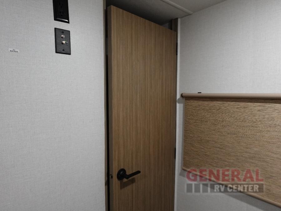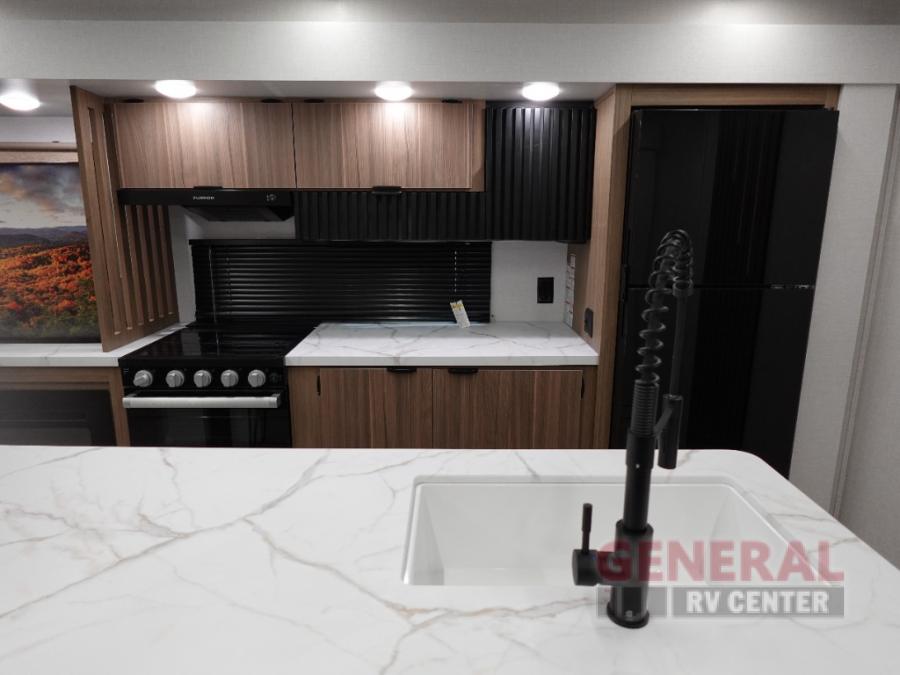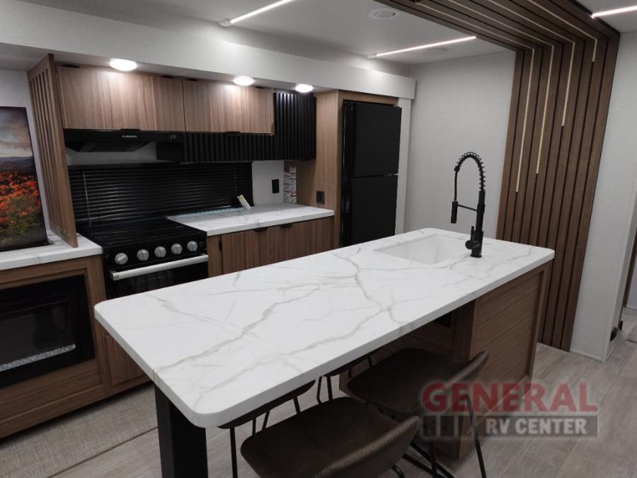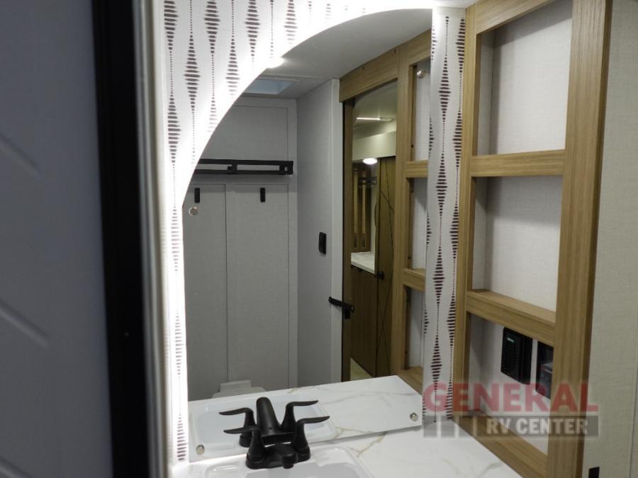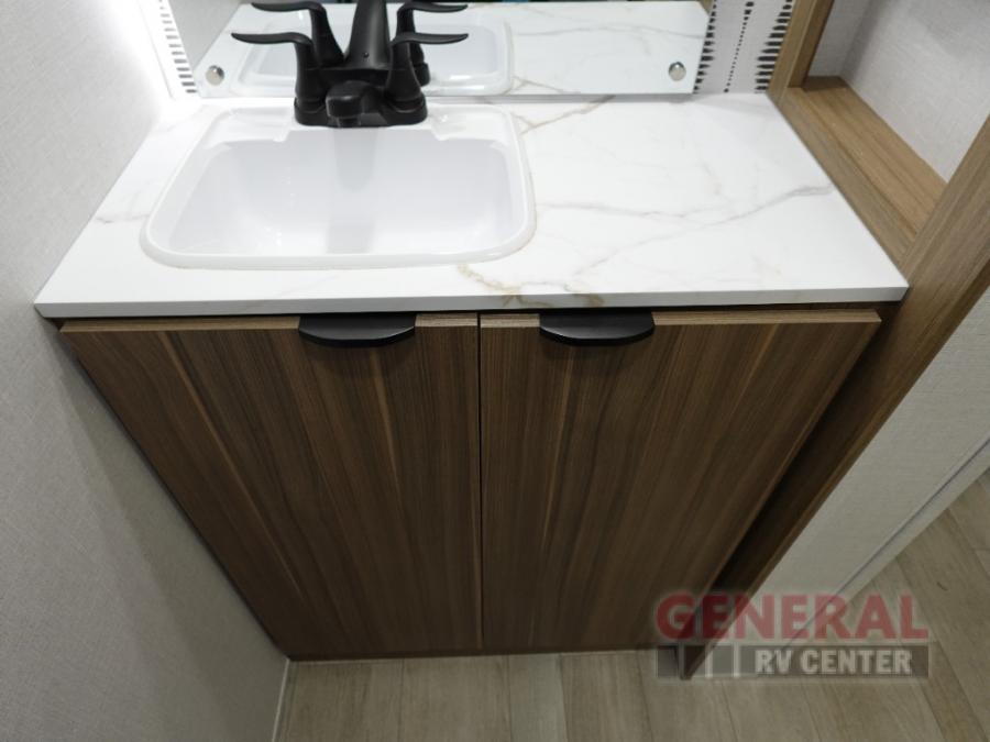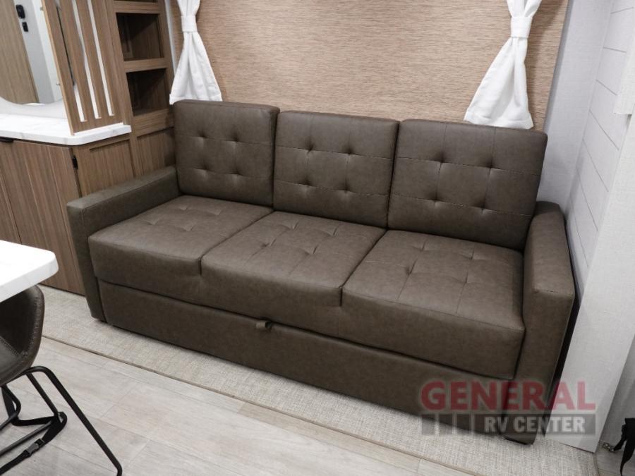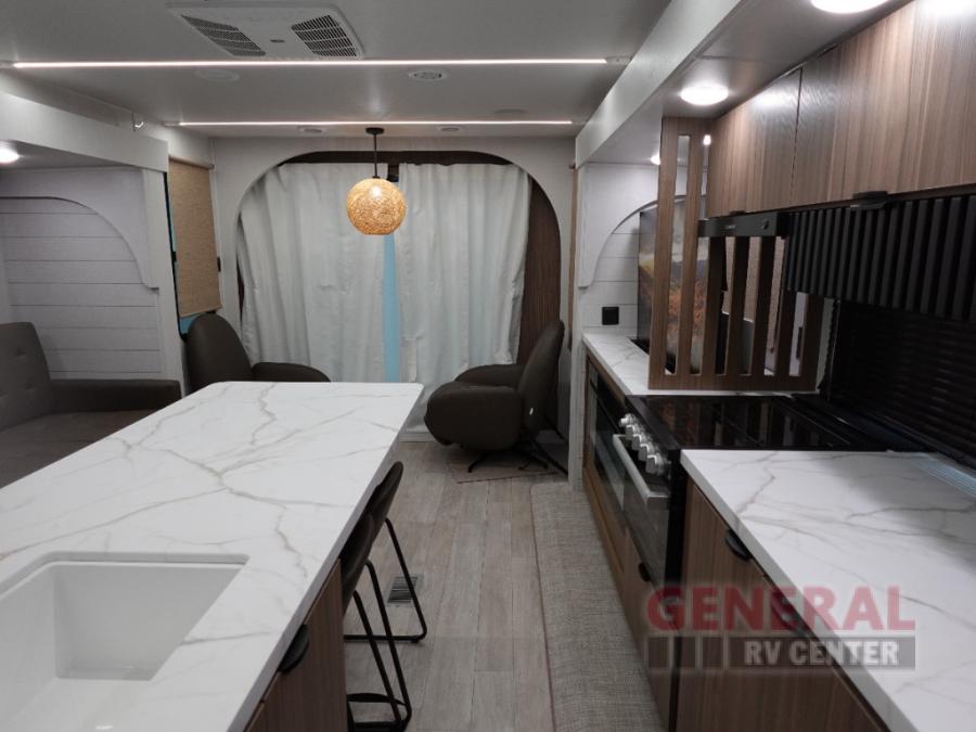 Find your zen int this spacious travel trailer for four! Once you've unloaded your gear, you can head inside to make lunch at the kitchen island with four chairs. An 80" trundle sofa provides additional seating space plus sleeping space for guests. You will love the rear custom recliners that are conveniently located next to the fireplace. The full bath is located towards the front next to the private bedroom so you can easily use the restroom at night, and you're sure to get a great night's rest on the custom king bed with Versa Tilt. This unit also includes washer and dryer prep, giving you the option to add these appliances.