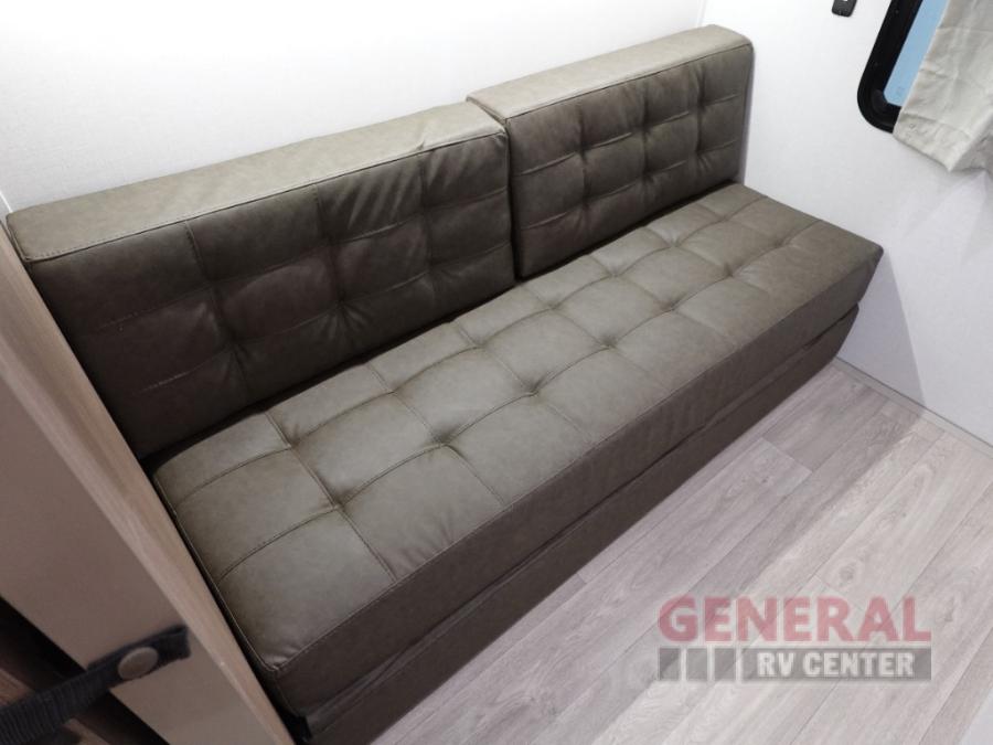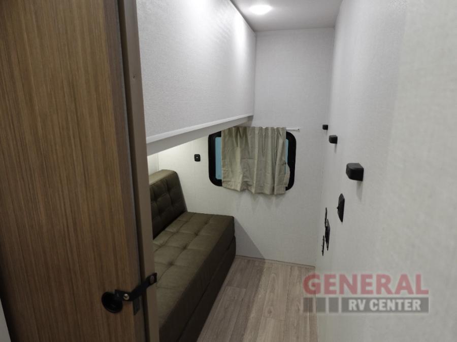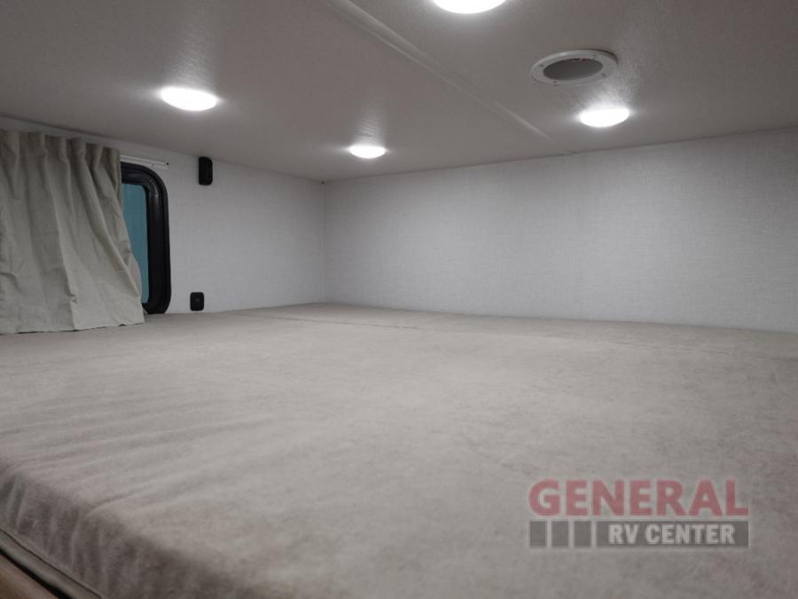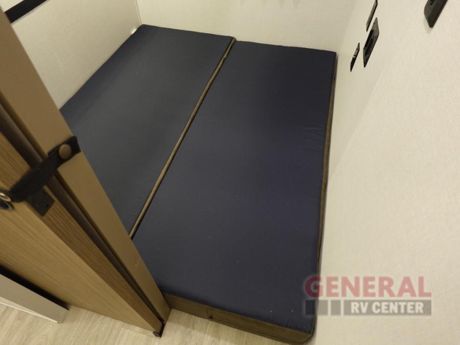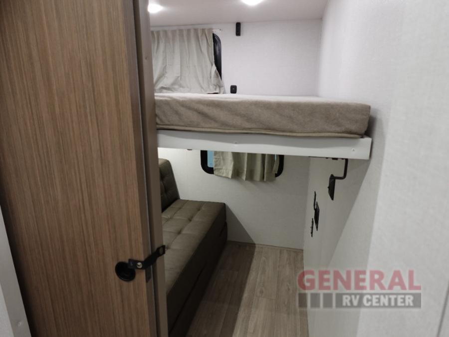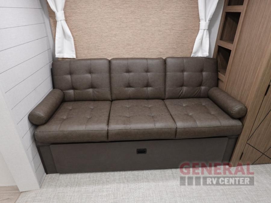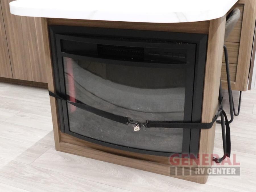 Everyone will enjoy having their own space in this travel trailer thanks to the front master bedroom and the rear bunkhouse. The bunkhouse includes a wall to separate the Versa bunk and fold-down desk on one side and a Versa sofa on the other, perfect for older kids or guests. You'll have the custom king bed with Versa Tilt all to yourselves, and the walk-thru bath will be easily accessible for everyone. In the combined kitchen and living room, a jackknife sofa slide sits across from the fireplace/entertainment center, and there is a pull-out table here so you can dine together.