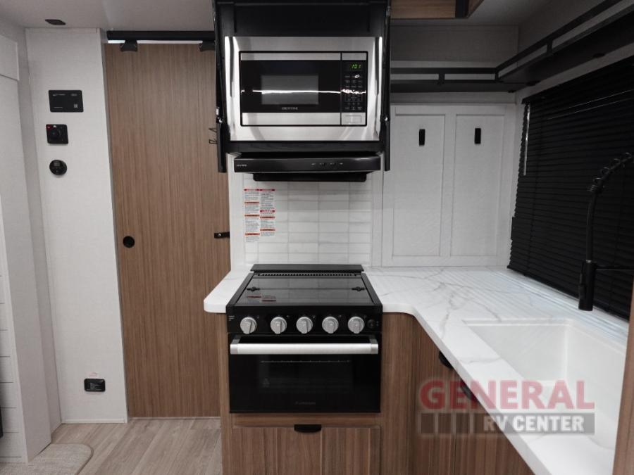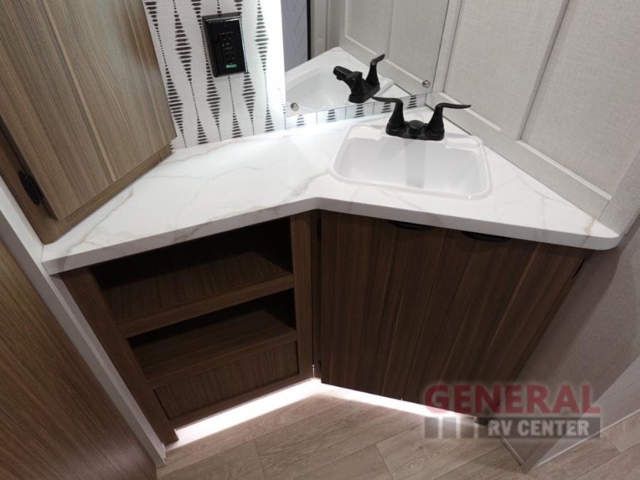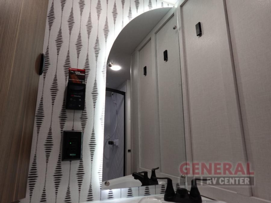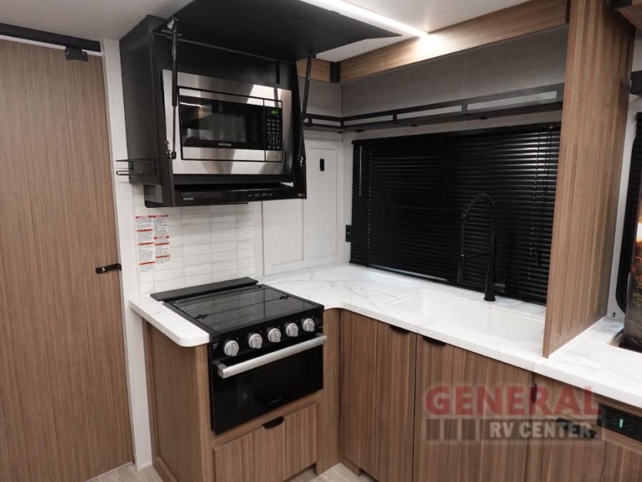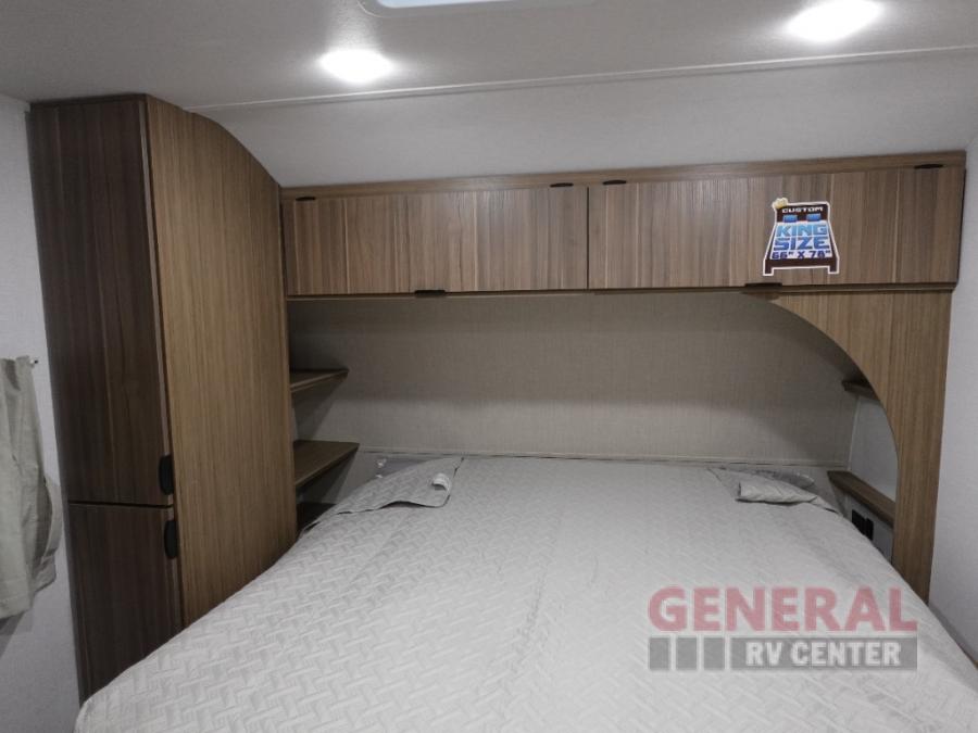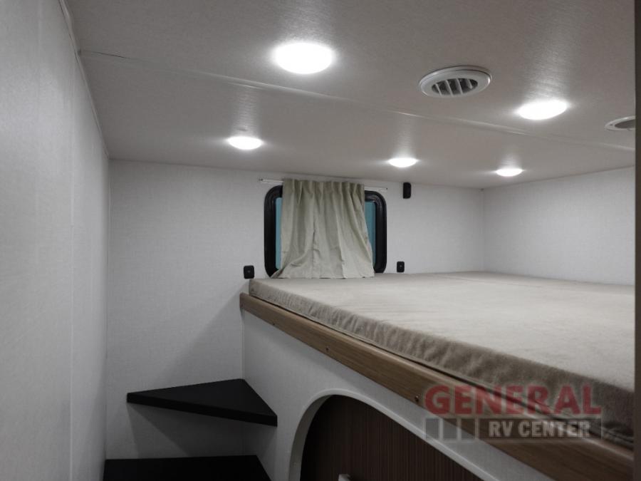 Everyone will enjoy having their own space in this travel trailer thanks to the front master bedroom and the rear bunkhouse. The bunkhouse includes a wall to separate the Versa bunk and fold-down desk on one side and a Versa sofa on the other, perfect for older kids or guests. You'll have the custom king bed with Versa Tilt all to yourselves, and the walk-thru bath will be easily accessible for everyone. In the combined kitchen and living room, a jackknife sofa slide sits across from the fireplace/entertainment center, and there is a pull-out table here so you can dine together.
