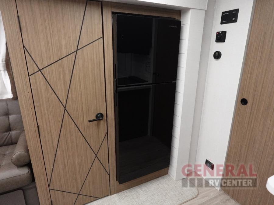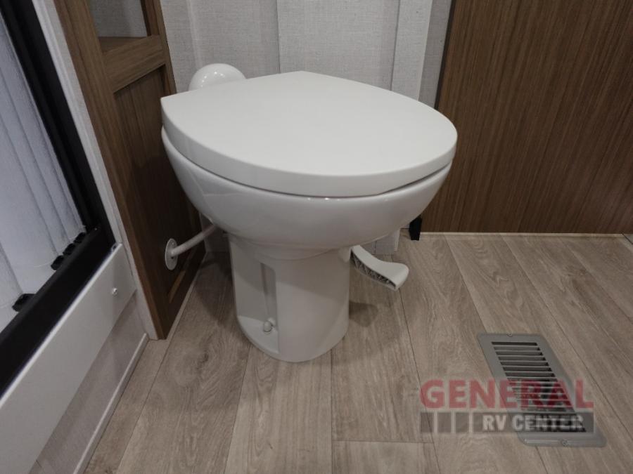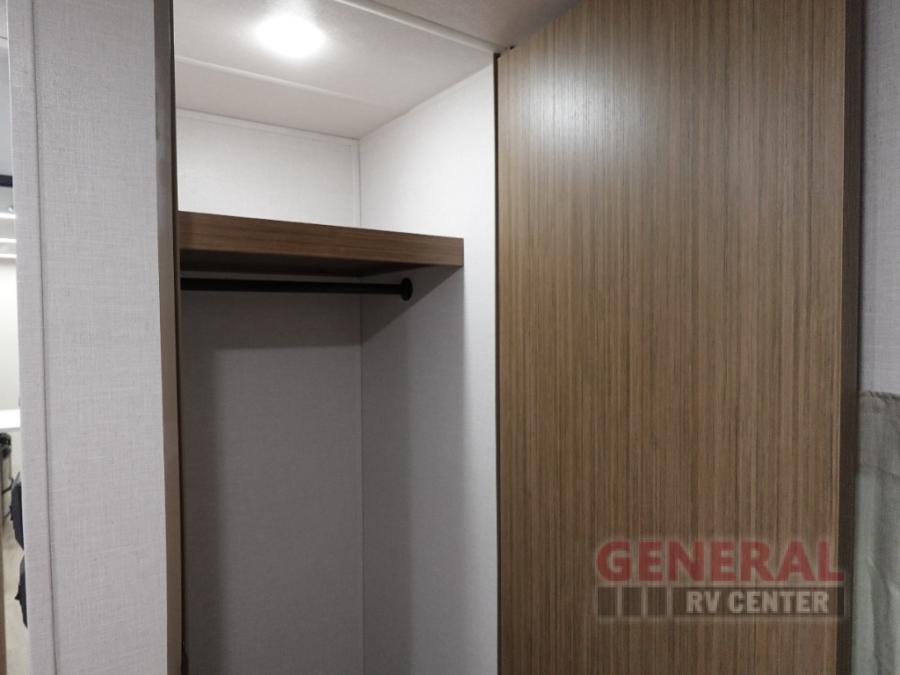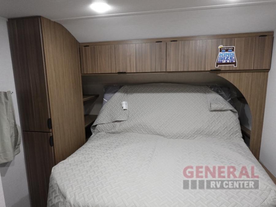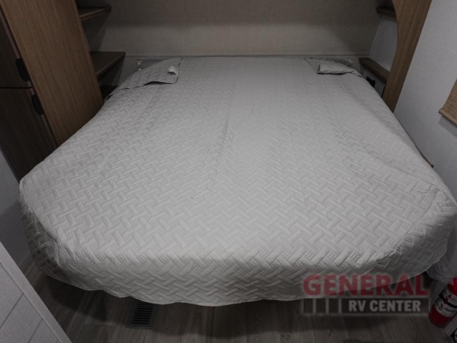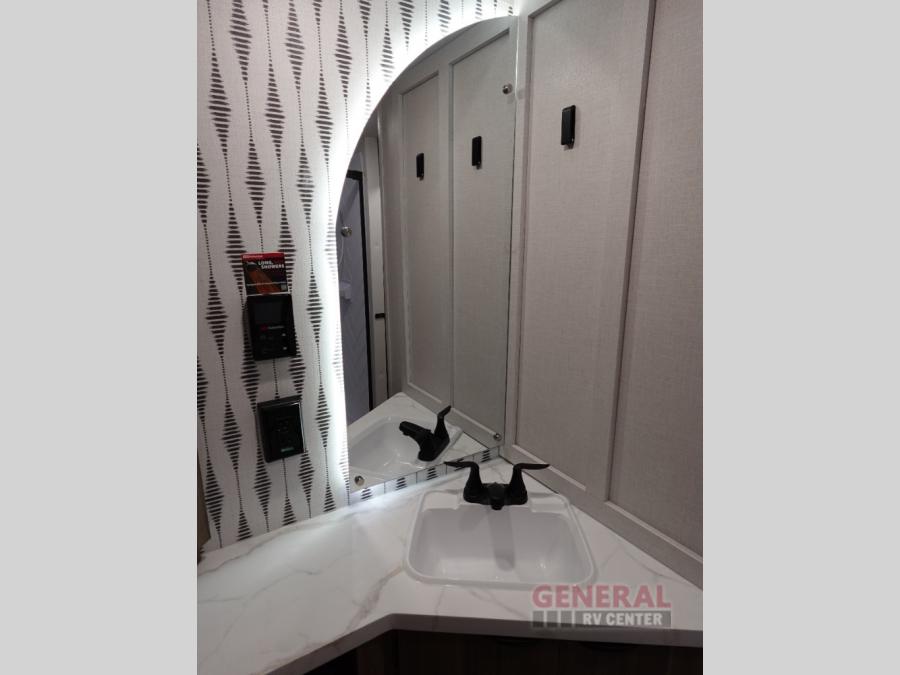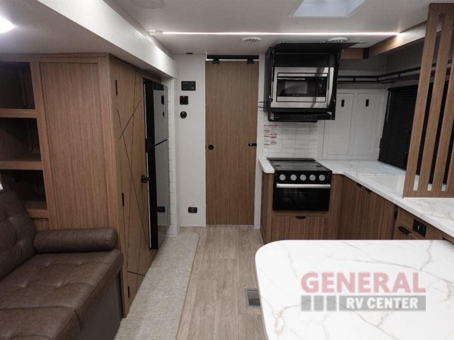 Everyone will enjoy having their own space in this travel trailer thanks to the front master bedroom and the rear bunkhouse. The bunkhouse includes a wall to separate the Versa bunk and fold-down desk on one side and a Versa sofa on the other, perfect for older kids or guests. You'll have the custom king bed with Versa Tilt all to yourselves, and the walk-thru bath will be easily accessible for everyone. In the combined kitchen and living room, a jackknife sofa slide sits across from the fireplace/entertainment center, and there is a pull-out table here so you can dine together.