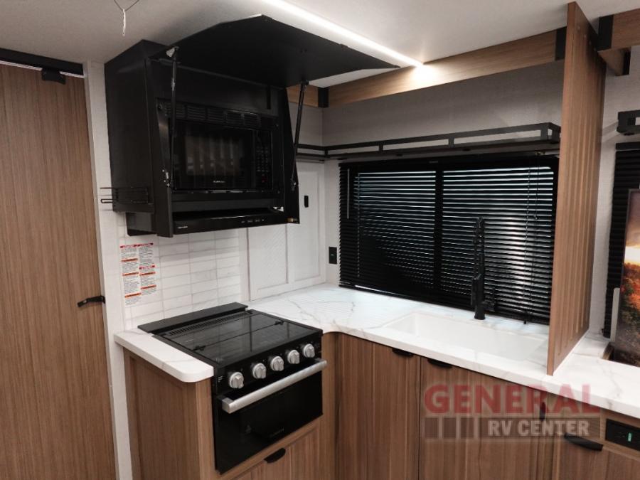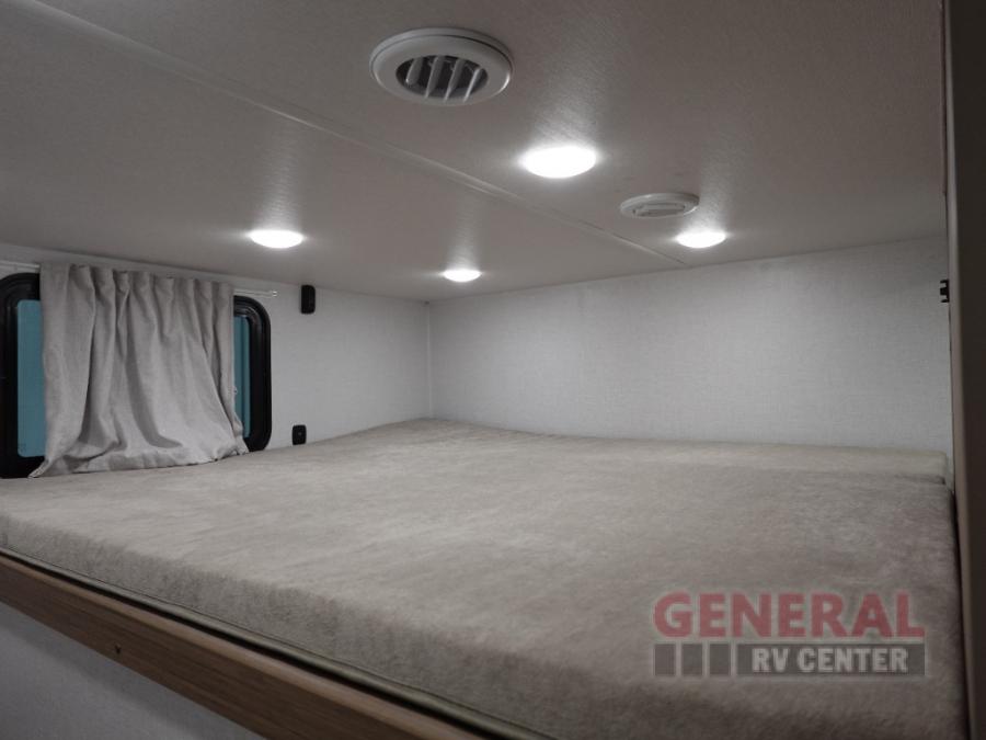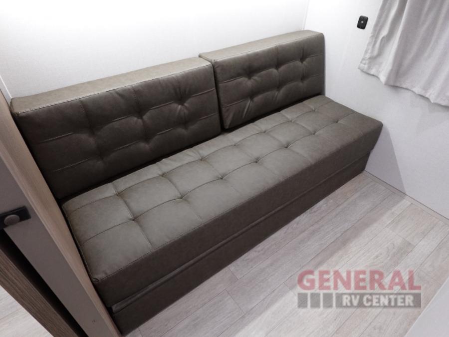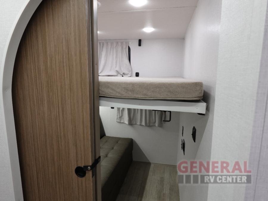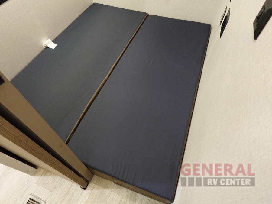 Everyone will enjoy having their own space in this travel trailer thanks to the front master bedroom and the rear bunkhouse. The bunkhouse includes a wall to separate the Versa bunk and fold-down desk on one side and a Versa sofa on the other, perfect for older kids or guests. You'll have the custom king bed with Versa Tilt all to yourselves, and the walk-thru bath will be easily accessible for everyone. In the combined kitchen and living room, a jackknife sofa slide sits across from the fireplace/entertainment center, and there is a pull-out table here so you can dine together.