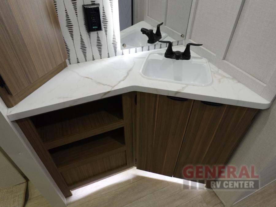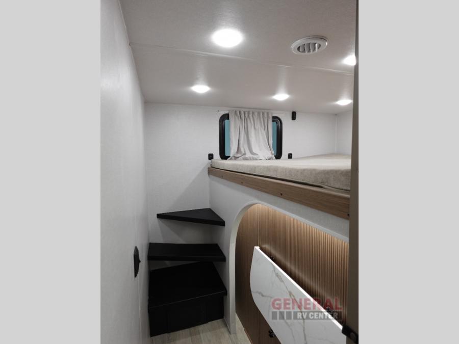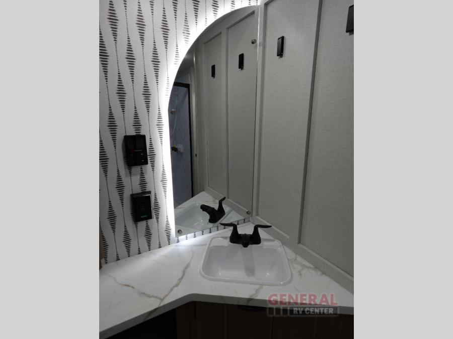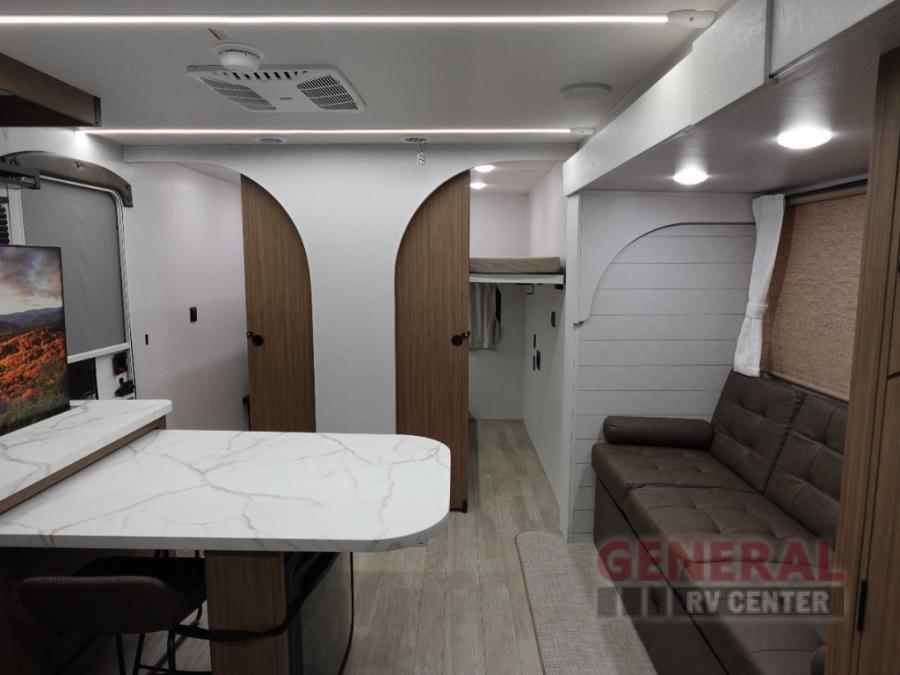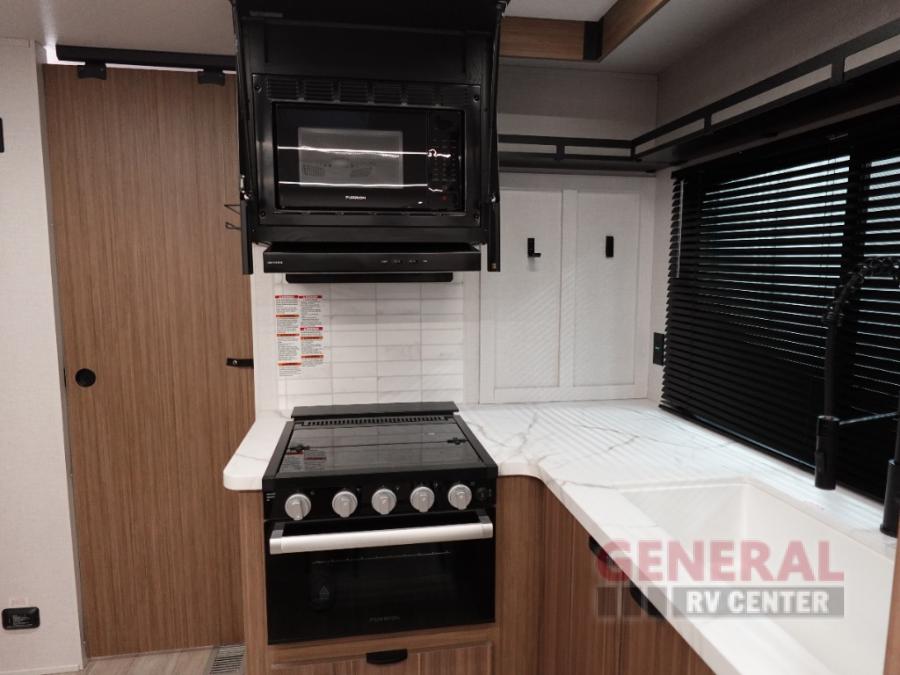 Everyone will enjoy having their own space in this travel trailer thanks to the front master bedroom and the rear bunkhouse. The bunkhouse includes a wall to separate the Versa bunk and fold-down desk on one side and a Versa sofa on the other, perfect for older kids or guests. You'll have the custom king bed with Versa Tilt all to yourselves, and the walk-thru bath will be easily accessible for everyone. In the combined kitchen and living room, a jackknife sofa slide sits across from the fireplace/entertainment center, and there is a pull-out table here so you can dine together.