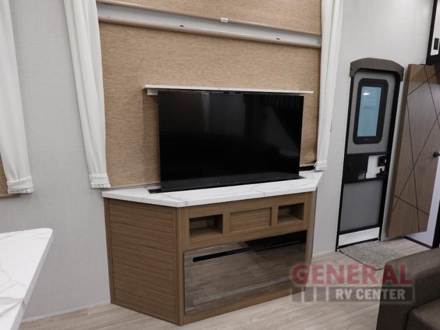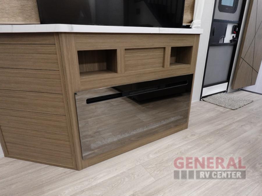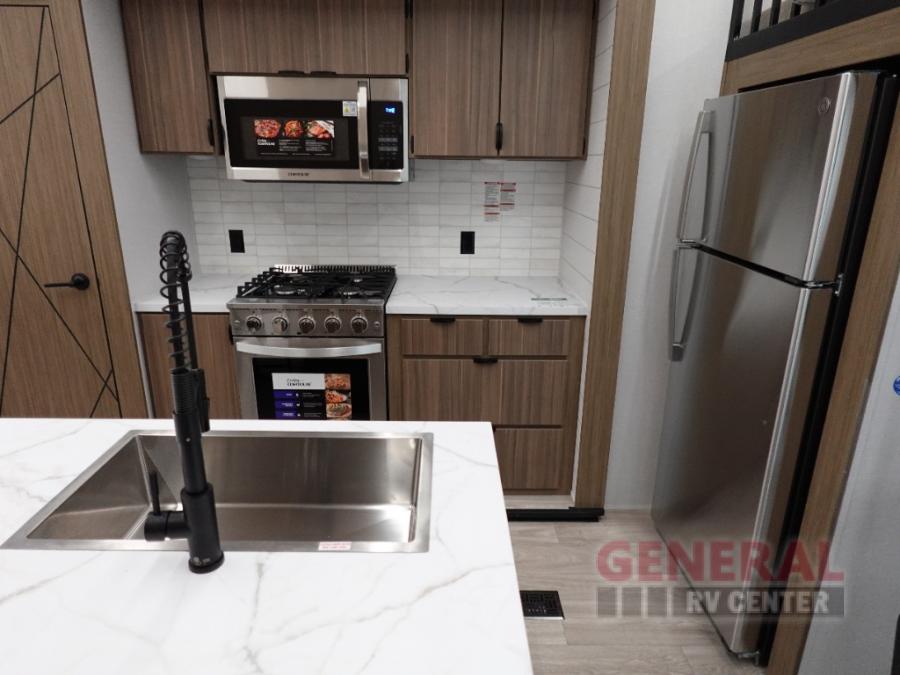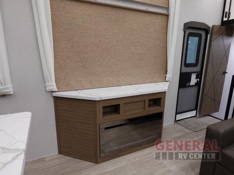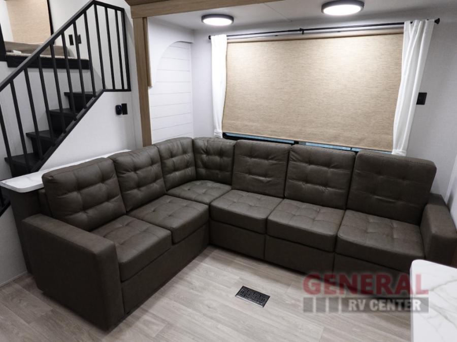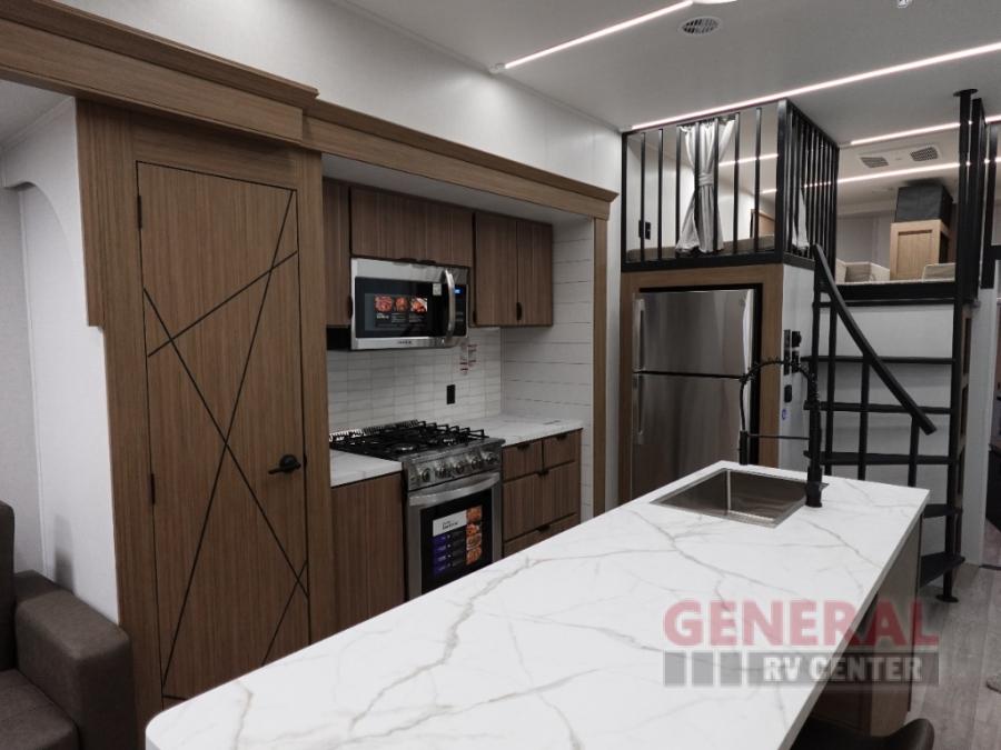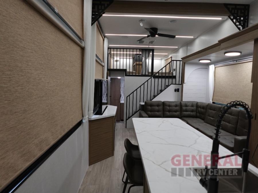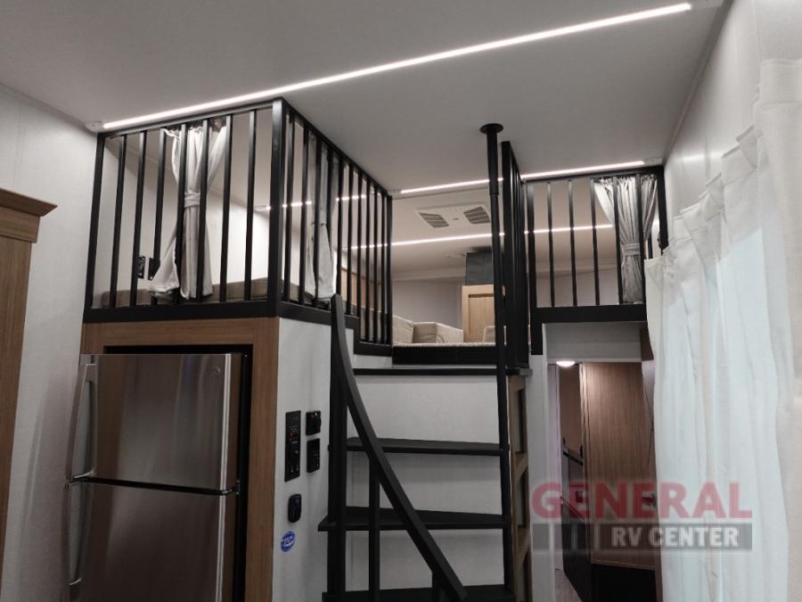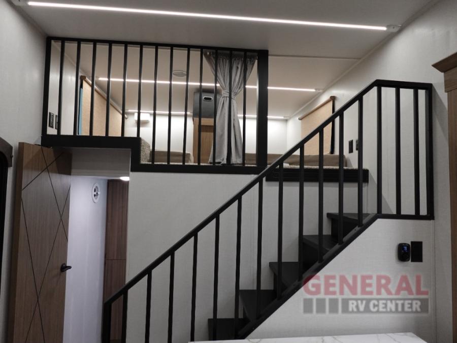 Indulge in the ultimate getaway experience with our opulent destination trailer. The lavish rear bathroom features a spacious walk-in shower, ideal for rejuvenating after a long day. In the living area, the plush sectional sofa is a hub for socializing and relaxation, while the entertainment center with a fireplace creates a warm and inviting ambiance. The kitchen is equipped with a pantry, an elegant kitchen island with stools, and ample overhead cabinets, making meal prep and dining a true delight. Additionally, the spacious side-by-side refrigerator offers ample storage for your favorite foods and beverages. The majestic front bedroom is a serene retreat, featuring a sumptuous king bed with versa VersaTilt, a stylish dresser, and generous storage space. The charming loft is the cherry on top, perfect for kids or adults alike, with four cozy bunk mats and spiral steps leading up to a peaceful sleeping nook.