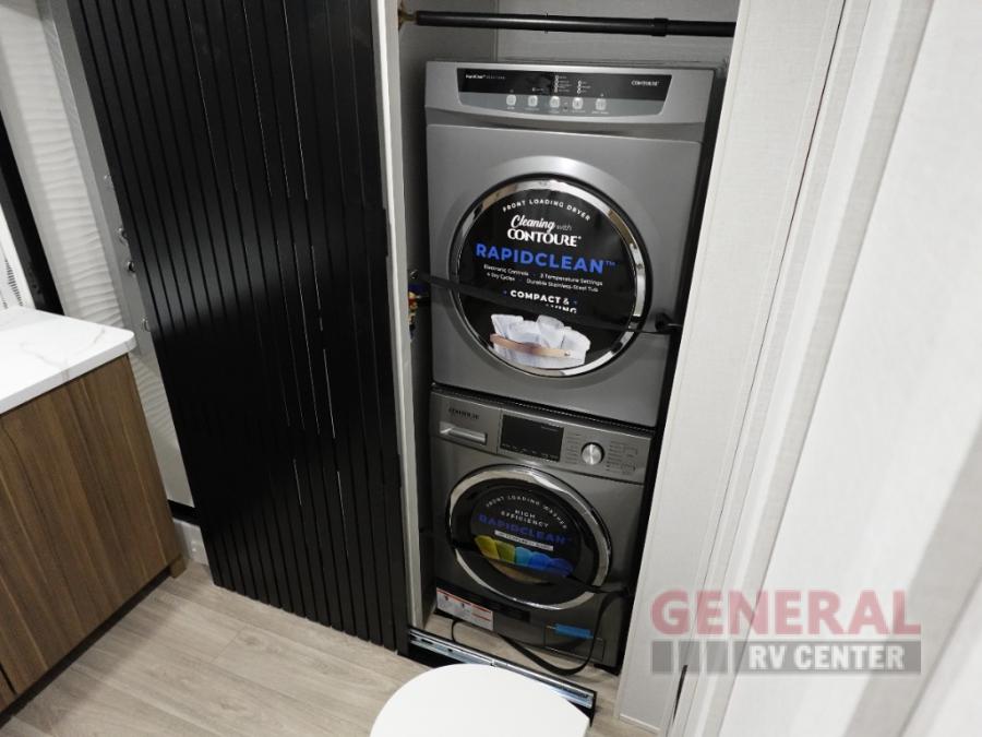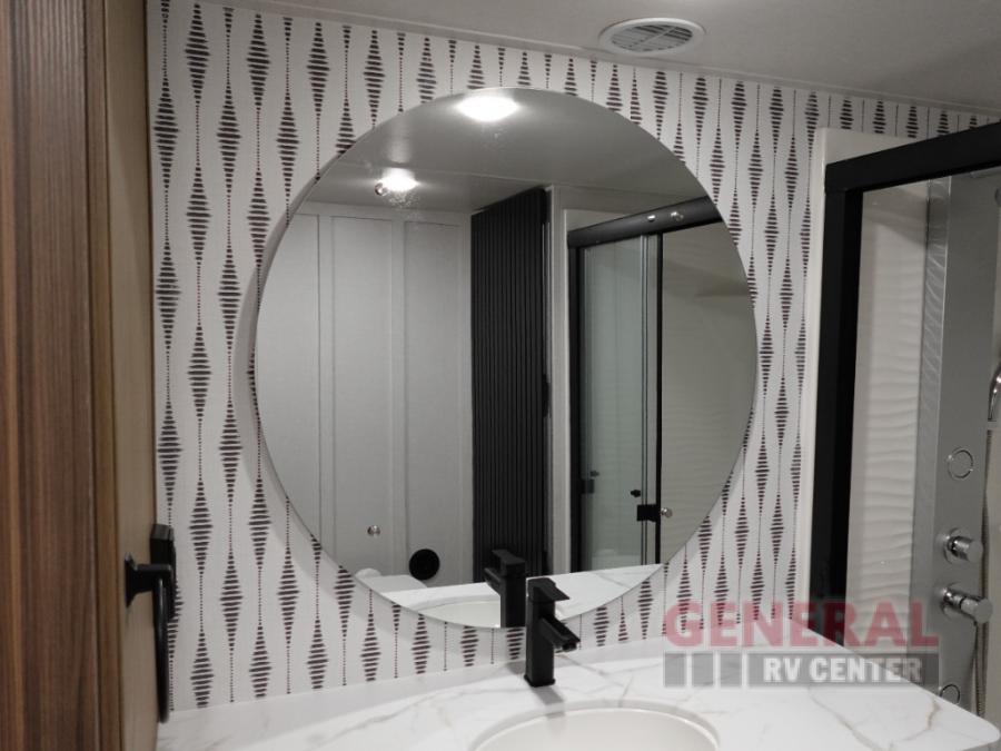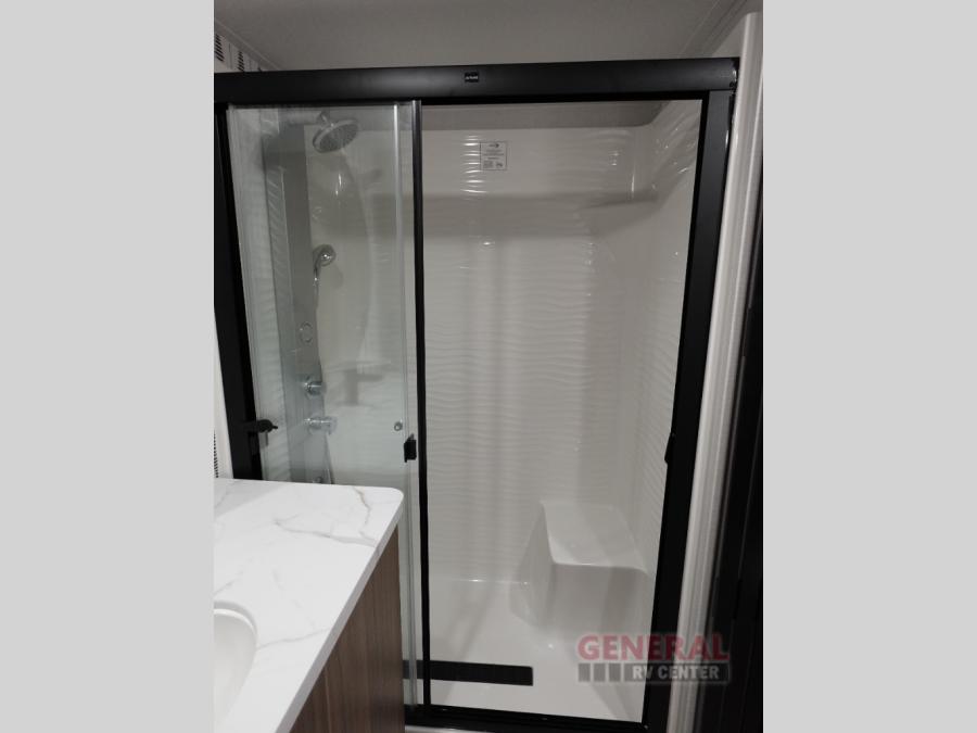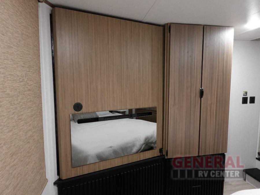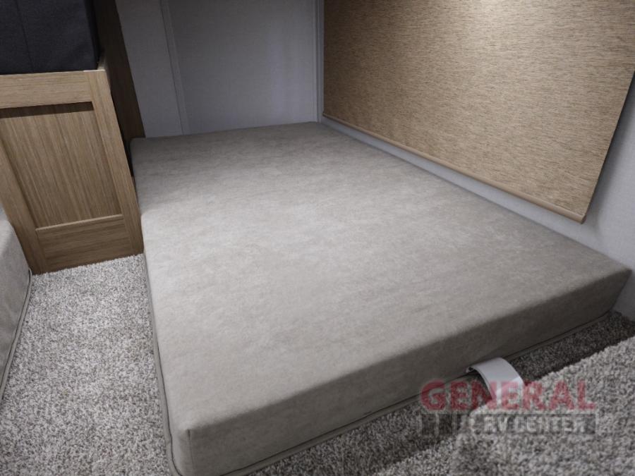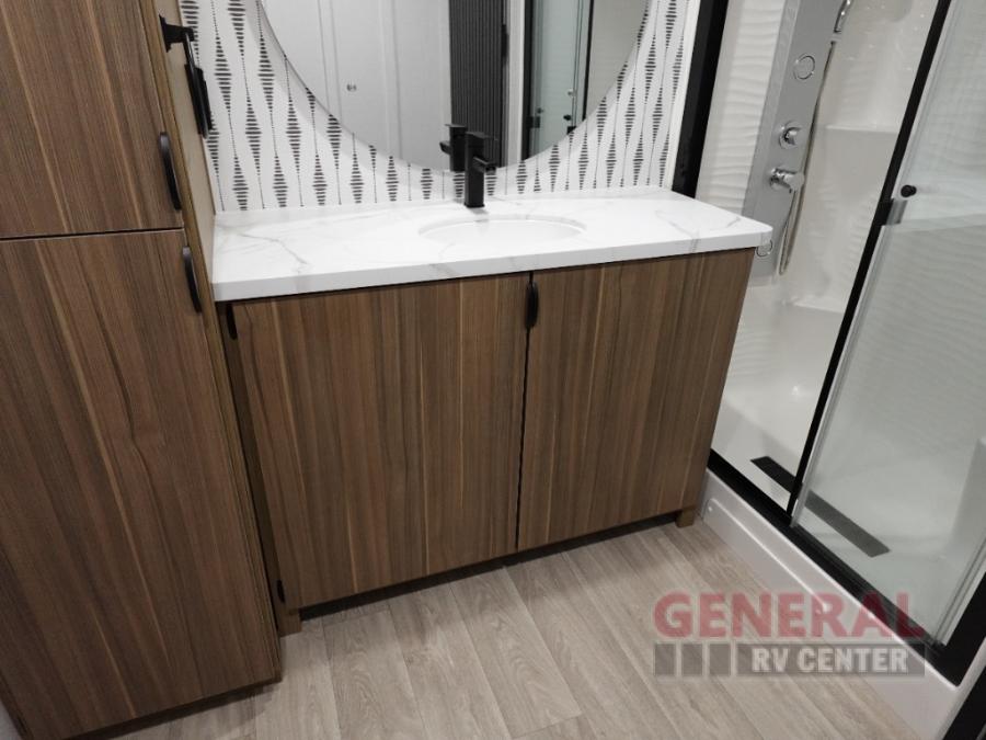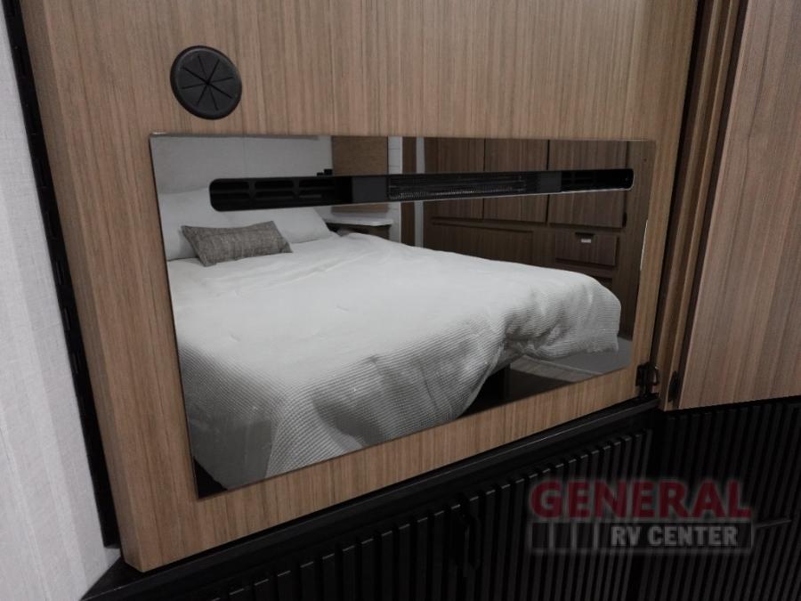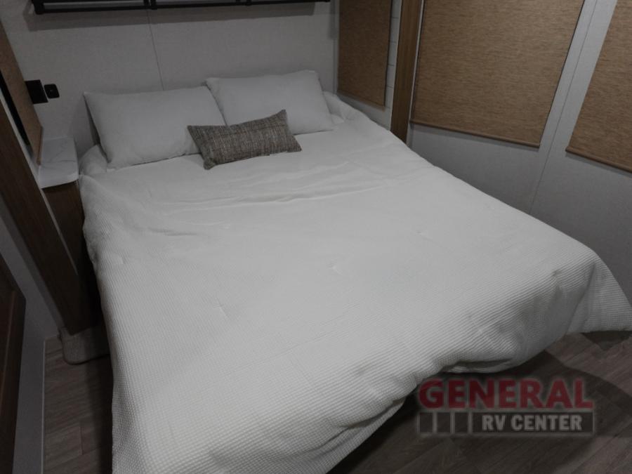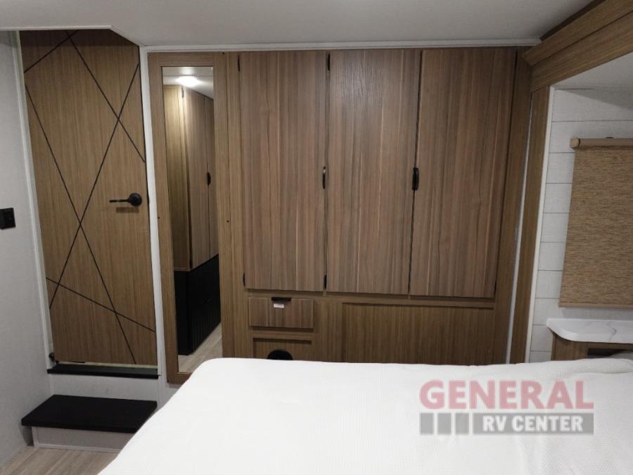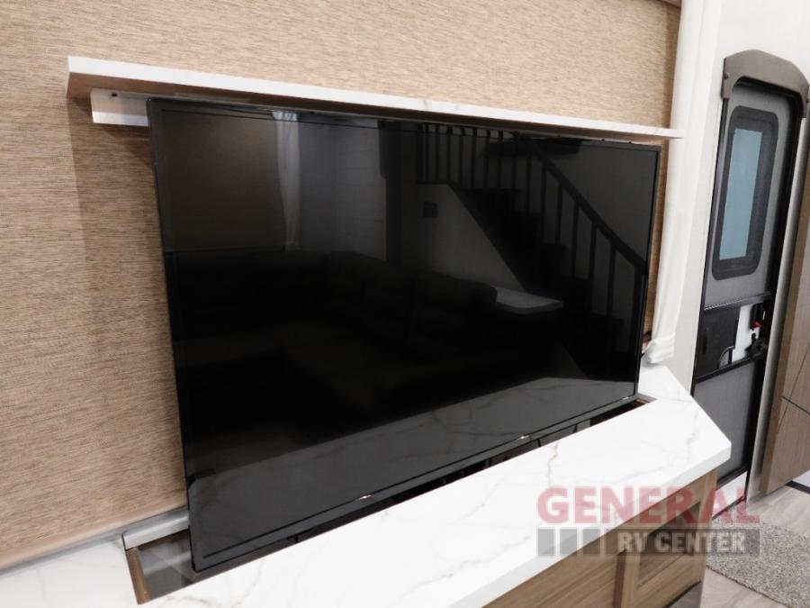 Indulge in the ultimate getaway experience with our opulent destination trailer. The lavish rear bathroom features a spacious walk-in shower, ideal for rejuvenating after a long day. In the living area, the plush sectional sofa is a hub for socializing and relaxation, while the entertainment center with a fireplace creates a warm and inviting ambiance. The kitchen is equipped with a pantry, an elegant kitchen island with stools, and ample overhead cabinets, making meal prep and dining a true delight. Additionally, the spacious side-by-side refrigerator offers ample storage for your favorite foods and beverages. The majestic front bedroom is a serene retreat, featuring a sumptuous king bed with versa VersaTilt, a stylish dresser, and generous storage space. The charming loft is the cherry on top, perfect for kids or adults alike, with four cozy bunk mats and spiral steps leading up to a peaceful sleeping nook.