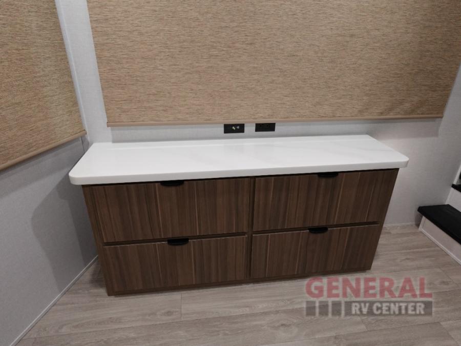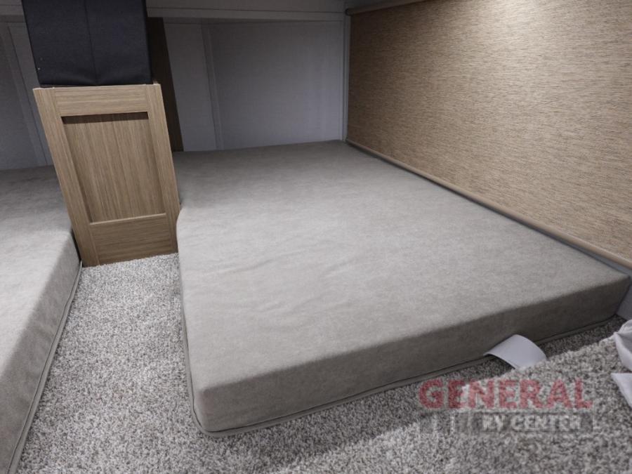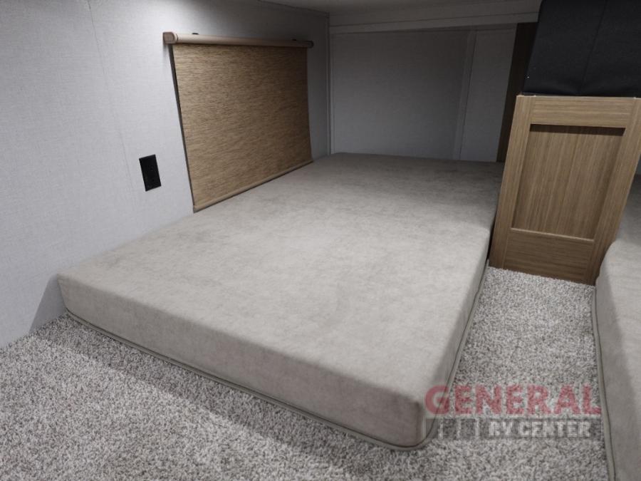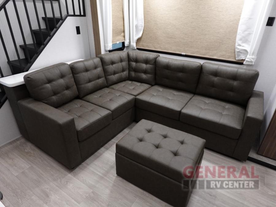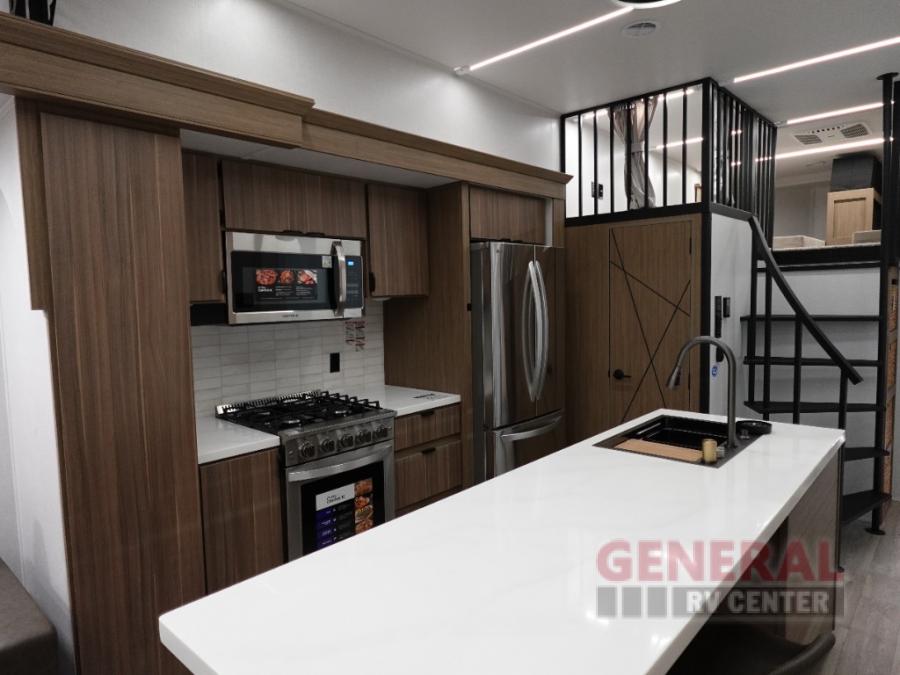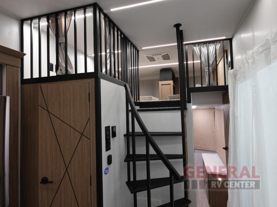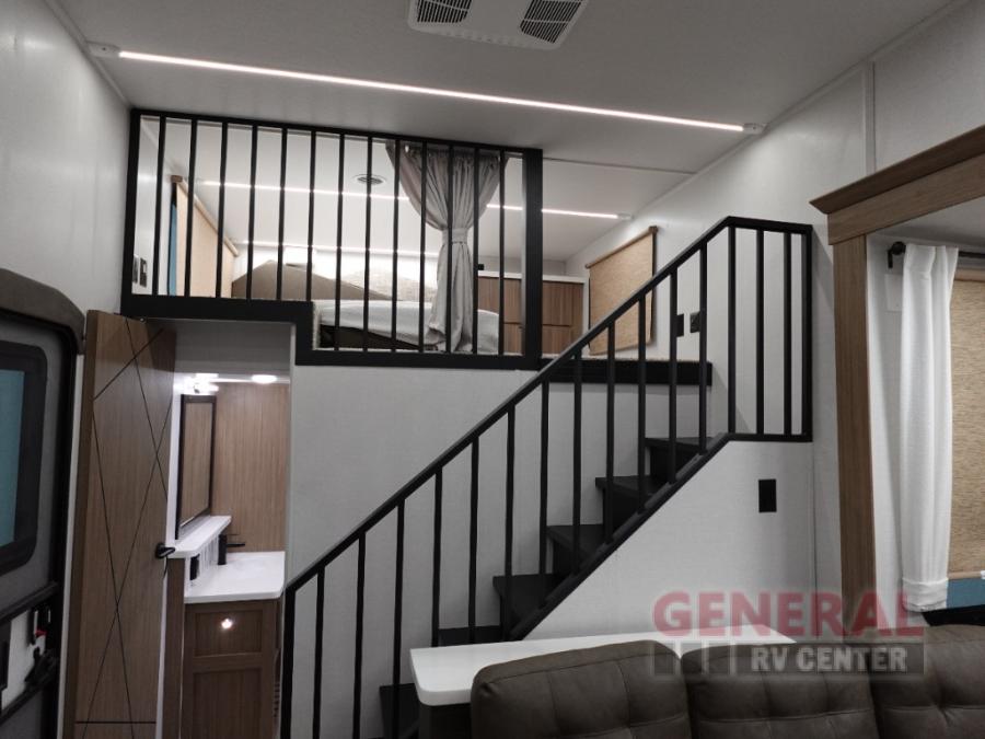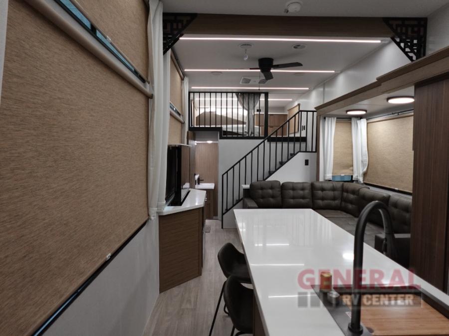 Your dream destination trailer awaits! The rear bathroom is a haven for convenience and comfort, featuring a spacious walk-in shower, a linen closet, and washer and dryer prep. The sectional sofa is a hub for socializing and relaxation, and the entertainment center with fireplace creates a warm and inviting ambiance. The ceiling fan adds a touch of elegance to the living area. The kitchen is well-equipped with a roll-out pantry, microwave, and side-by-side refrigerator, making meal prep and dining a breeze. Plus, the kitchen island with stools is perfect for casual meals or socializing. The half bath provides additional convenience for guests. The front bedroom is a serene retreat, featuring a custom king bed with VersaTilt, a stylish dresser, and plenty of storage space. Finishing with the loft area, which is perfect for kids or adults alike, with a versatile queen bunk mattress and two 42” x 74” bunk mats, providing ample sleeping space for family and friends