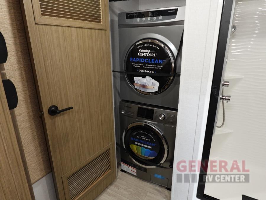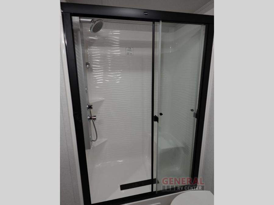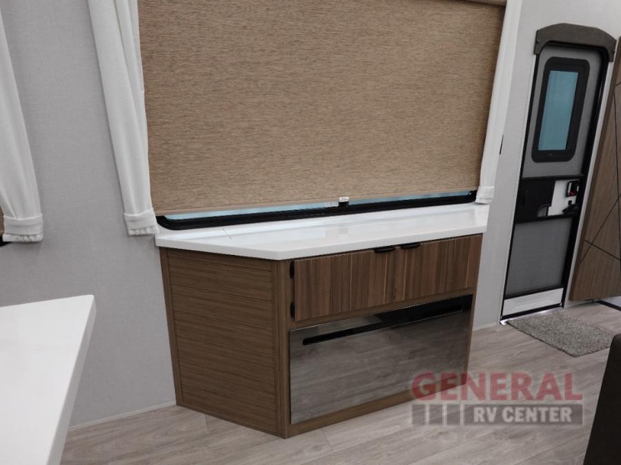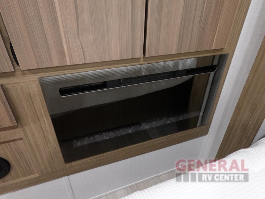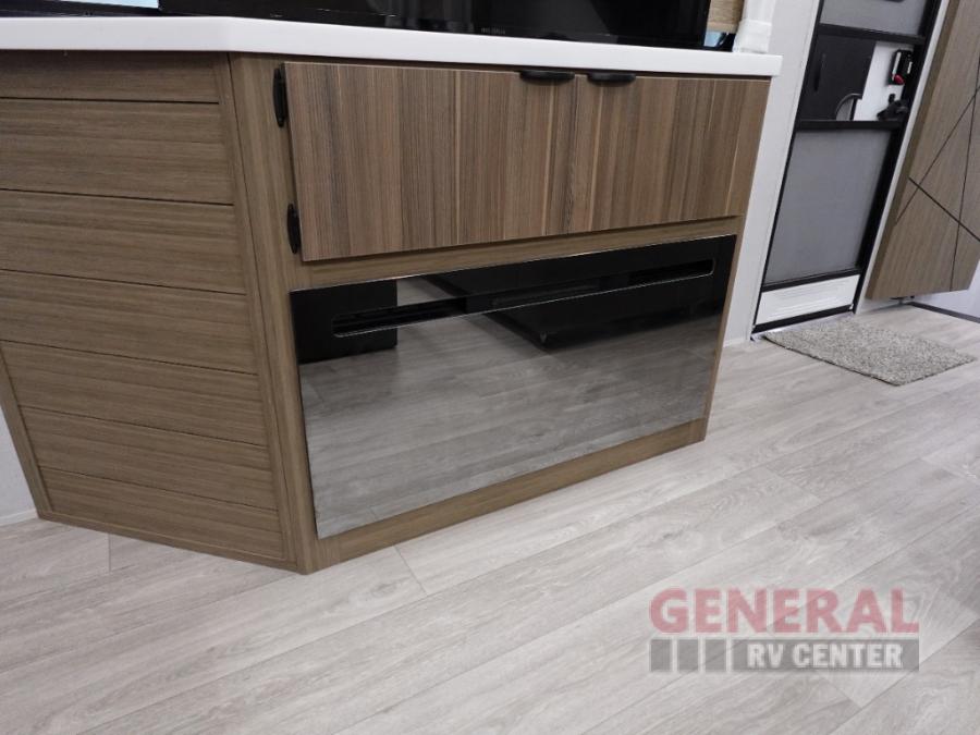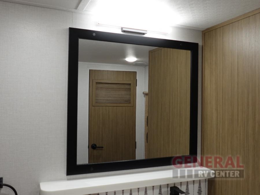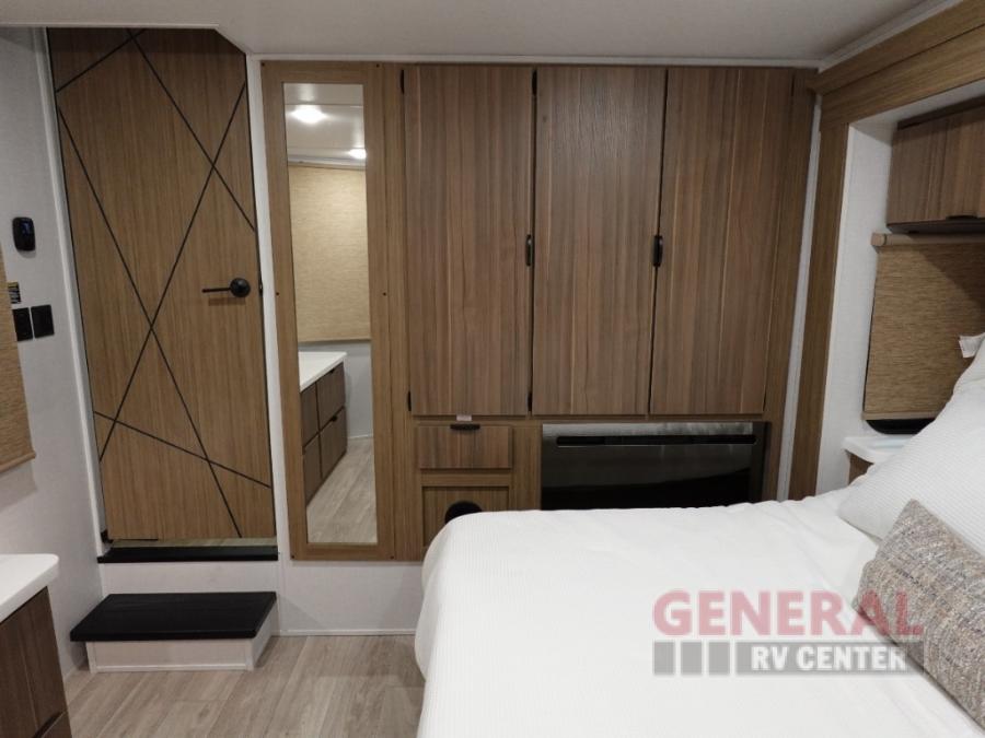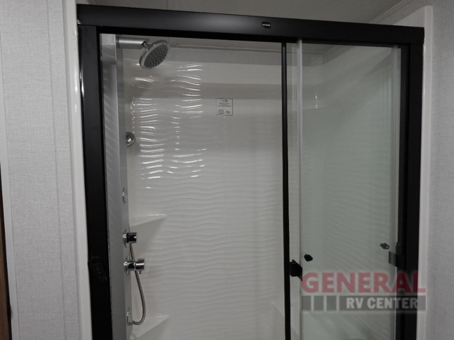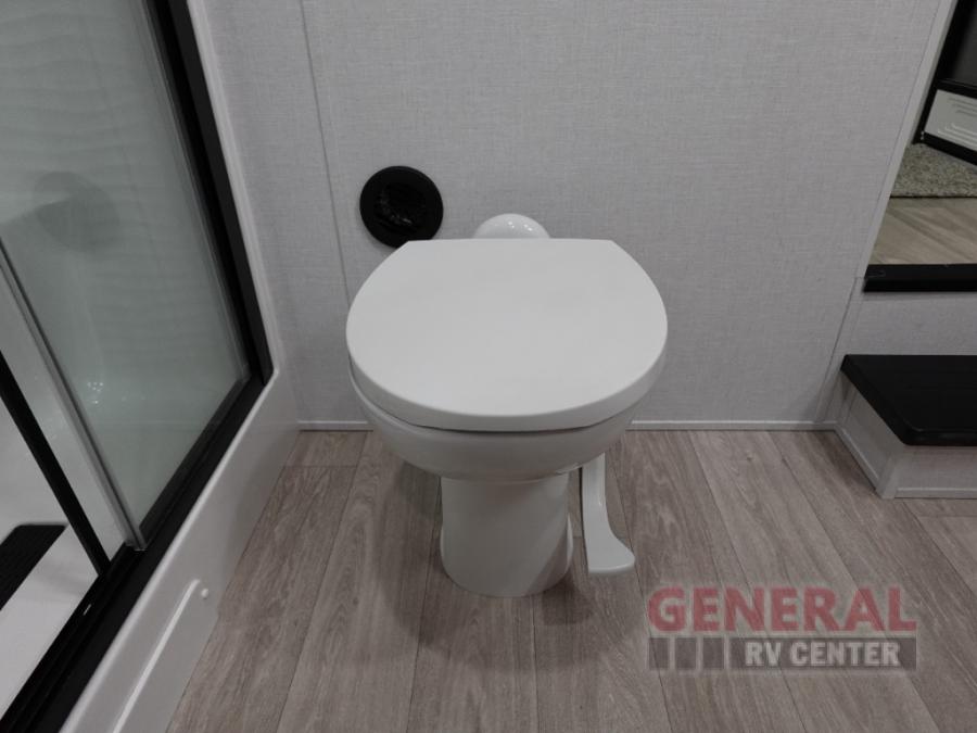 Your dream destination trailer awaits! The rear bathroom is a haven for convenience and comfort, featuring a spacious walk-in shower, a linen closet, and washer and dryer prep. The sectional sofa is a hub for socializing and relaxation, and the entertainment center with fireplace creates a warm and inviting ambiance. The ceiling fan adds a touch of elegance to the living area. The kitchen is well-equipped with a roll-out pantry, microwave, and side-by-side refrigerator, making meal prep and dining a breeze. Plus, the kitchen island with stools is perfect for casual meals or socializing. The half bath provides additional convenience for guests. The front bedroom is a serene retreat, featuring a custom king bed with VersaTilt, a stylish dresser, and plenty of storage space. Finishing with the loft area, which is perfect for kids or adults alike, with a versatile queen bunk mattress and two 42” x 74” bunk mats, providing ample sleeping space for family and friends