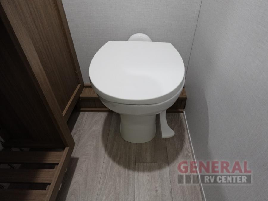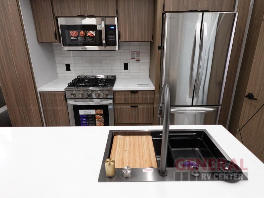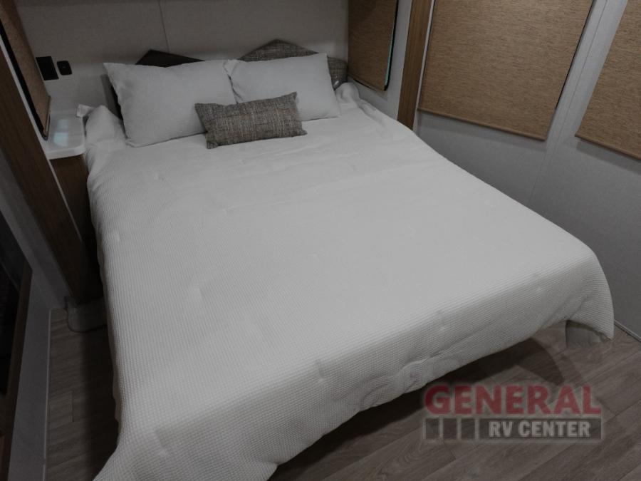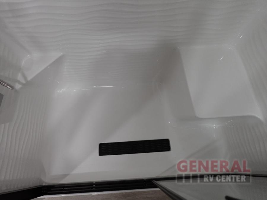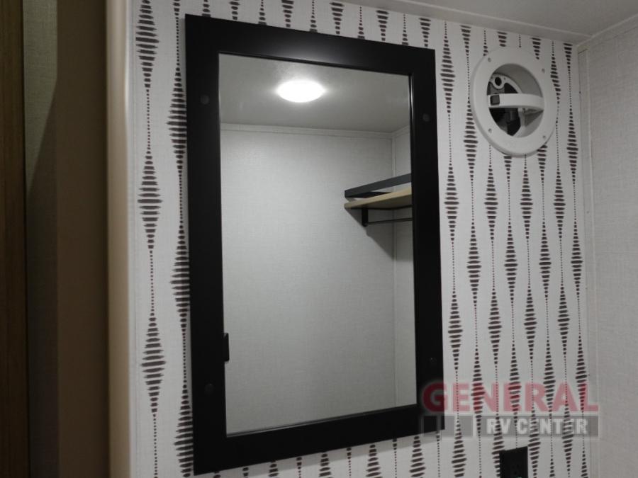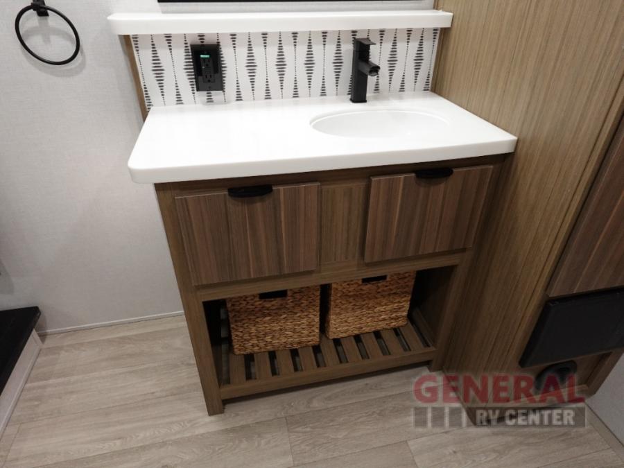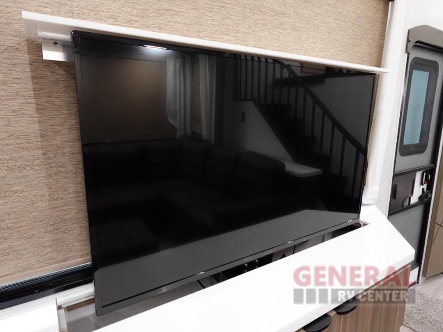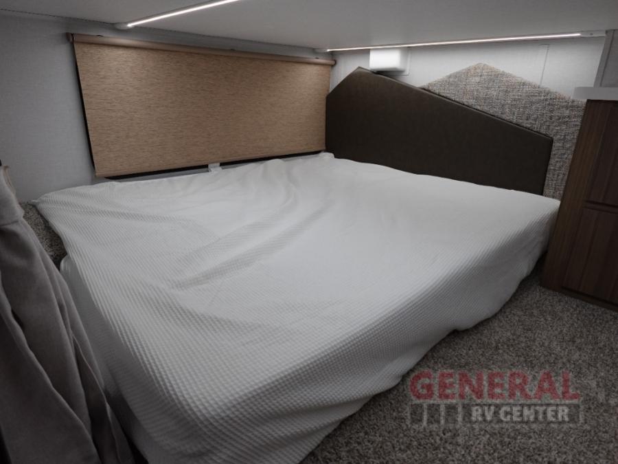 Your dream destination trailer awaits! The rear bathroom is a haven for convenience and comfort, featuring a spacious walk-in shower, a linen closet, and washer and dryer prep. The sectional sofa is a hub for socializing and relaxation, and the entertainment center with fireplace creates a warm and inviting ambiance. The ceiling fan adds a touch of elegance to the living area. The kitchen is well-equipped with a roll-out pantry, microwave, and side-by-side refrigerator, making meal prep and dining a breeze. Plus, the kitchen island with stools is perfect for casual meals or socializing. The half bath provides additional convenience for guests. The front bedroom is a serene retreat, featuring a custom king bed with VersaTilt, a stylish dresser, and plenty of storage space. Finishing with the loft area, which is perfect for kids or adults alike, with a versatile queen bunk mattress and two 42” x 74” bunk mats, providing ample sleeping space for family and friends
