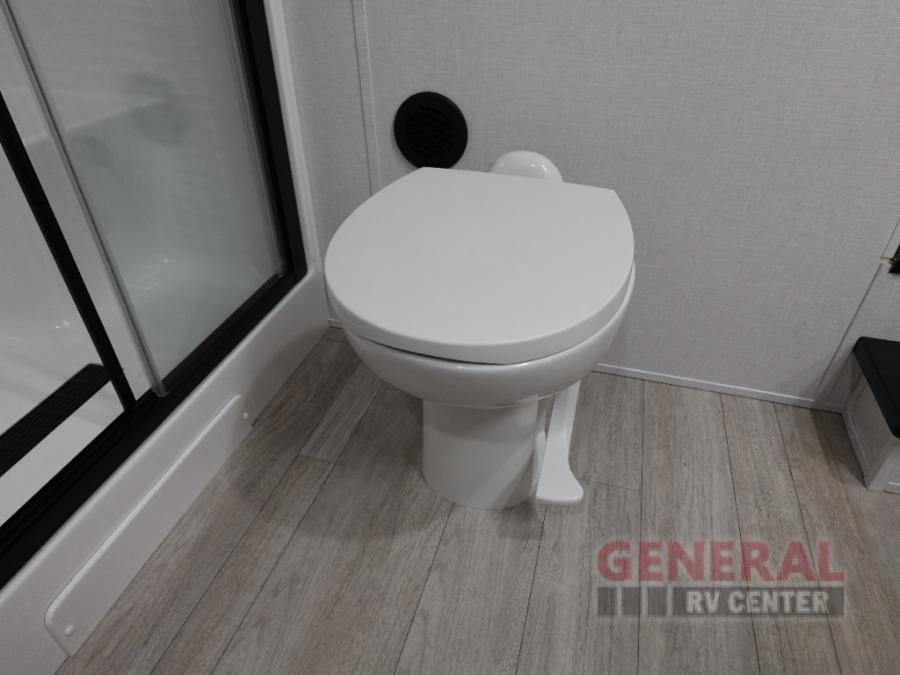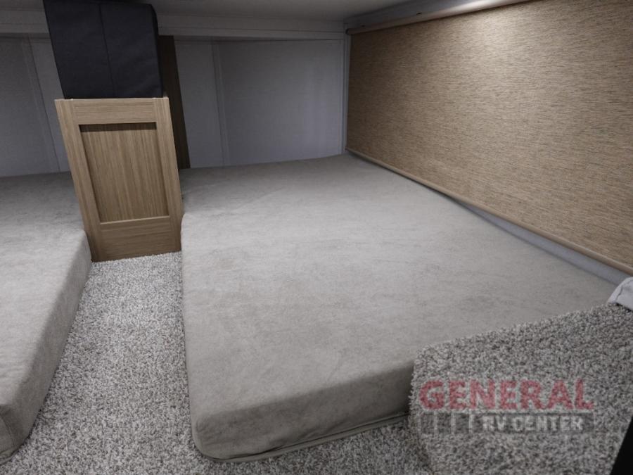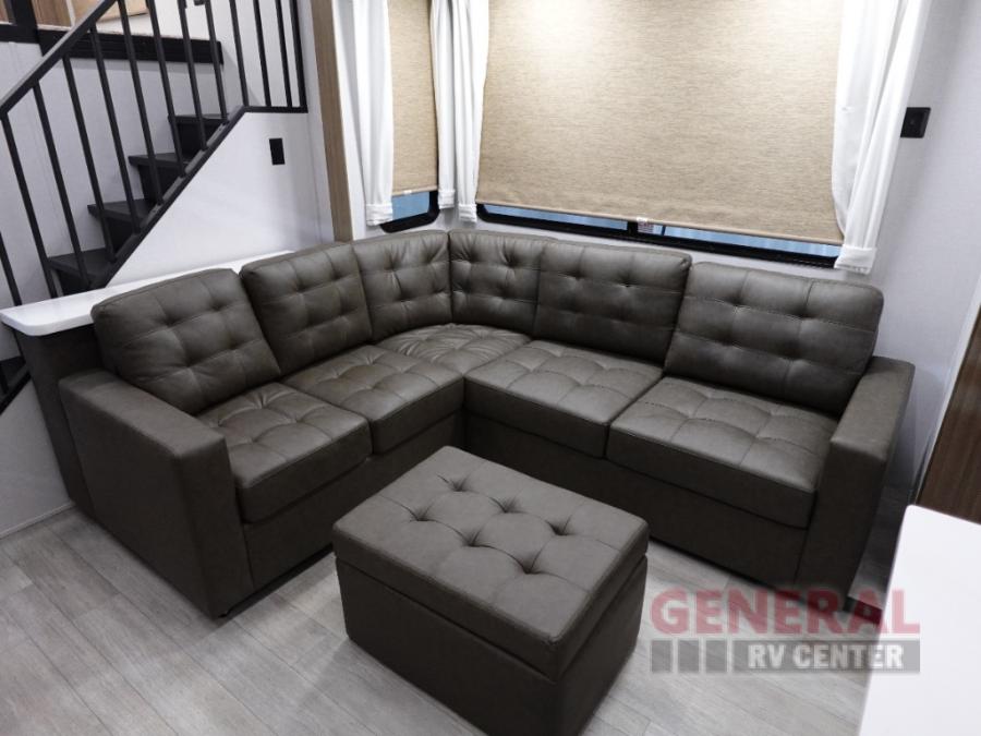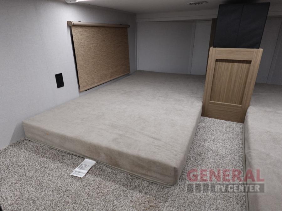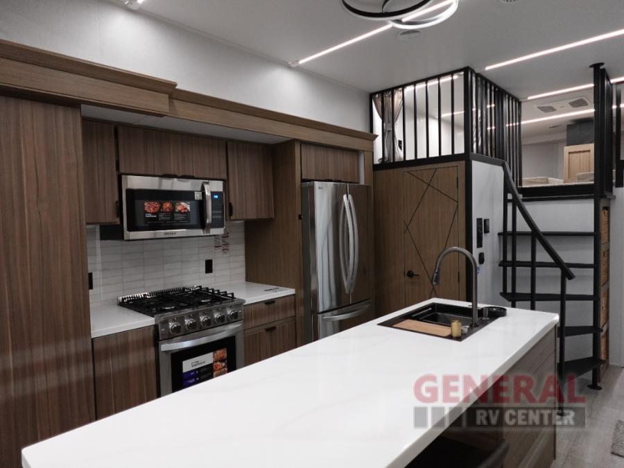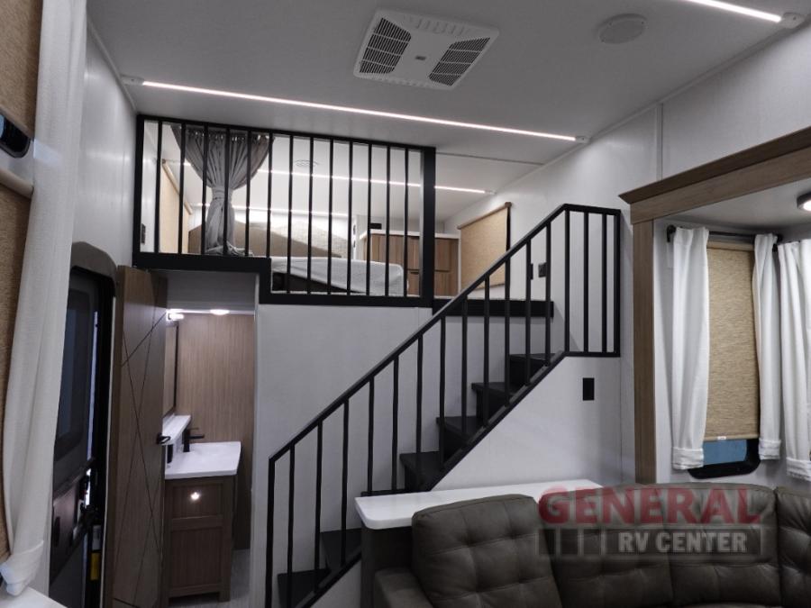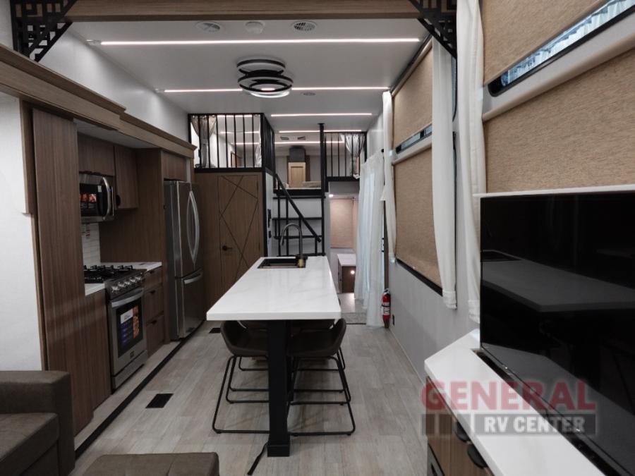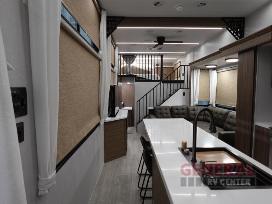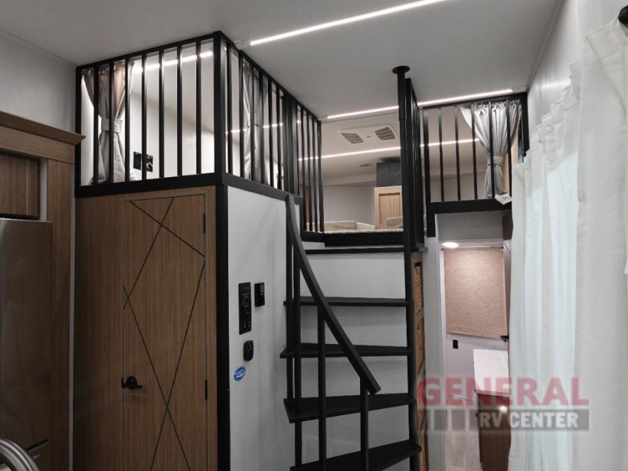 Your dream destination trailer awaits! The rear bathroom is a haven for convenience and comfort, featuring a spacious walk-in shower, a linen closet, and washer and dryer prep. The sectional sofa is a hub for socializing and relaxation, and the entertainment center with fireplace creates a warm and inviting ambiance. The ceiling fan adds a touch of elegance to the living area. The kitchen is well-equipped with a roll-out pantry, microwave, and side-by-side refrigerator, making meal prep and dining a breeze. Plus, the kitchen island with stools is perfect for casual meals or socializing. The half bath provides additional convenience for guests. The front bedroom is a serene retreat, featuring a custom king bed with VersaTilt, a stylish dresser, and plenty of storage space. Finishing with the loft area, which is perfect for kids or adults alike, with a versatile queen bunk mattress and two 42” x 74” bunk mats, providing ample sleeping space for family and friends
