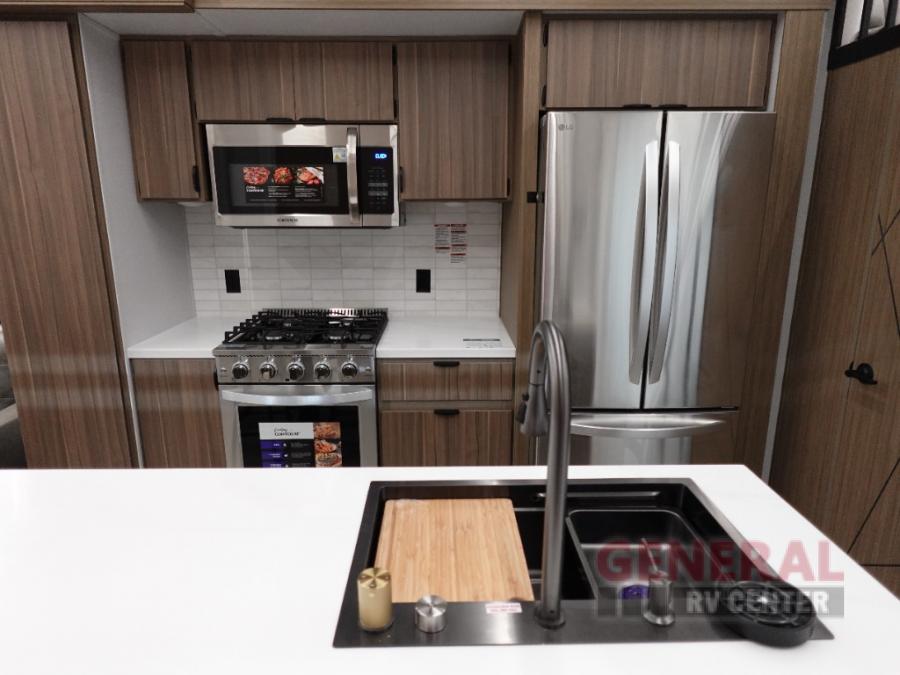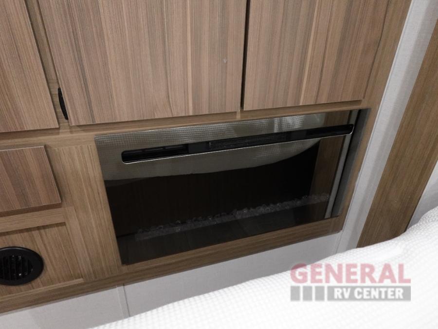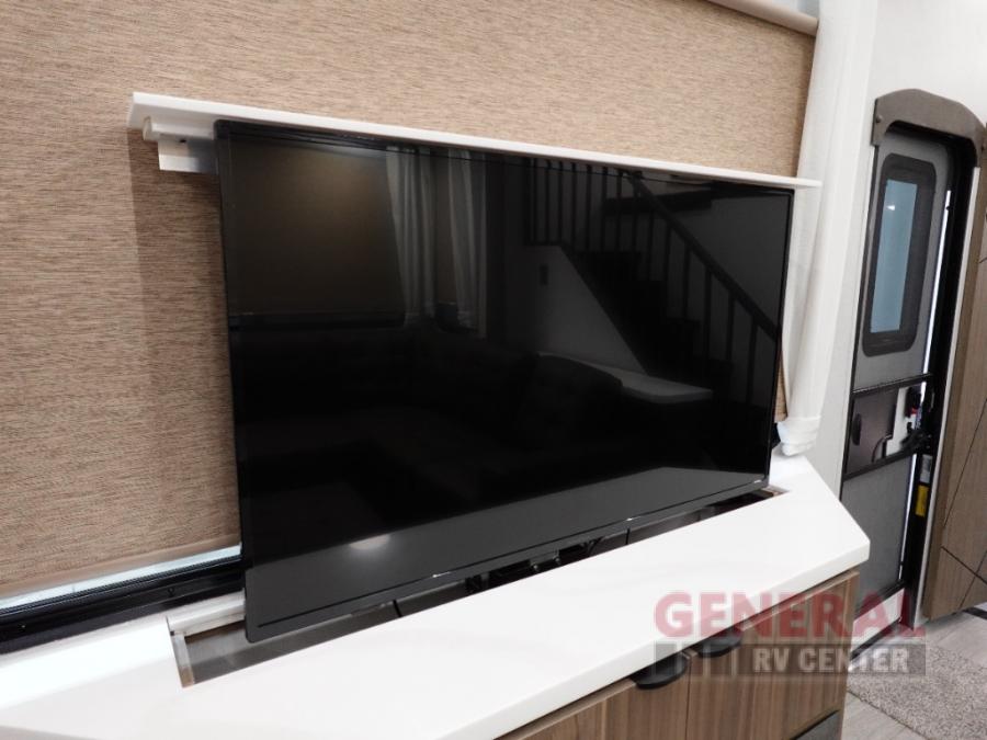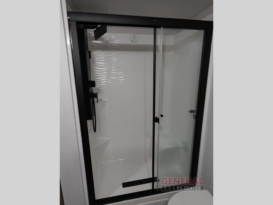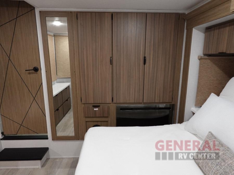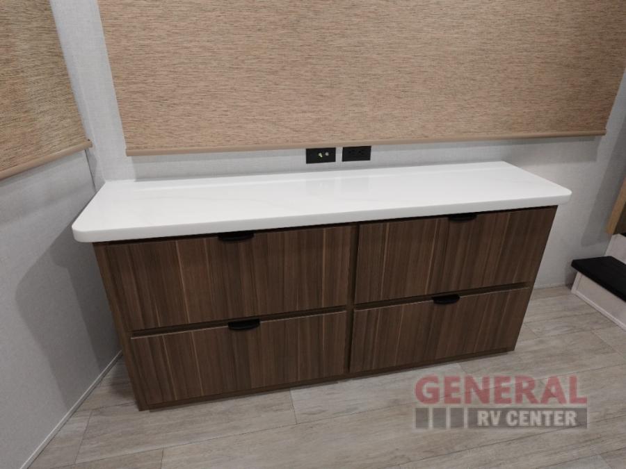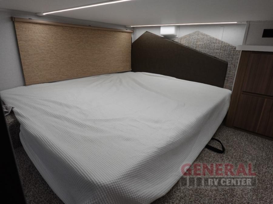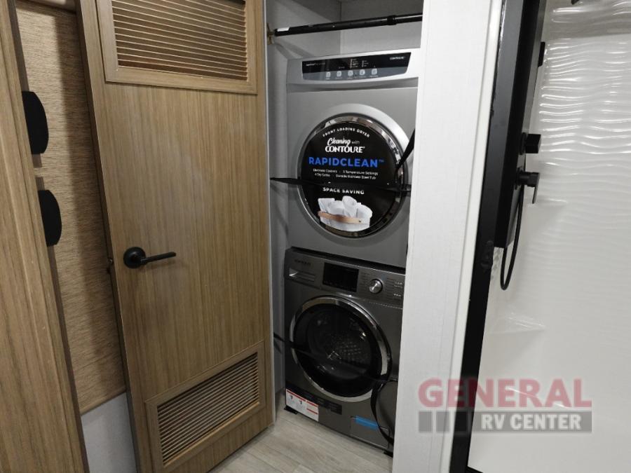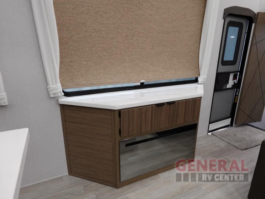 Your dream destination trailer awaits! The rear bathroom is a haven for convenience and comfort, featuring a spacious walk-in shower, a linen closet, and washer and dryer prep. The sectional sofa is a hub for socializing and relaxation, and the entertainment center with fireplace creates a warm and inviting ambiance. The ceiling fan adds a touch of elegance to the living area. The kitchen is well-equipped with a roll-out pantry, microwave, and side-by-side refrigerator, making meal prep and dining a breeze. Plus, the kitchen island with stools is perfect for casual meals or socializing. The half bath provides additional convenience for guests. The front bedroom is a serene retreat, featuring a custom king bed with VersaTilt, a stylish dresser, and plenty of storage space. Finishing with the loft area, which is perfect for kids or adults alike, with a versatile queen bunk mattress and two 42” x 74” bunk mats, providing ample sleeping space for family and friends