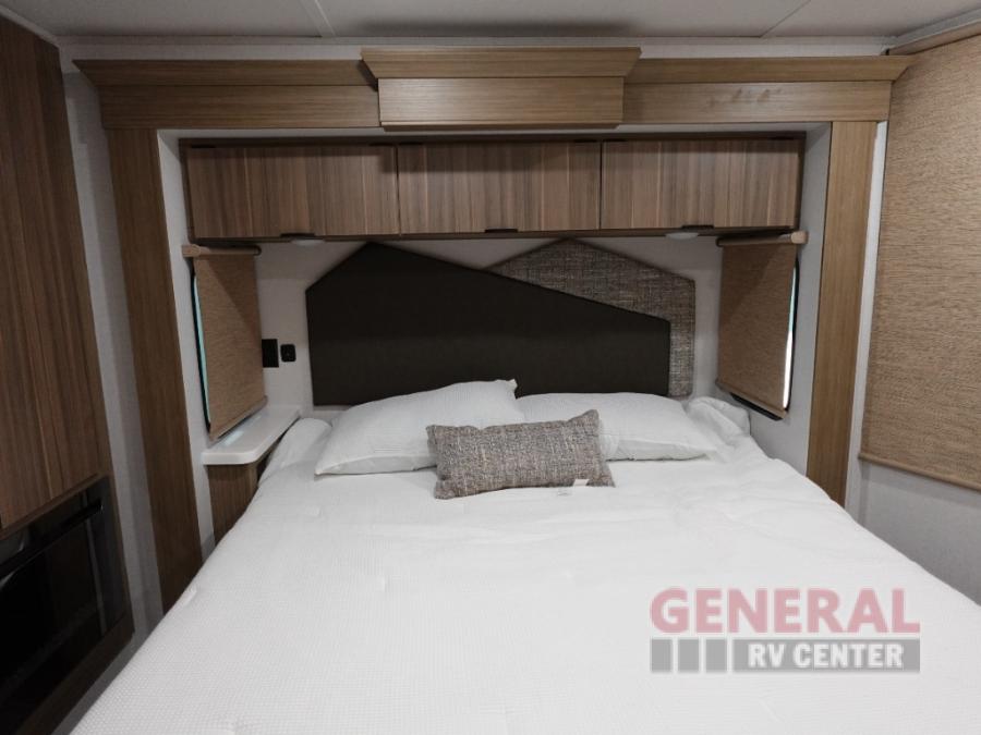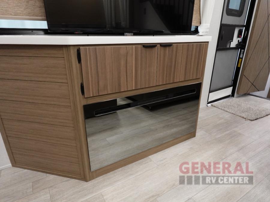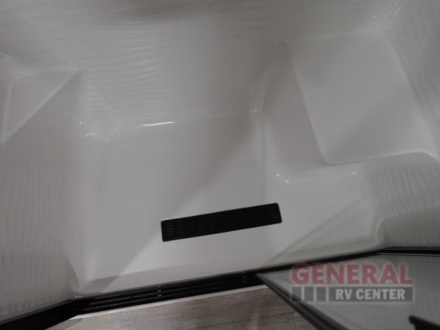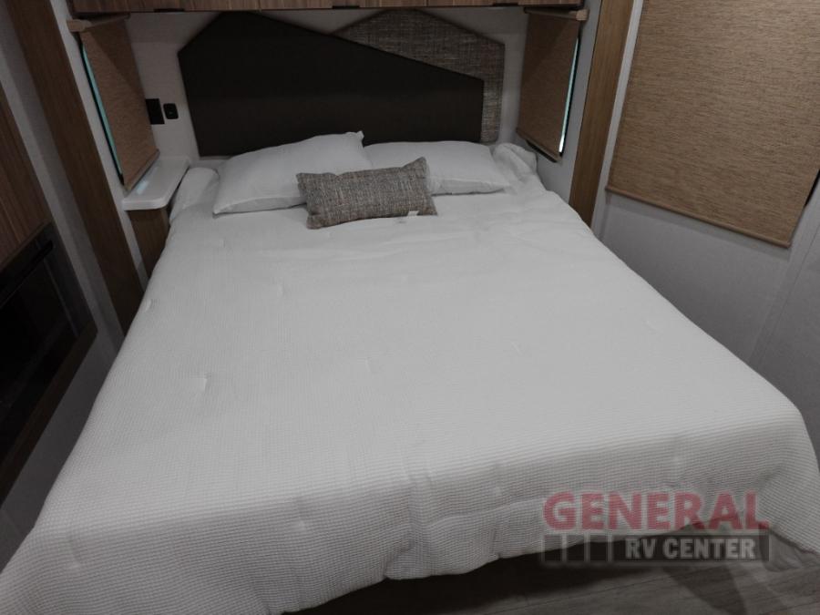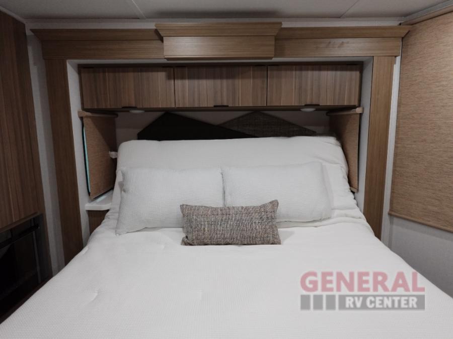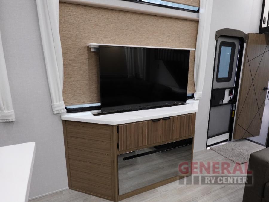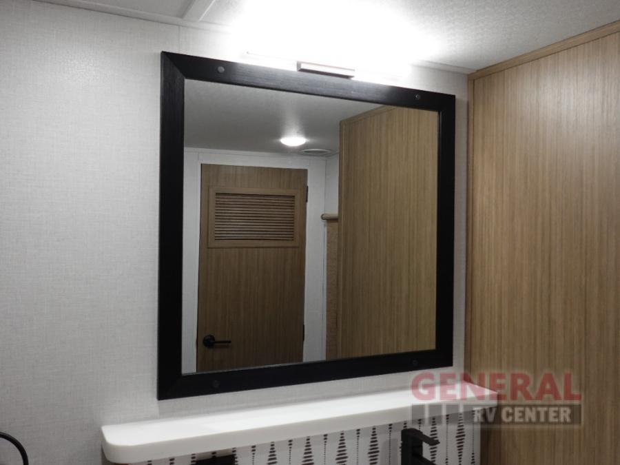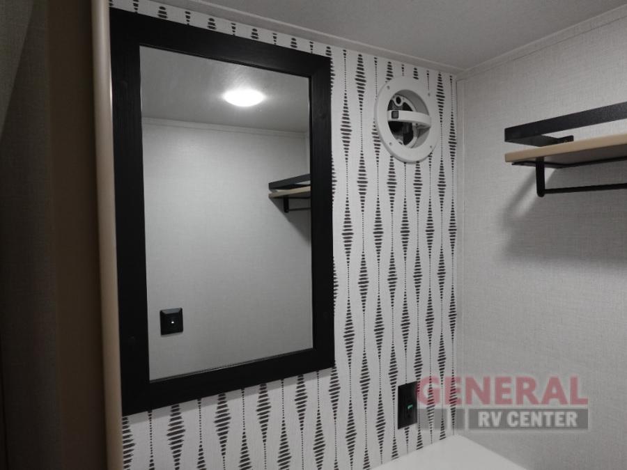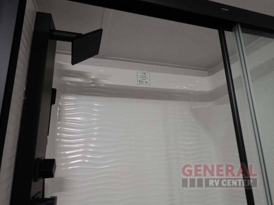 Your dream destination trailer awaits! The rear bathroom is a haven for convenience and comfort, featuring a spacious walk-in shower, a linen closet, and washer and dryer prep. The sectional sofa is a hub for socializing and relaxation, and the entertainment center with fireplace creates a warm and inviting ambiance. The ceiling fan adds a touch of elegance to the living area. The kitchen is well-equipped with a roll-out pantry, microwave, and side-by-side refrigerator, making meal prep and dining a breeze. Plus, the kitchen island with stools is perfect for casual meals or socializing. The half bath provides additional convenience for guests. The front bedroom is a serene retreat, featuring a custom king bed with VersaTilt, a stylish dresser, and plenty of storage space. Finishing with the loft area, which is perfect for kids or adults alike, with a versatile queen bunk mattress and two 42” x 74” bunk mats, providing ample sleeping space for family and friends