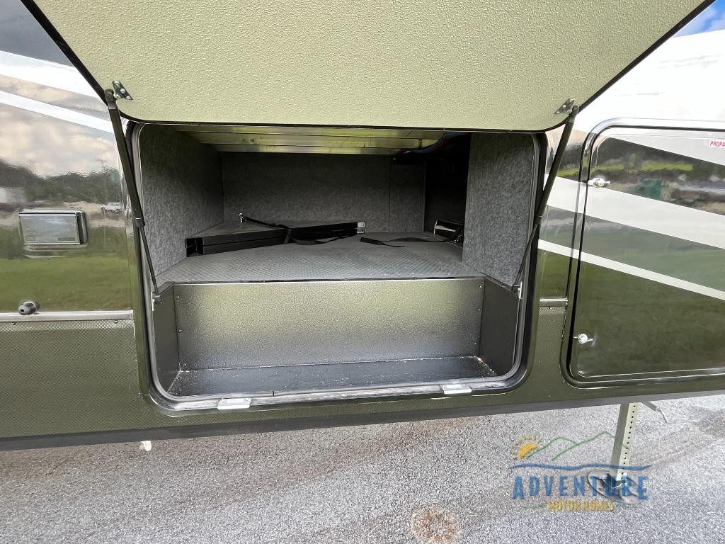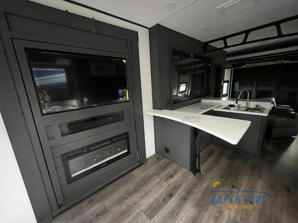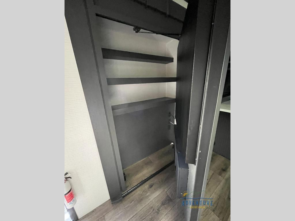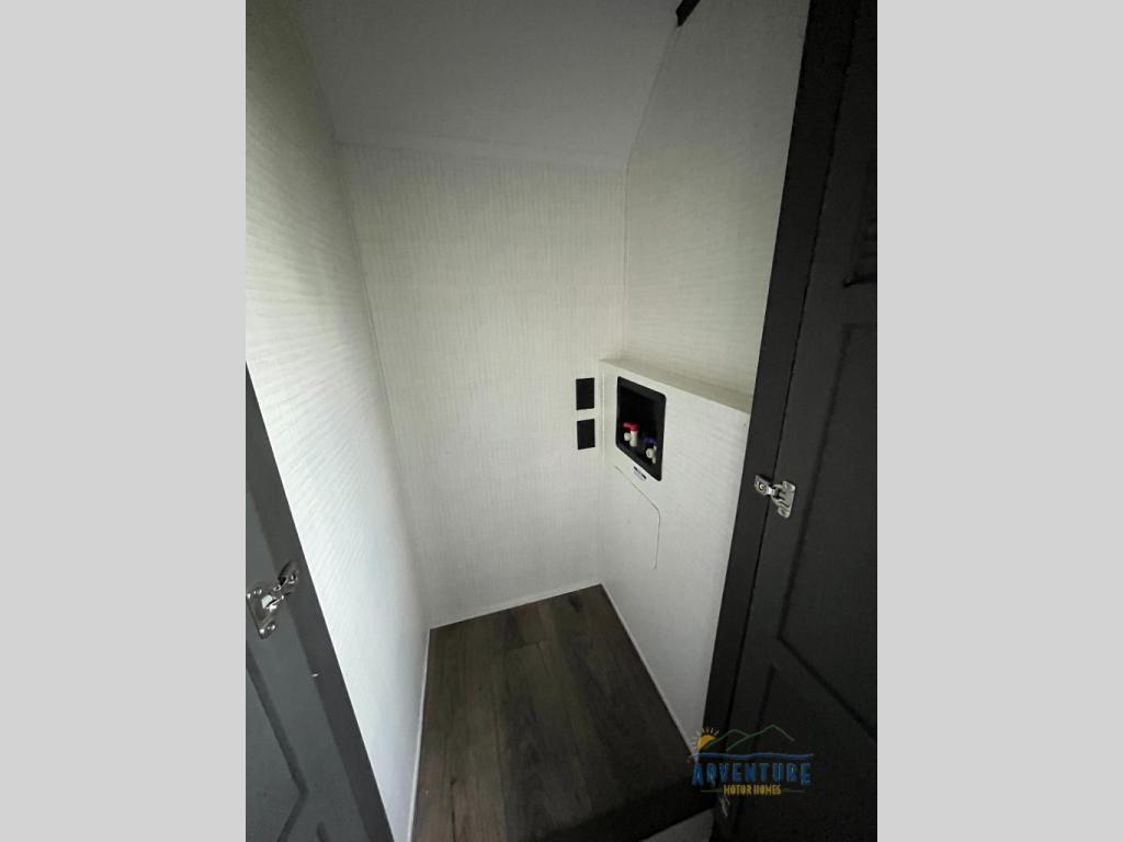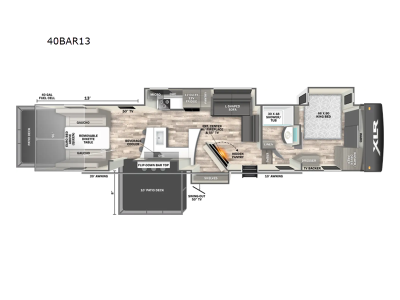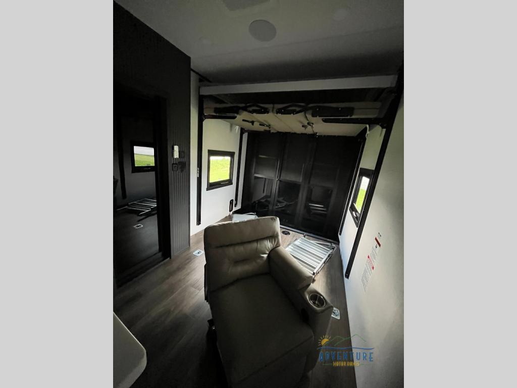 Once you arrive at your destination, you can unload your toys from the 13' garage, then relax on the dual gaucho sofas with a removable dinette table in between. There is also a queen-size Euro bed above the sofa where guests can sleep. Everyone will love to gather on the side patio that features a flip-down bar top and a window that looks into the kitchen. There are also bar stools here and inside at the counter so everyone has a seat. If the weather isn't cooperating, you can relax on the L-shaped sofa in the main living area, and there is a 55" TV with a hidden pantry behind for snacks! A spacious full bath will let everyone freshen up after trail riding, and you'll love having your own bedroom up front. Here, you'll find a 66 x 80 king bed slide out, a wardrobe, dresser, plus washer and dryer prep if you choose to add those appliances!