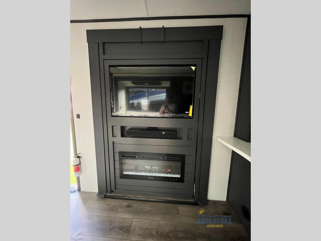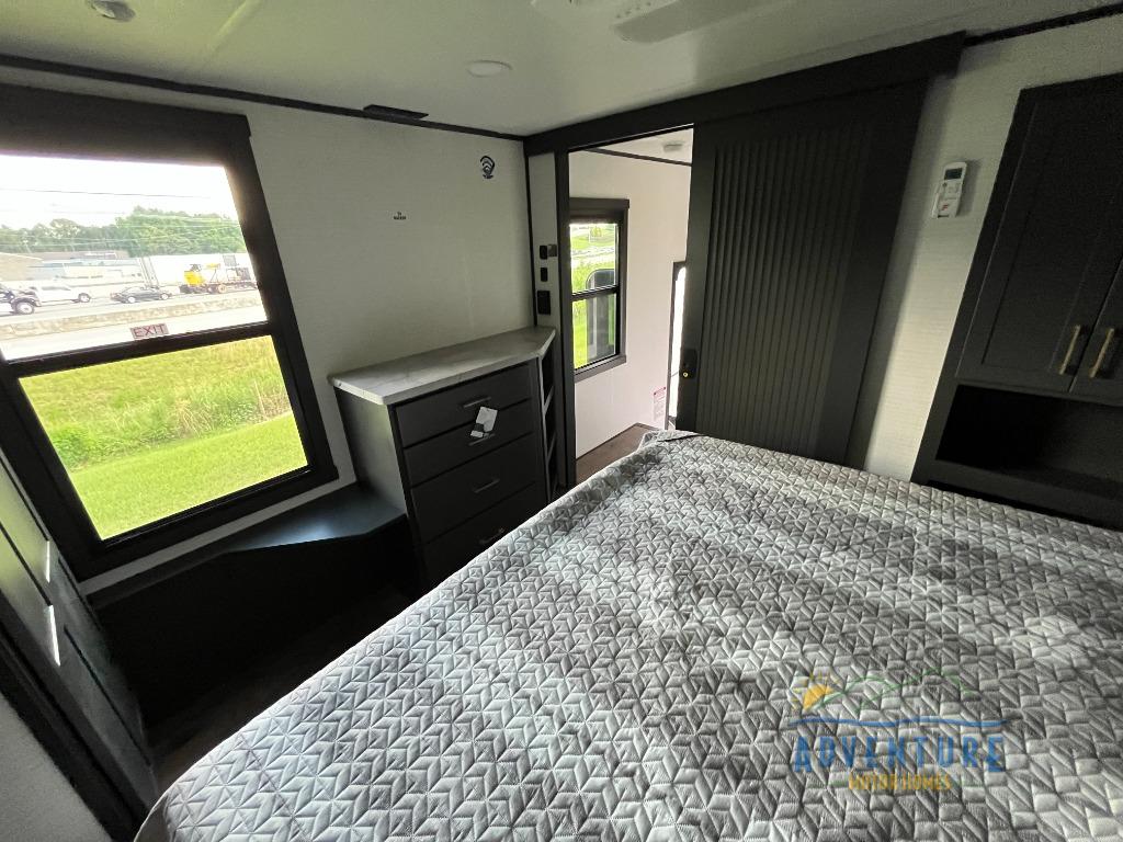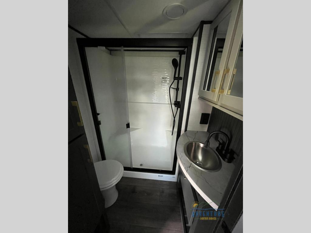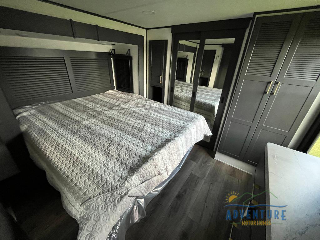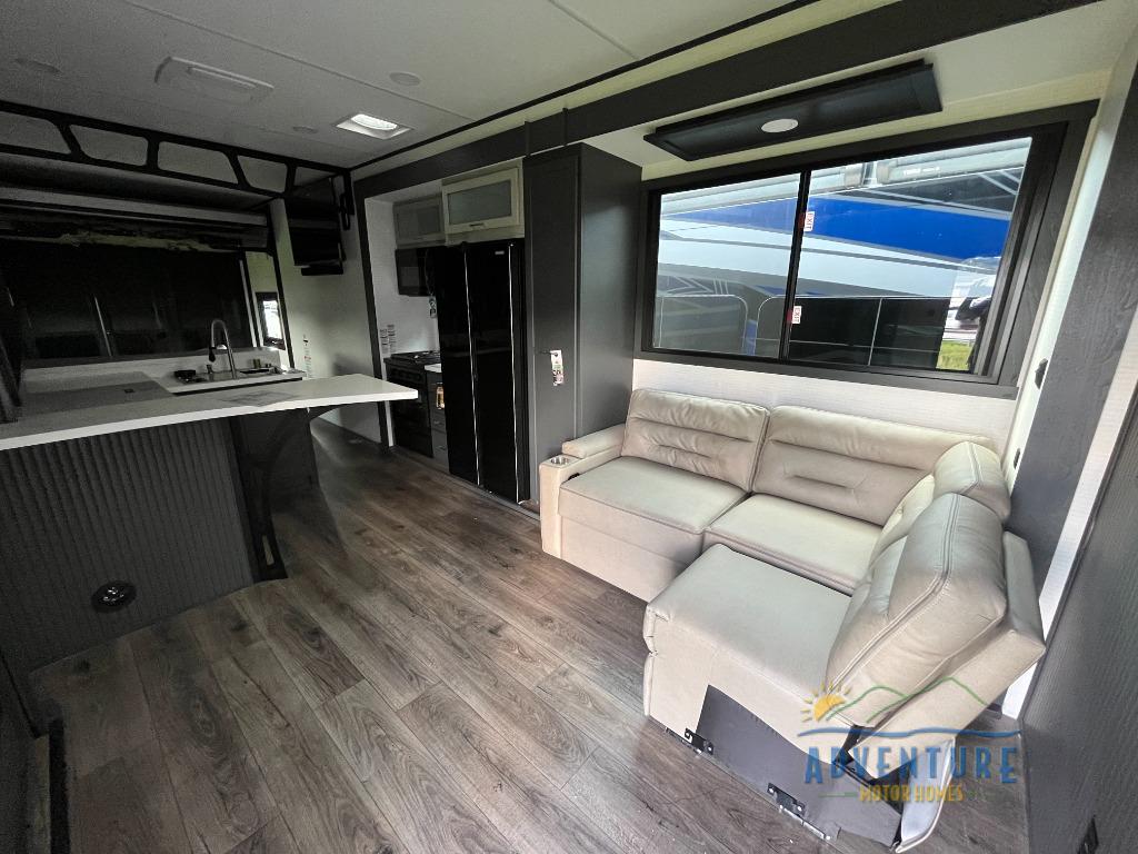 Once you arrive at your destination, you can unload your toys from the 13' garage, then relax on the dual gaucho sofas with a removable dinette table in between. There is also a queen-size Euro bed above the sofa where guests can sleep. Everyone will love to gather on the side patio that features a flip-down bar top and a window that looks into the kitchen. There are also bar stools here and inside at the counter so everyone has a seat. If the weather isn't cooperating, you can relax on the L-shaped sofa in the main living area, and there is a 55" TV with a hidden pantry behind for snacks! A spacious full bath will let everyone freshen up after trail riding, and you'll love having your own bedroom up front. Here, you'll find a 66 x 80 king bed slide out, a wardrobe, dresser, plus washer and dryer prep if you choose to add those appliances!