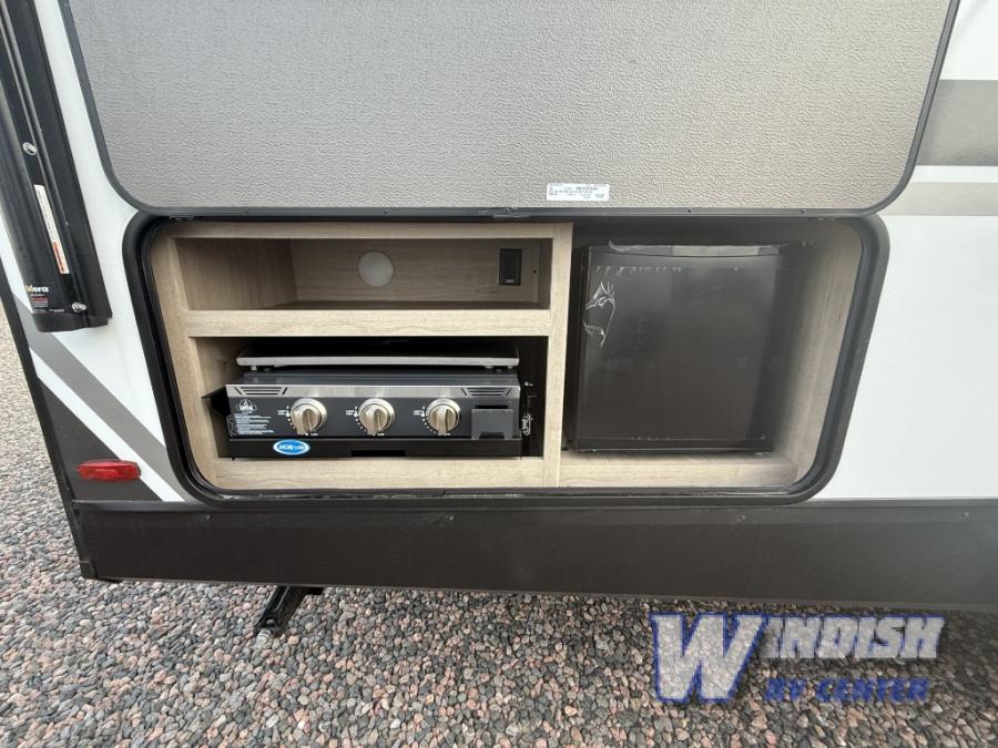 Unleash adventure with this incredible travel trailer! Sleep in style in the serene bedroom, featuring a plush queen bed, spacious wardrobe, and TV prep for entertainment. The kitchen is equipped with a pull-out pantry, 10 cu. refrigerator, microwave, and three-burner cooktop for delicious meal prep. Enjoy extra counter space with the flip-up countertop extension, optimal for easy and comfortable cooking. Family and friends can dine at the U-shaped dinette while watching the  LED HDTV for added entertainment. The full bathroom offers a shower, and linen closet. Kids will love the double bunk bed, perfect for taking a nap. On the exterior, you will find the outdoor kitchen, pass-thru storage, and 20” x 20” baggage door/trash can storage, ideal for a better organization of your belongings. Finally, create outdoor activities without worrying about the weather thanks to the 19’ awning.
