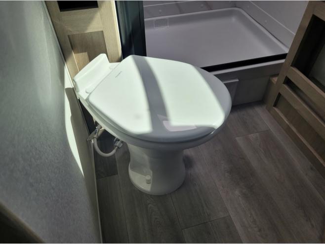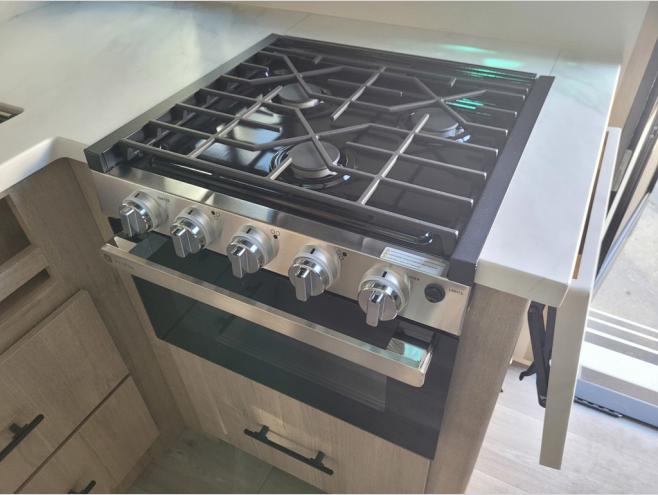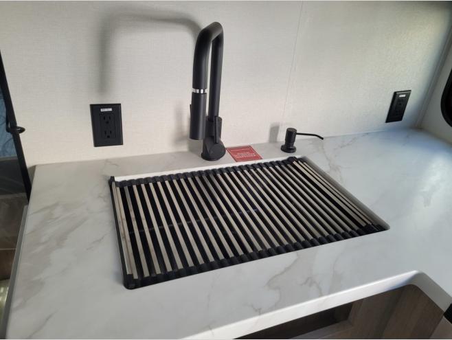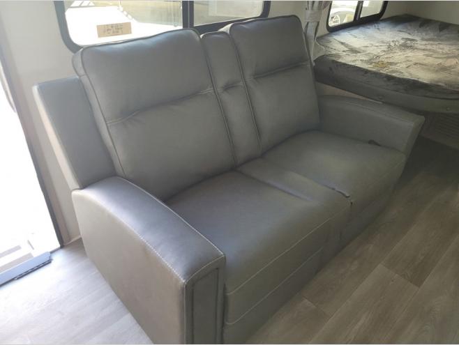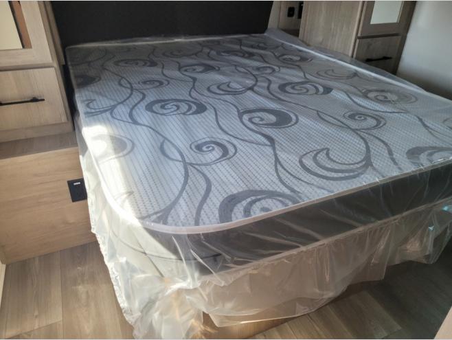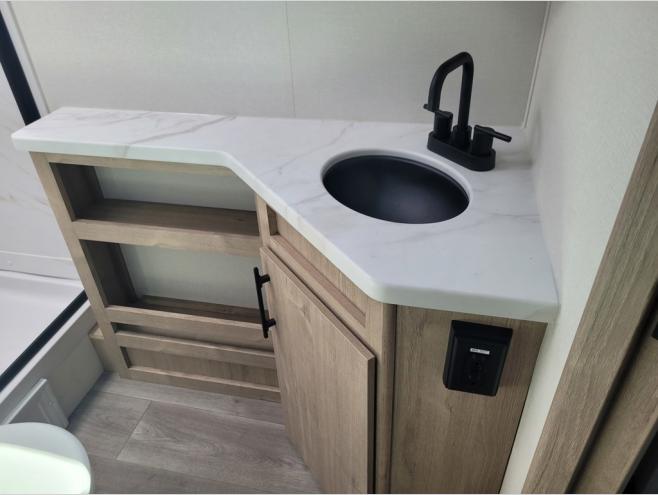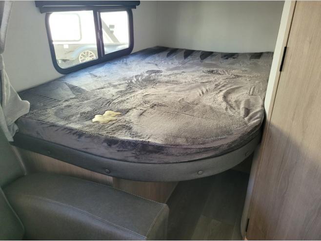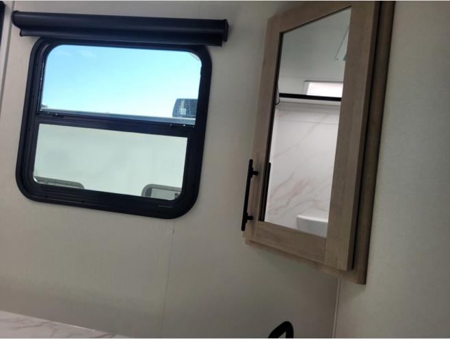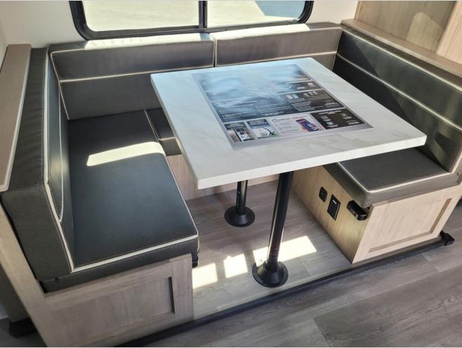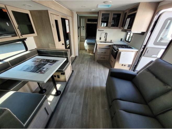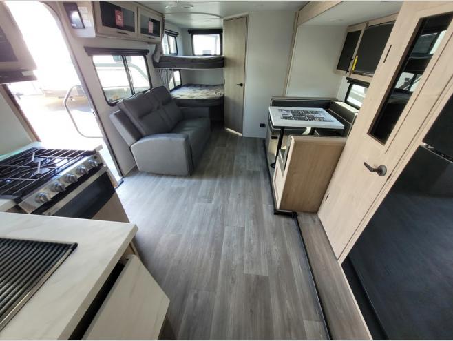 The dual entry doors make it easy to enter and exit this travel trailer! You will find a walk-around queen-size bed up front in the private bedroom, and one of the entry/exit doors to the unit so you can quietly slip out for an early morning fishing trip. The U-shaped dinette is right next to the window, so you can look out at your surroundings while you enjoy breakfast. The double-size bunks have some privacy curtains, and the bunks are right next to the full bathroom for easy access in the middle of the night. The fully equipped kitchen has everything you need to get dinner in the oven, and you can have some more prep space by using the flip-up countertop extension. You even have an outdoor griddle and an outdoor 1.6 cu. ft. refrigerator to enjoy a cold beverage while you cook under the 22' electric awning!