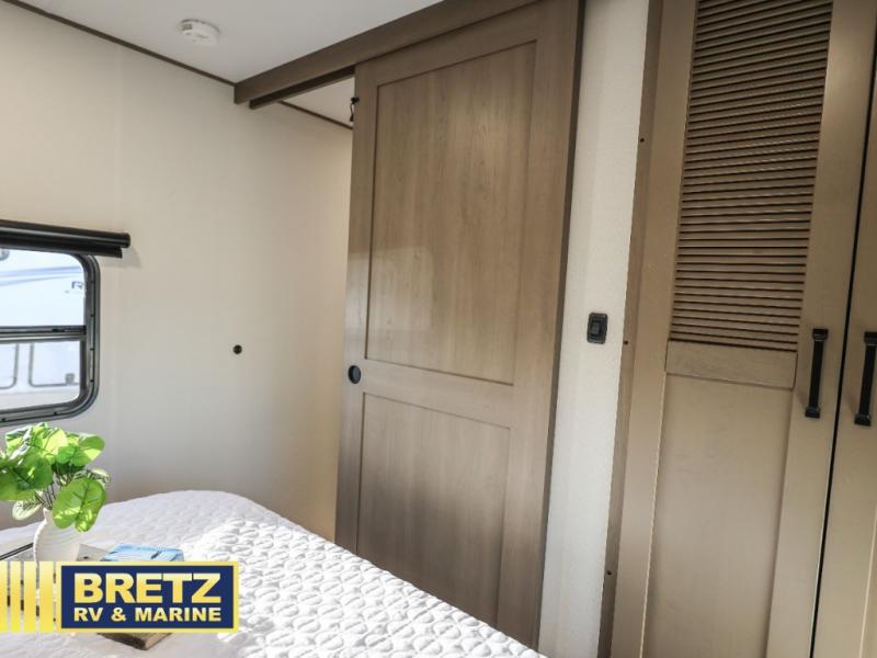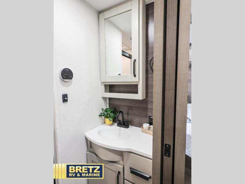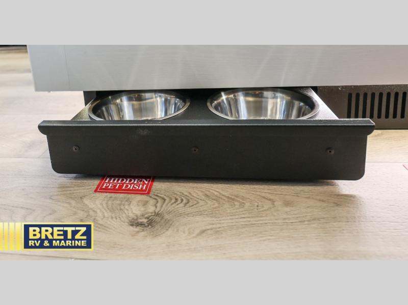Whether you travel to explore or relax, this trailer will give you the choice depending where you park it! The kitchen amenities offer a gourmet kitchen including a 16 cu. ft. refrigerator, an island, and a hutch. You and your guests will find theater seating with cupholders, a booth dinette or optional swivel dinette, and a tri-fold sofa to sit on and visit while you watch the 40" LED HDTV with a fireplace below. The full bathroom includes a space saving sliding door and linen storage, and the bedroom gives you a front walk-around queen bed with storage for your clothes on each side. There is even washer and dryer prep here if you choose to go full-time. Outside, you'll find a 12' electric awning, an LP Quick Connect and Coax TV hookup, plus an exterior griddle, 4.1 cu. ft. refrigerator and outside spray port!