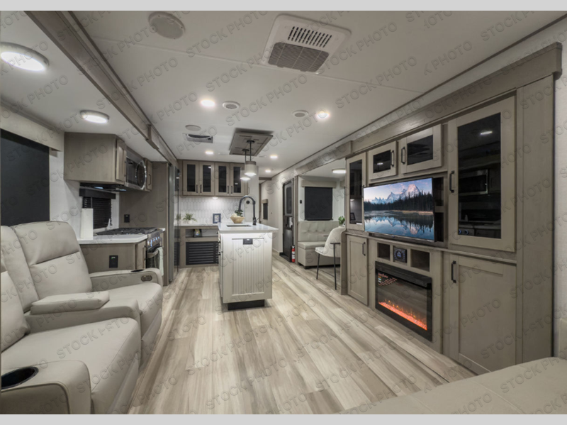Whether you travel to explore or relax, this trailer will give you the choice depending where you park it! The kitchen amenities offer a gourmet kitchen including a 16 cu. ft. refrigerator, an island, and a hutch. You and your guests will find theater seating with cupholders, a booth dinette or optional swivel dinette, and a tri-fold sofa to sit on and visit while you watch the 40" LED HDTV with a fireplace below. The full bathroom includes a space saving sliding door and linen storage, and the bedroom gives you a front walk-around queen bed with storage for your clothes on each side. There is even washer and dryer prep here if you choose to go full-time. Outside, you'll find a 12' electric awning, an LP Quick Connect and Coax TV hookup, plus an exterior griddle, 4.1 cu. ft. refrigerator and outside spray port!
