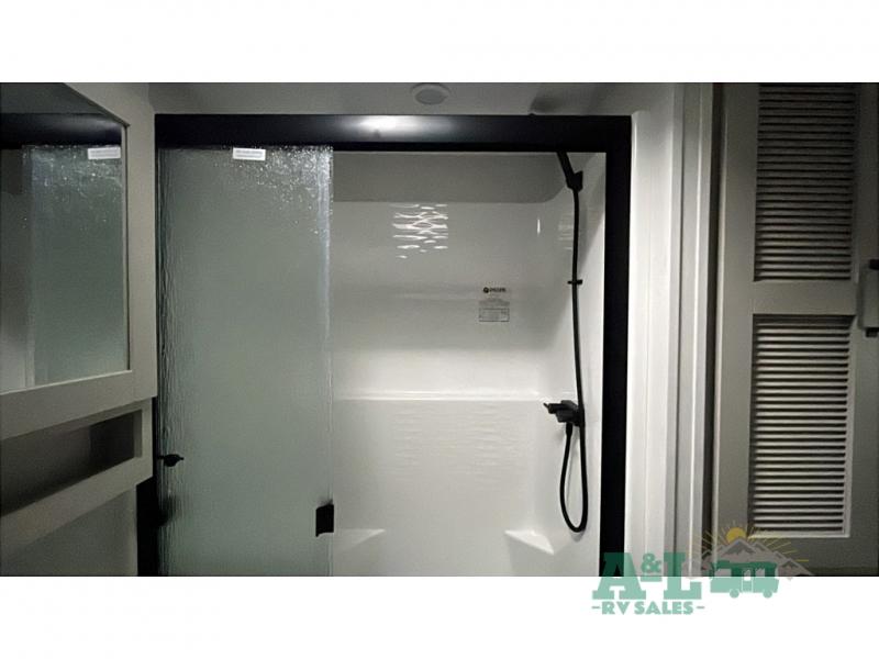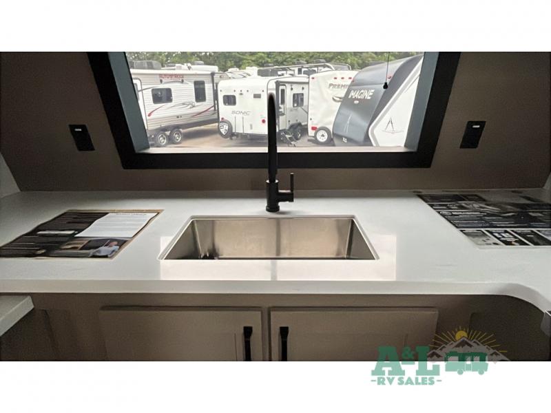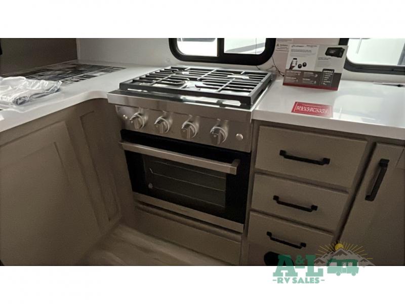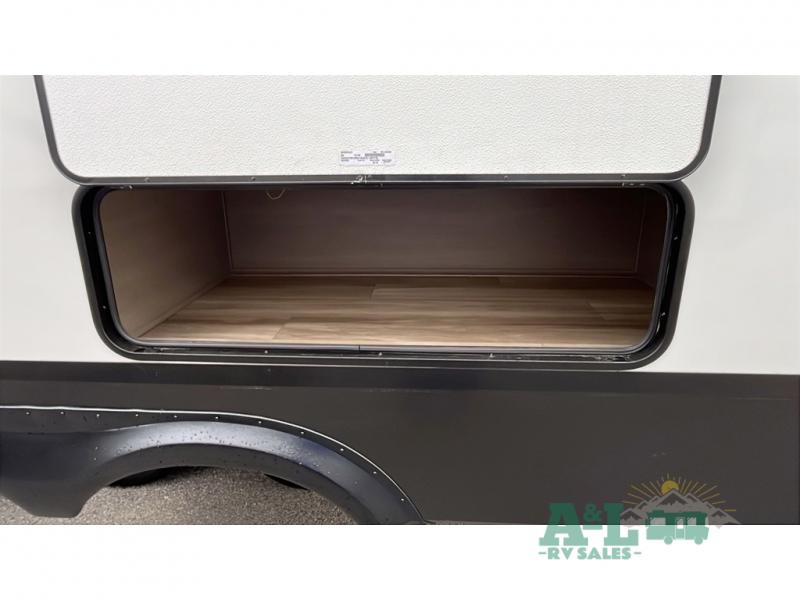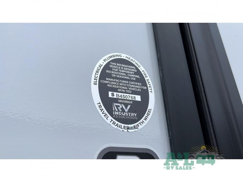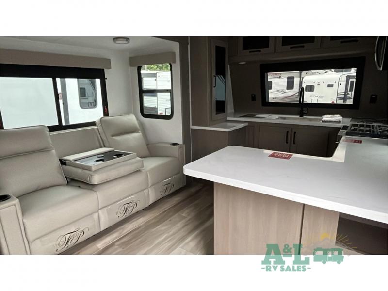 This front kitchen travel trailer will be perfect for camping trips to the lake or woods! There is ample counter space to prep your best meals, including an L-shaped kitchen counter with a bar stool to enjoy your coffee at. The theater seating is inviting, and you can choose the optional tri-fold sofa and end table or optional U-shaped dinette if you need more sleeping space for guests. This unit features a massive master bedroom with a queen bed slide and optional king bed, two closets, and a spacious rear bath. There are two bath sinks here, a 30" x 48" shower, plus washer and dryer prep if you choose to add these appliances!