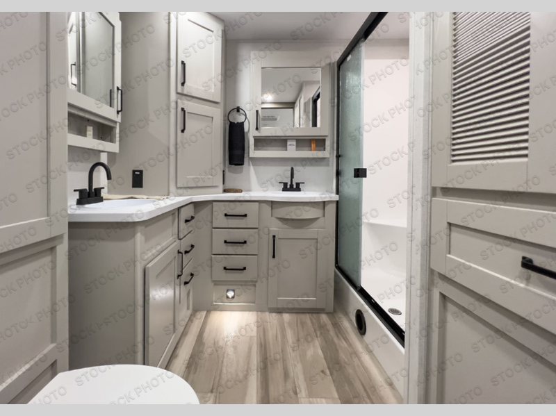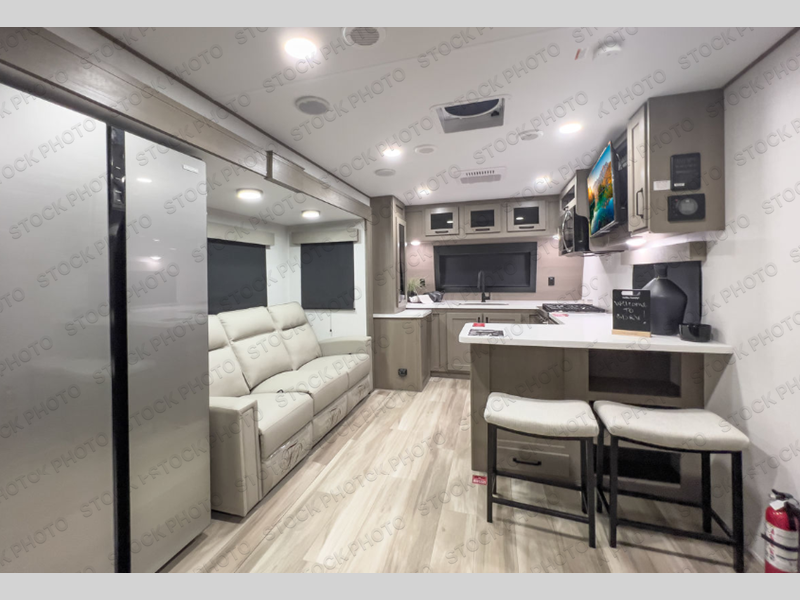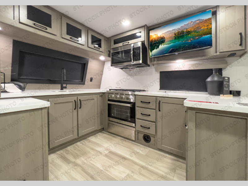 This front kitchen travel trailer will be perfect for camping trips to the lake or woods! There is ample counter space to prep your best meals, including an L-shaped kitchen counter with a bar stool to enjoy your coffee at. The theater seating is inviting, and you can choose the optional tri-fold sofa and end table or optional U-shaped dinette if you need more sleeping space for guests. This unit features a massive master bedroom with a queen bed slide and optional king bed, two closets, and a spacious rear bath. There are two bath sinks here, a 30" x 48" shower, plus washer and dryer prep if you choose to add these appliances!