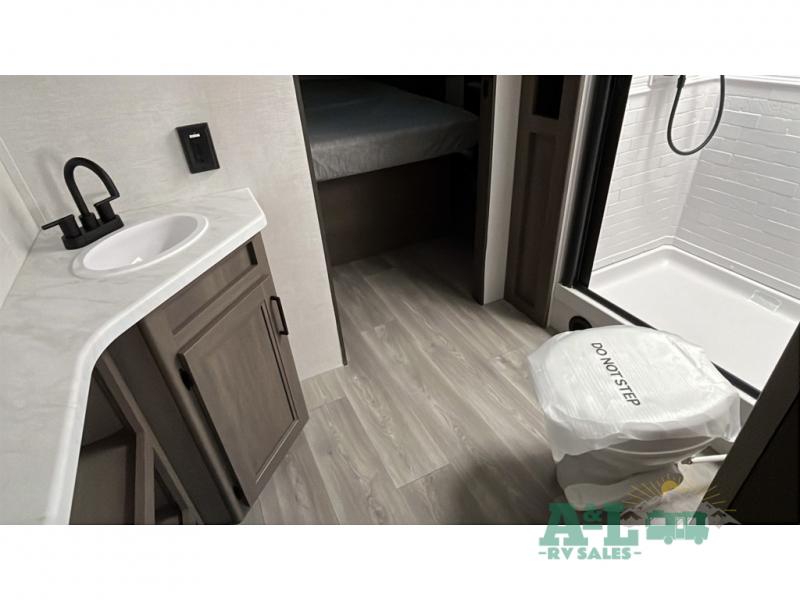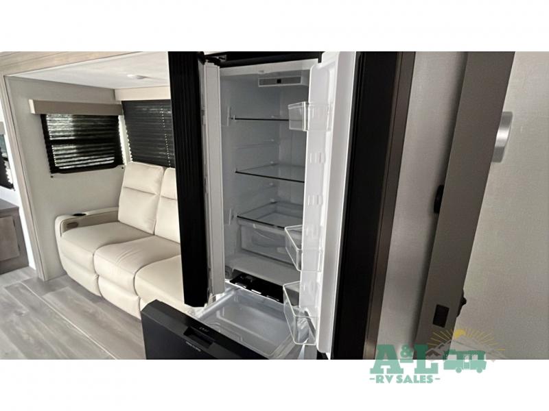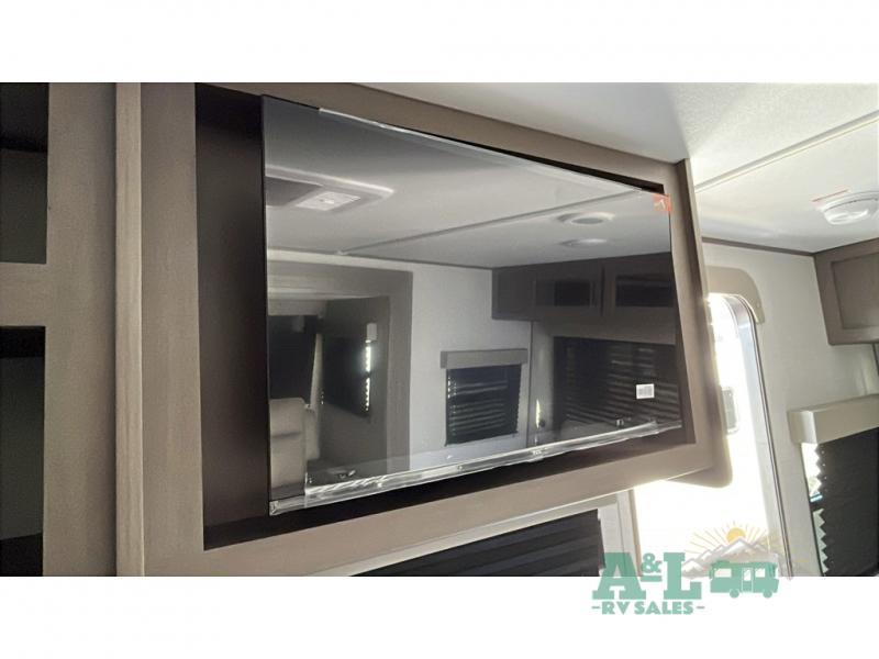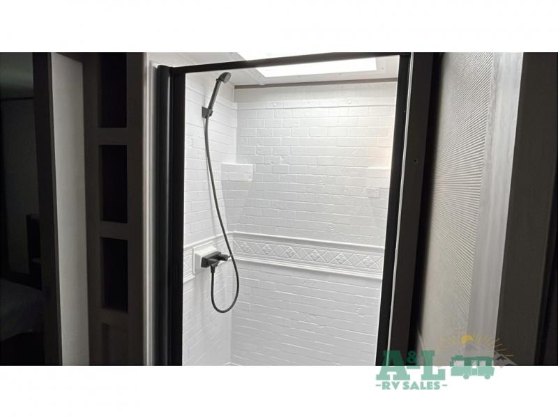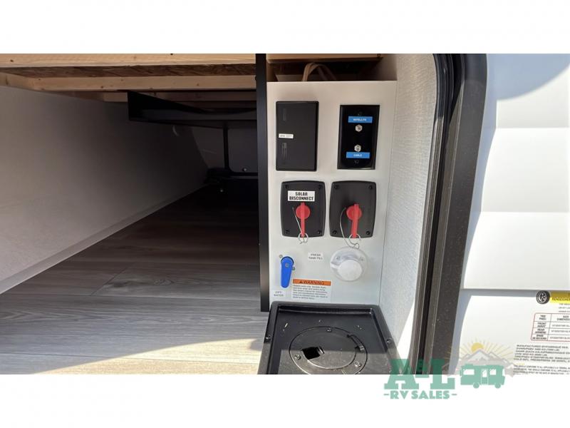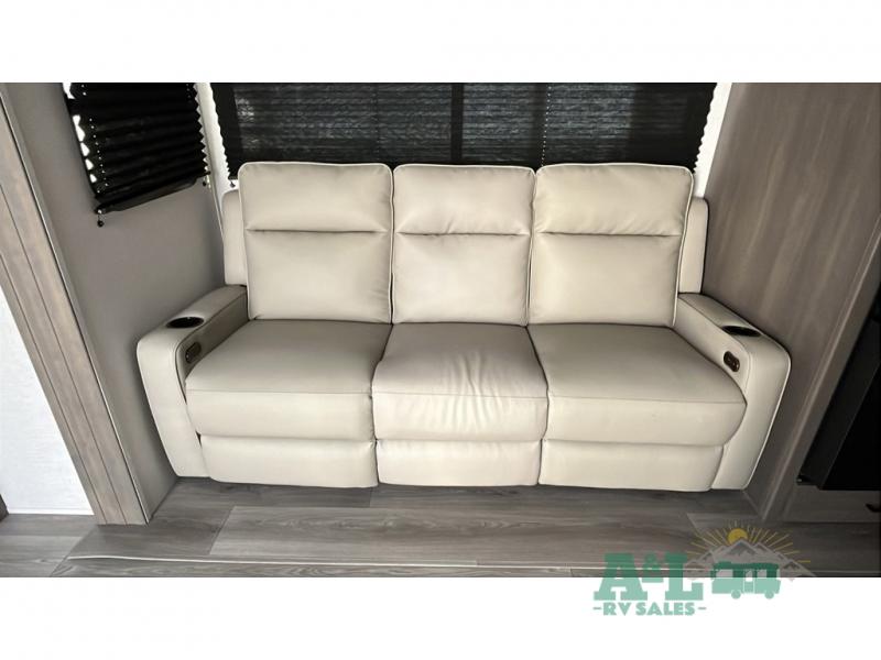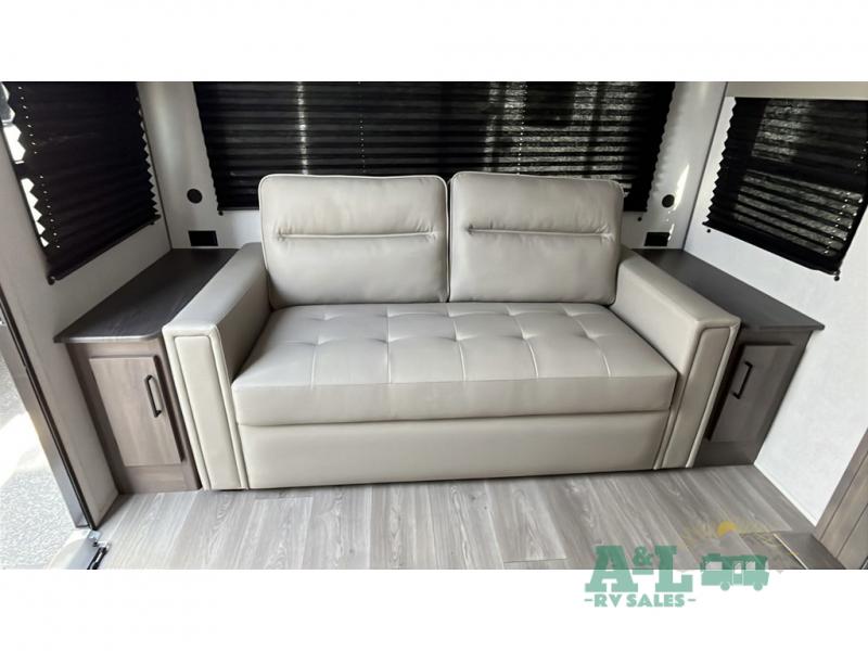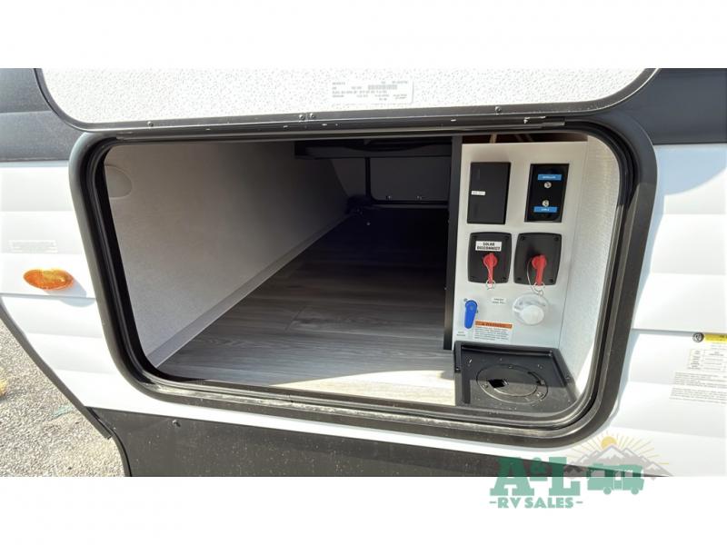 the amount of interior space you have in the living area thanks to the U-shaped dinette slide, which can be switched out for optional theater seats. The rear 70" sleeper sofa will be perfect for guests to sleep on, and the 32" TV lets you enjoy movie nights. There is a three burner range and convection microwave/combo air fryer to cook meals inside, or you can cook on the exterior griddle with a 1.7 cu. ft. refrigerator. And the 17' power awning will provide much wanted shade as you visit with friends. Back inside, the walk-thru bath is both spacious and convenient since it can be accessed from the main living area and the front master bedroom. Here, you'll find a queen bed, storage space, plus TV prep if you want to add a television. You even have your own exterior entry door for convenience!