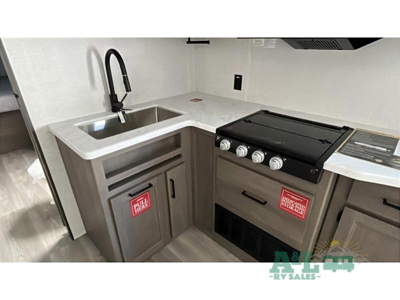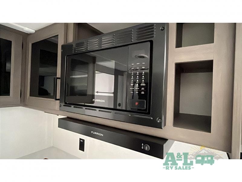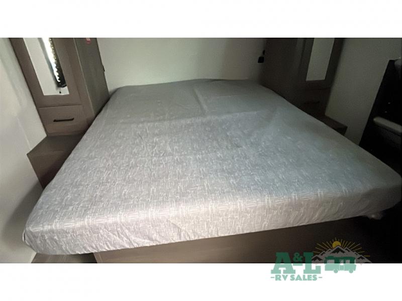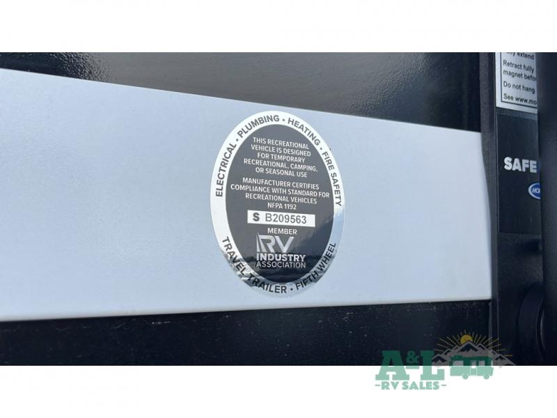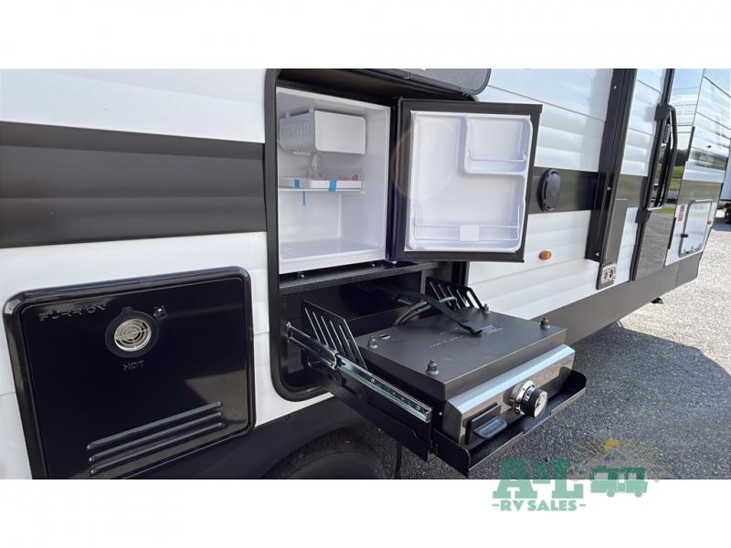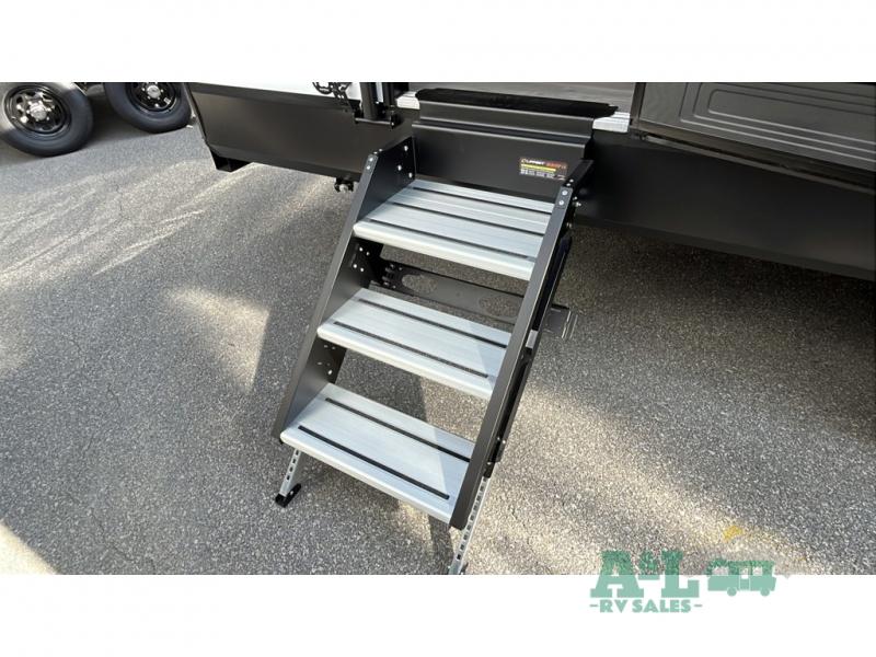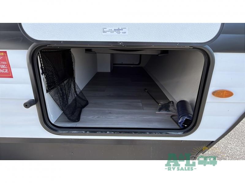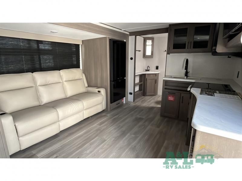 the amount of interior space you have in the living area thanks to the U-shaped dinette slide, which can be switched out for optional theater seats. The rear 70" sleeper sofa will be perfect for guests to sleep on, and the 32" TV lets you enjoy movie nights. There is a three burner range and convection microwave/combo air fryer to cook meals inside, or you can cook on the exterior griddle with a 1.7 cu. ft. refrigerator. And the 17' power awning will provide much wanted shade as you visit with friends. Back inside, the walk-thru bath is both spacious and convenient since it can be accessed from the main living area and the front master bedroom. Here, you'll find a queen bed, storage space, plus TV prep if you want to add a television. You even have your own exterior entry door for convenience!