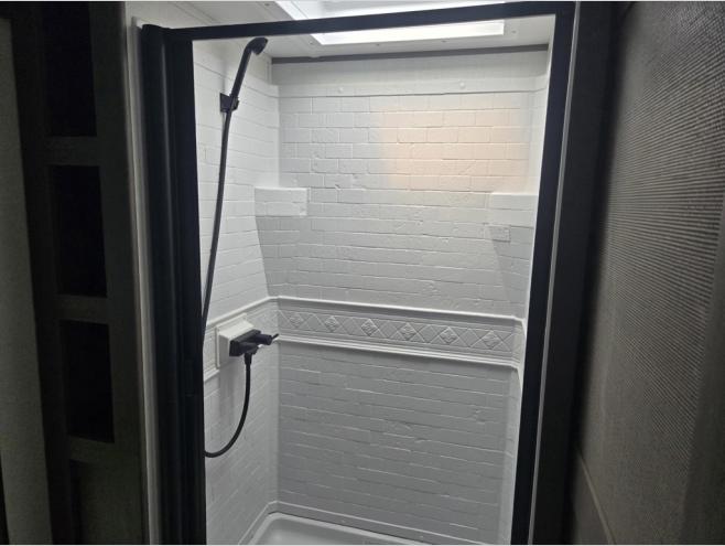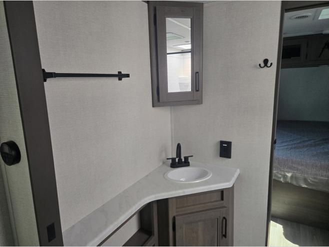 the amount of interior space you have in the living area thanks to the U-shaped dinette slide, which can be switched out for optional theater seats. The rear 70" sleeper sofa will be perfect for guests to sleep on, and the 32" TV lets you enjoy movie nights. There is a three burner range and convection microwave/combo air fryer to cook meals inside, or you can cook on the exterior griddle with a 1.7 cu. ft. refrigerator. And the 17' power awning will provide much wanted shade as you visit with friends. Back inside, the walk-thru bath is both spacious and convenient since it can be accessed from the main living area and the front master bedroom. Here, you'll find a queen bed, storage space, plus TV prep if you want to add a television. You even have your own exterior entry door for convenience!