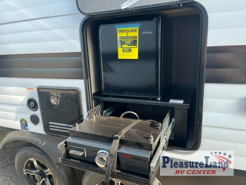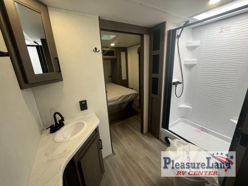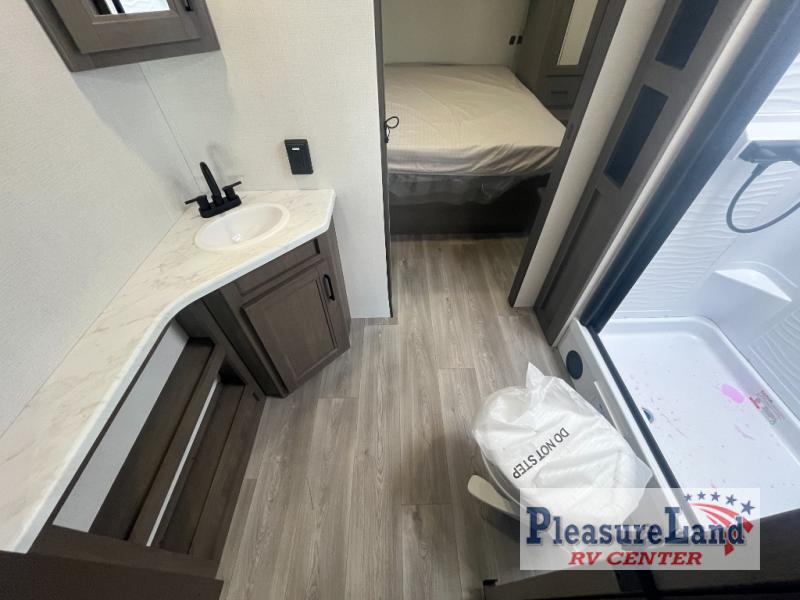 the amount of interior space you have in the living area thanks to the theater seats. The rear 70" sleeper sofa will be perfect for guests to sleep on, and the 32" TV lets you enjoy movie nights. There is a three burner range and convection microwave/combo air fryer to cook meals inside, or you can cook on the exterior griddle with a 1.7 cu. ft. refrigerator. And the 17' power awning will provide much wanted shade as you visit with friends. Back inside, the walk-thru bath is both spacious and convenient since it can be accessed from the main living area and the front master bedroom. Here, you'll find a queen bed, storage space, plus TV prep if you want to add a television. You even have your own exterior entry door for convenience!