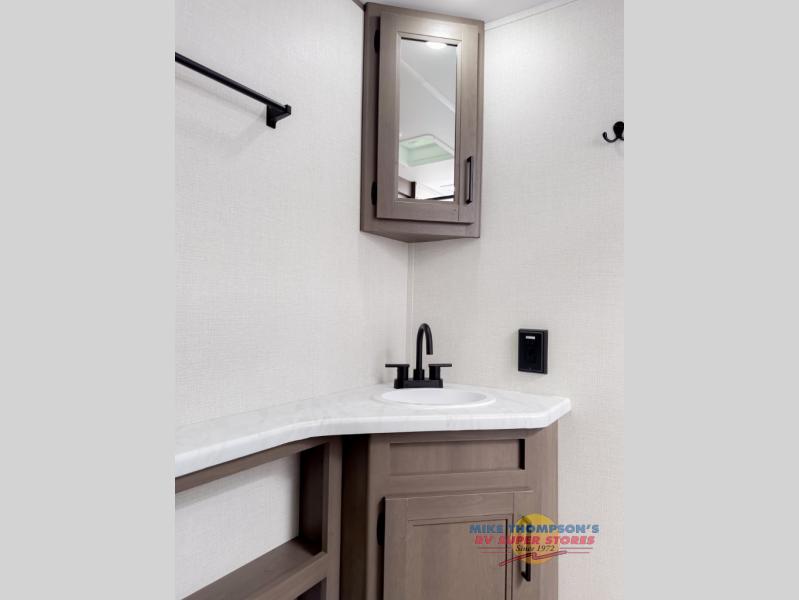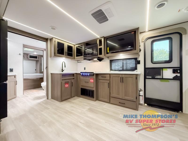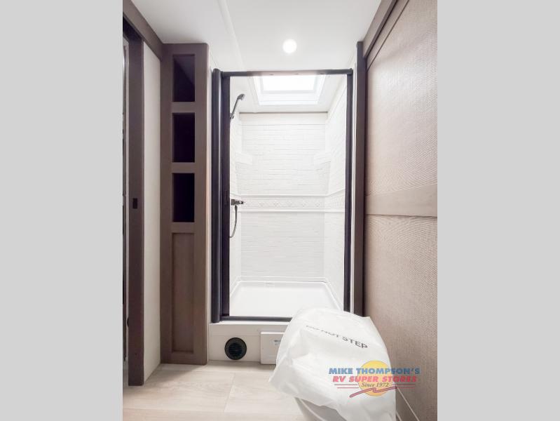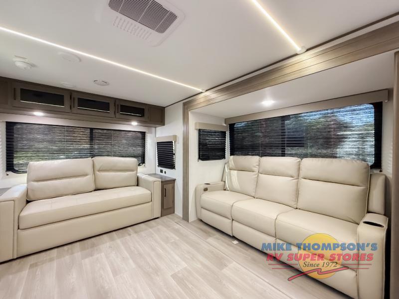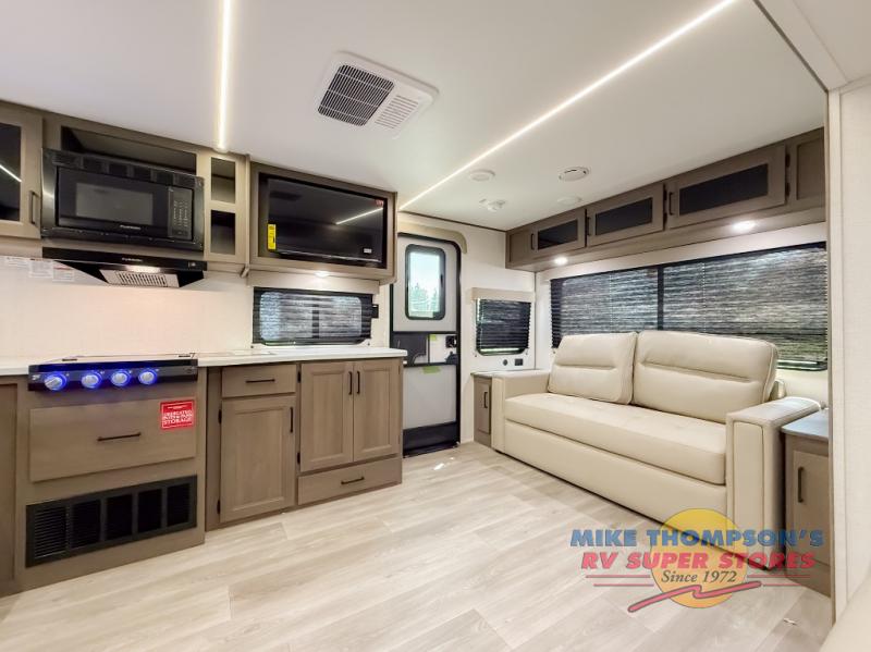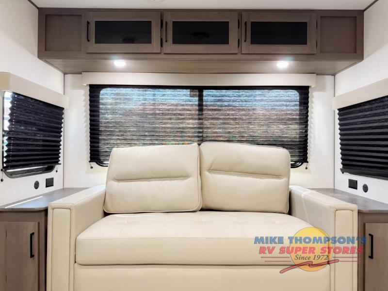 the amount of interior space you have in the living area thanks to the U-shaped dinette slide, which can be switched out for optional theater seats. The rear 70" sleeper sofa will be perfect for guests to sleep on, and the 32" TV lets you enjoy movie nights. There is a three burner range and convection microwave/combo air fryer to cook meals inside, or you can cook on the exterior griddle with a 1.7 cu. ft. refrigerator. And the 17' power awning will provide much wanted shade as you visit with friends. Back inside, the walk-thru bath is both spacious and convenient since it can be accessed from the main living area and the front master bedroom. Here, you'll find a queen bed, storage space, plus TV prep if you want to add a television. You even have your own exterior entry door for convenience!