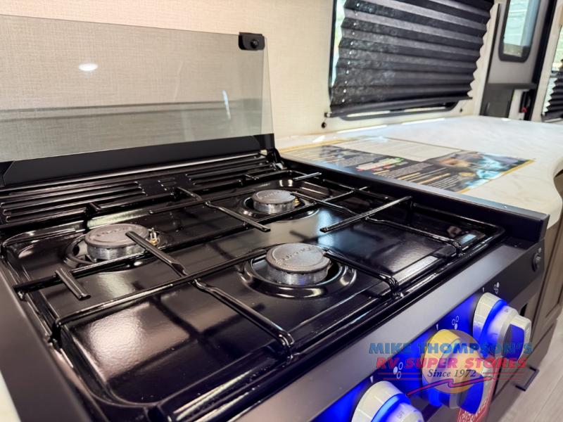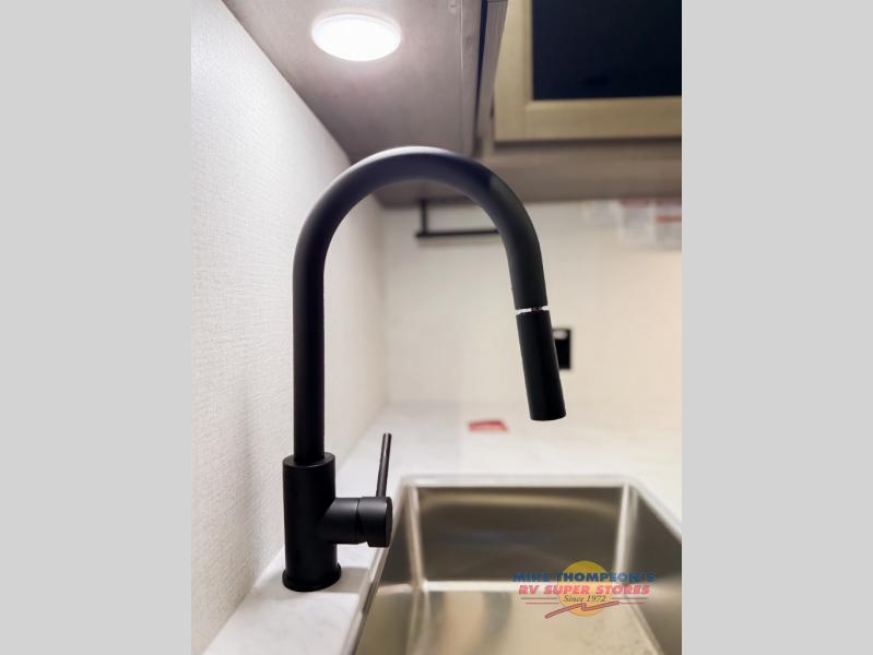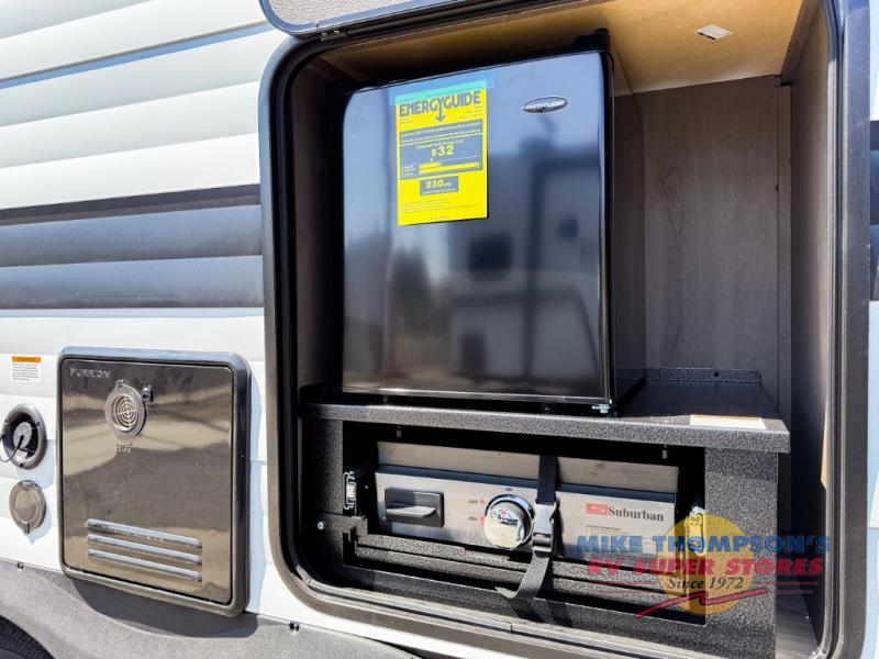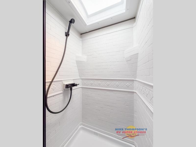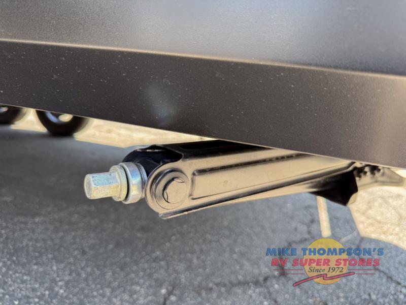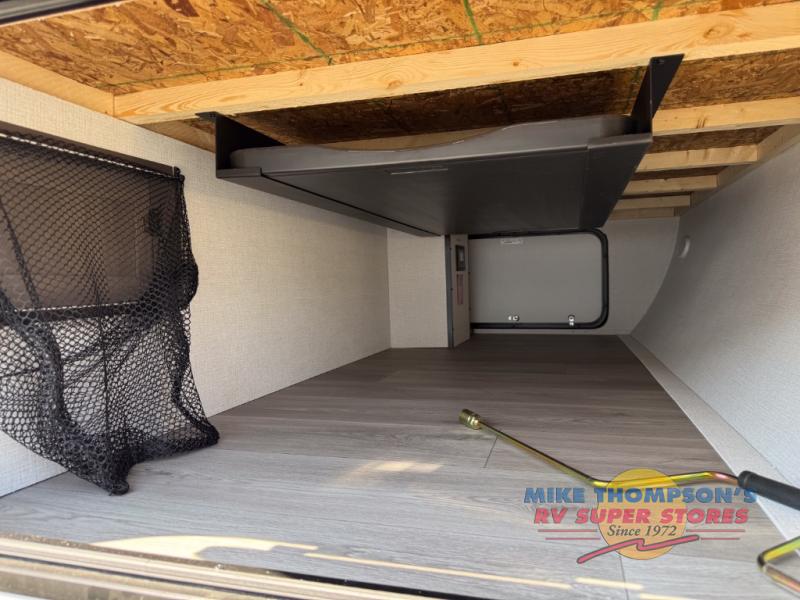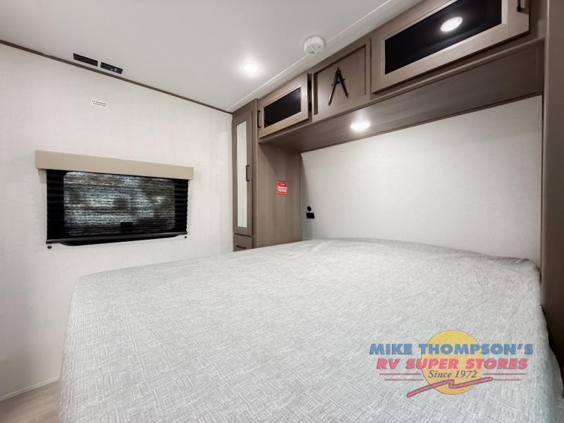 the amount of interior space you have in the living area thanks to the U-shaped dinette slide, which can be switched out for optional theater seats. The rear 70" sleeper sofa will be perfect for guests to sleep on, and the 32" TV lets you enjoy movie nights. There is a three burner range and convection microwave/combo air fryer to cook meals inside, or you can cook on the exterior griddle with a 1.7 cu. ft. refrigerator. And the 17' power awning will provide much wanted shade as you visit with friends. Back inside, the walk-thru bath is both spacious and convenient since it can be accessed from the main living area and the front master bedroom. Here, you'll find a queen bed, storage space, plus TV prep if you want to add a television. You even have your own exterior entry door for convenience!