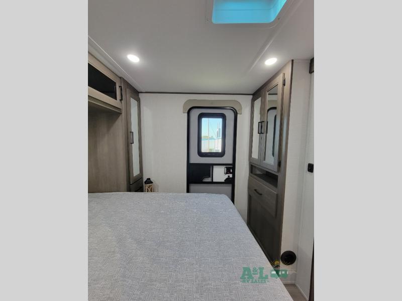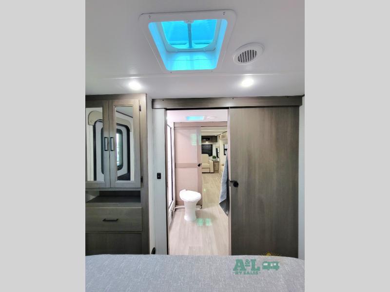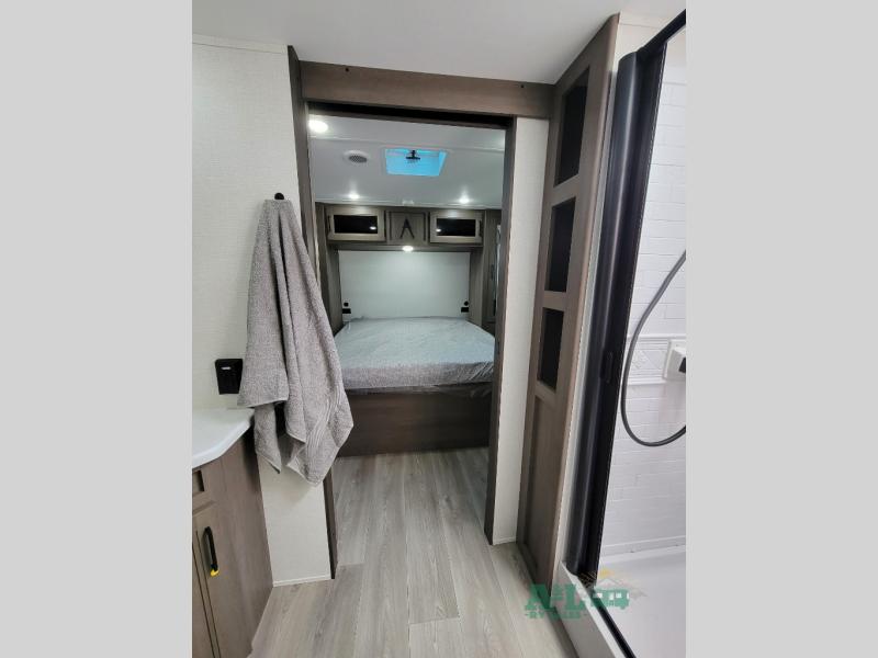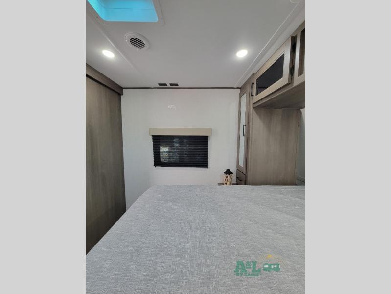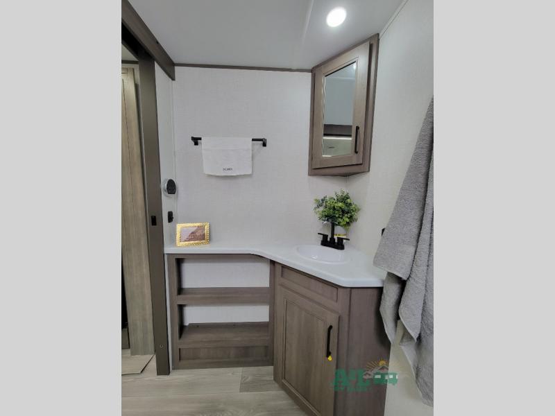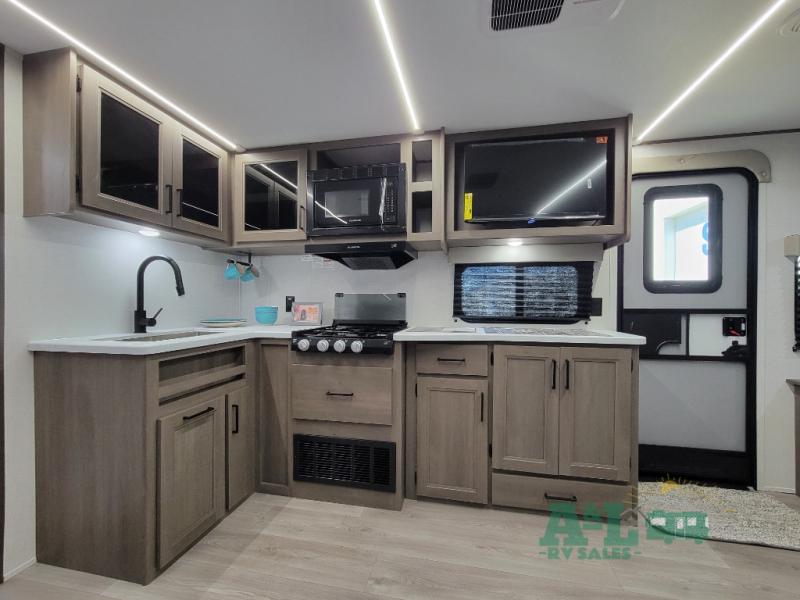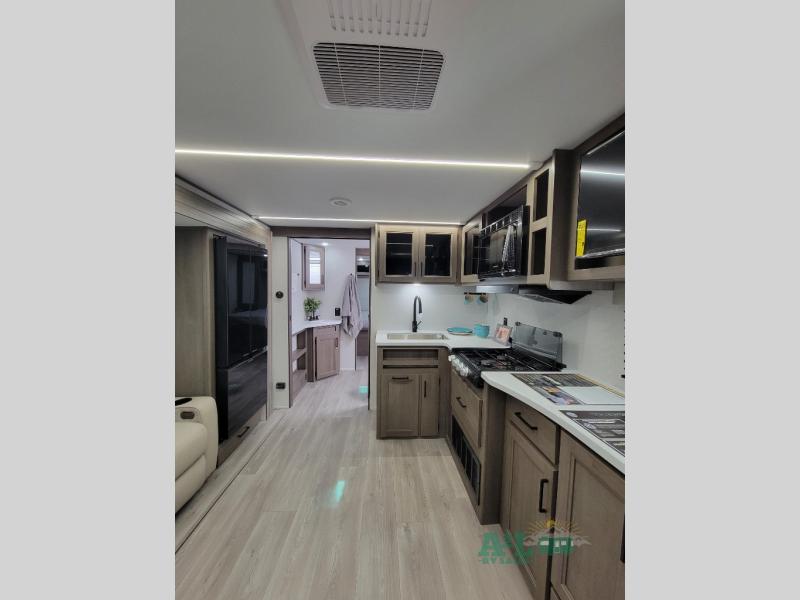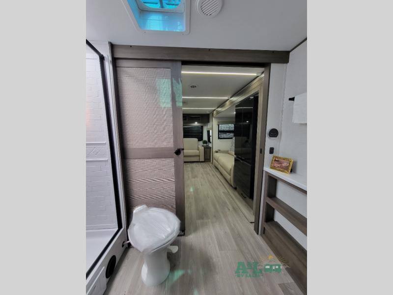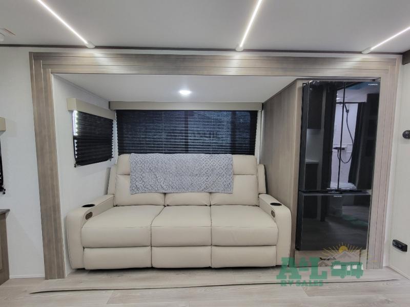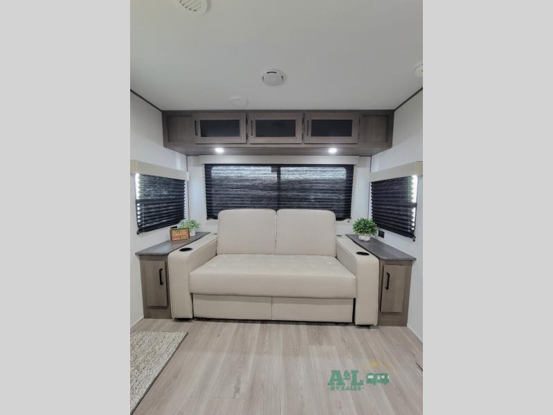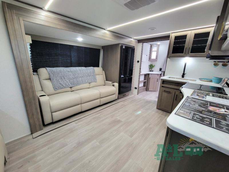 the amount of interior space you have in the living area thanks to the U-shaped dinette slide, which can be switched out for optional theater seats. The rear 70" sleeper sofa will be perfect for guests to sleep on, and the 32" TV lets you enjoy movie nights. There is a three burner range and convection microwave/combo air fryer to cook meals inside, or you can cook on the exterior griddle with a 1.7 cu. ft. refrigerator. And the 17' power awning will provide much wanted shade as you visit with friends. Back inside, the walk-thru bath is both spacious and convenient since it can be accessed from the main living area and the front master bedroom. Here, you'll find a queen bed, storage space, plus TV prep if you want to add a television. You even have your own exterior entry door for convenience!