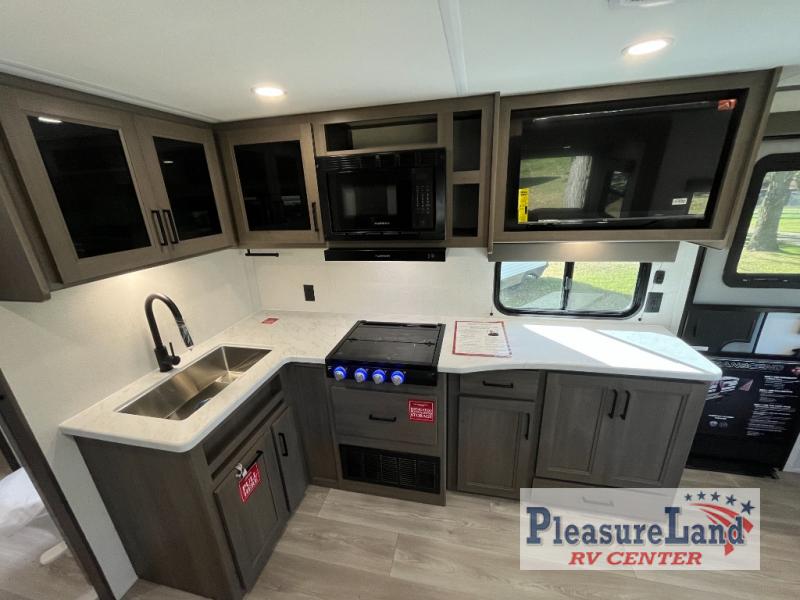 the amount of interior space you have in the living area thanks to the U-shaped dinette slide, which can be switched out for optional theater seats. The rear 70" sleeper sofa will be perfect for guests to sleep on, and the 32" TV lets you enjoy movie nights. There is a three burner range and convection microwave/combo air fryer to cook meals inside, or you can cook on the exterior griddle with a 1.7 cu. ft. refrigerator. And the 17' power awning will provide much wanted shade as you visit with friends. Back inside, the walk-thru bath is both spacious and convenient since it can be accessed from the main living area and the front master bedroom. Here, you'll find a queen bed, storage space, plus TV prep if you want to add a television. You even have your own exterior entry door for convenience!