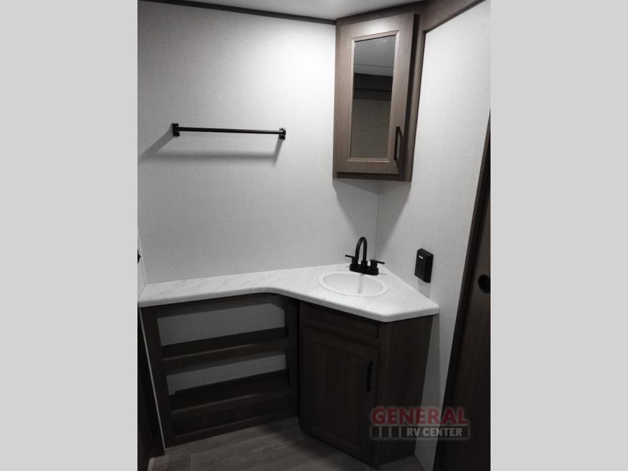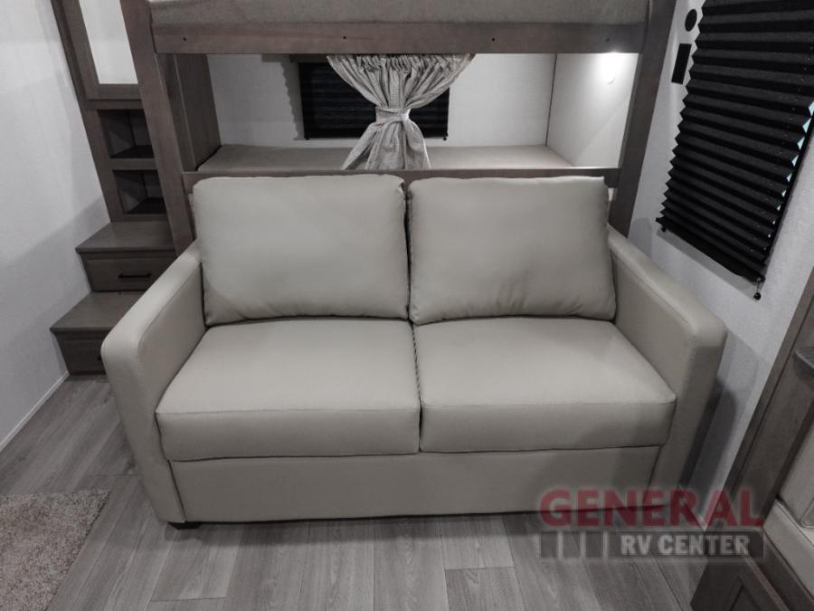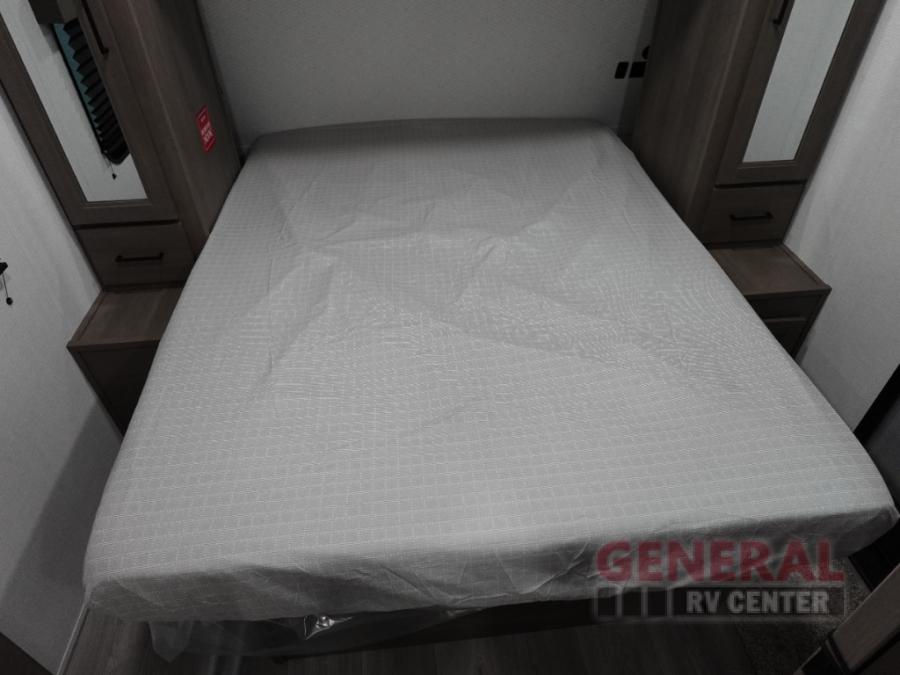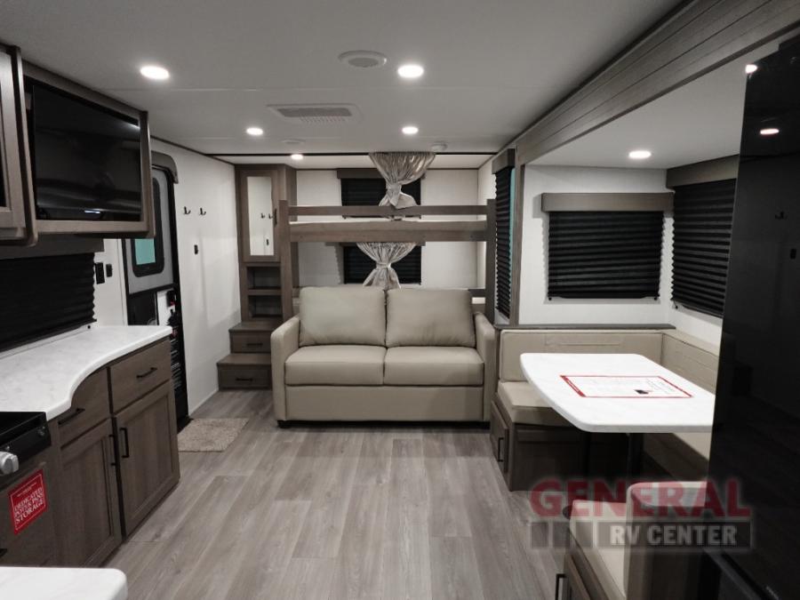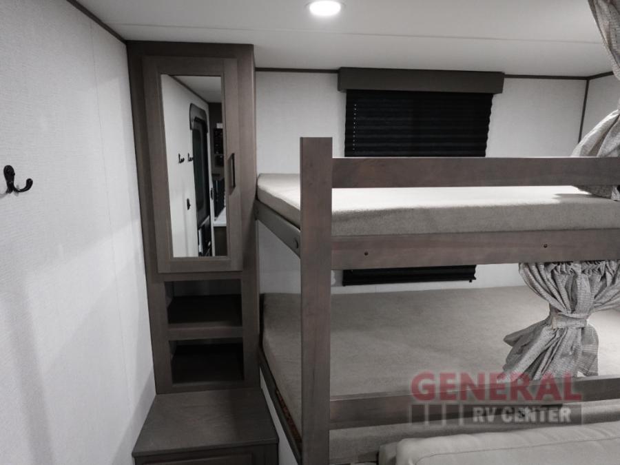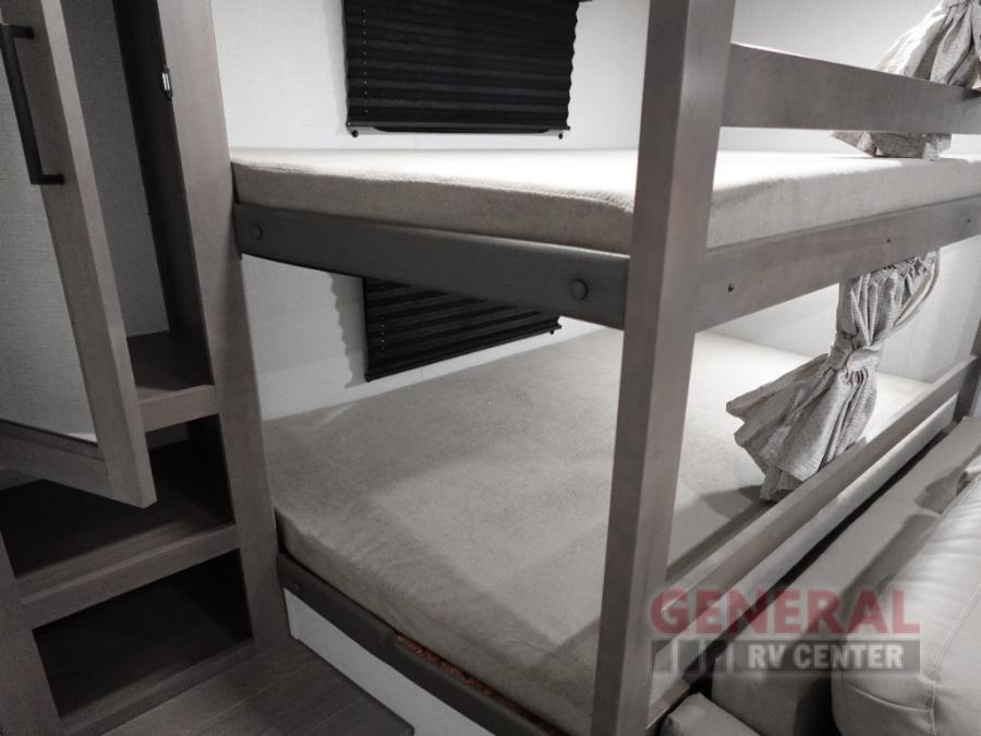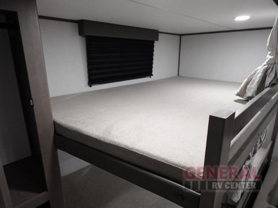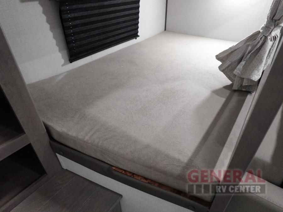 Your crew of eight will love camping in this spacious travel trailer! There are double-size bunks in the back with step storage and an added wardrobe for your guests' things plus exterior storage for camp gear galore. A walk-thru bath will create a front master bedroom you are sure to love, especially with its queen bed, wardrobe storage, and private exterior entry door! The main living area will be a favorite place to hang out with its U-shaped dinette, theater seating and 32" TV. If the weather is nice, you may just find yourselves outdoors since there is a rear exterior griddle and 1.7 cu. ft. refrigerator!