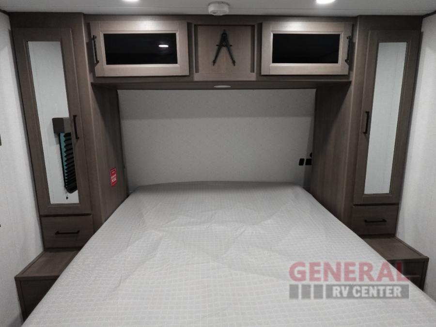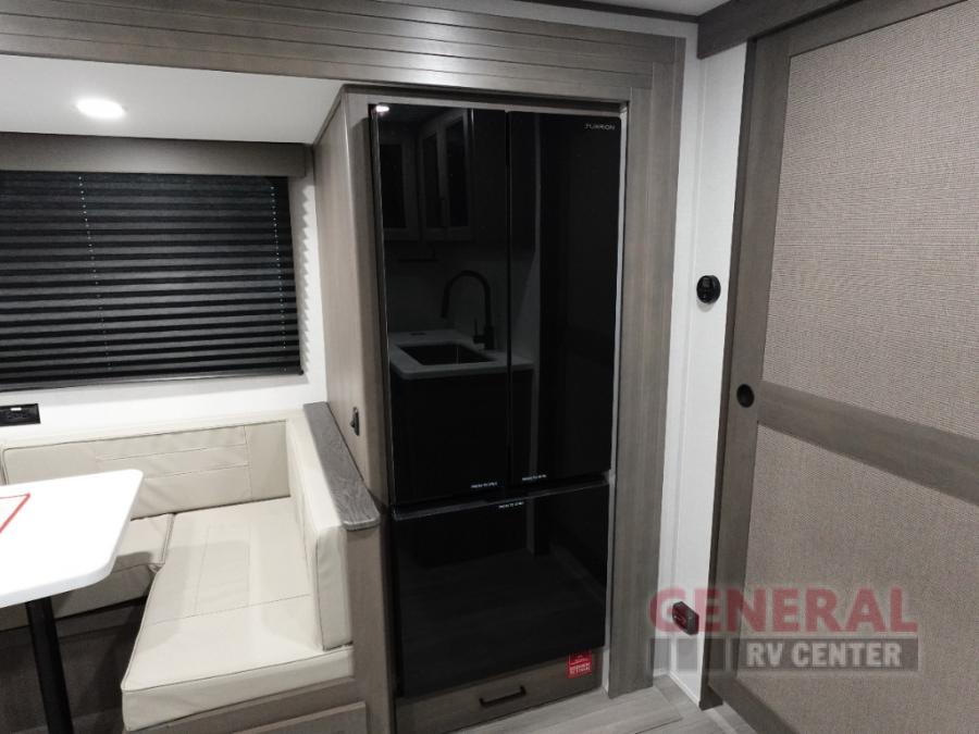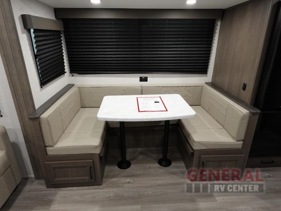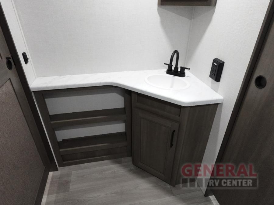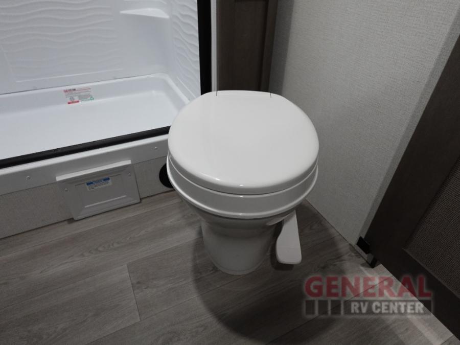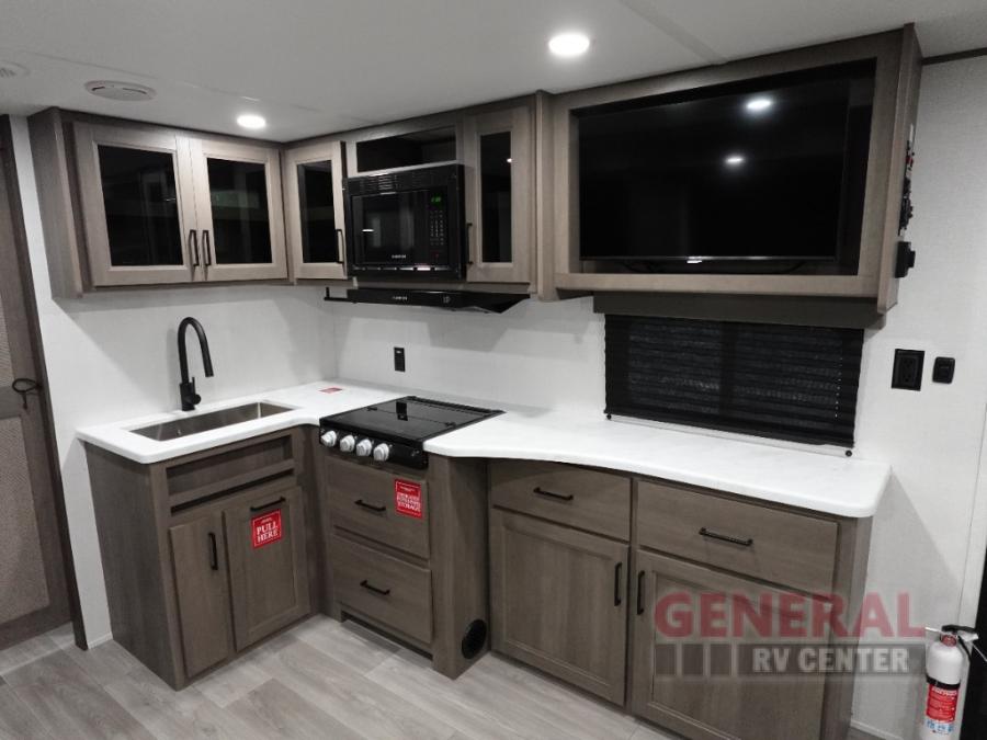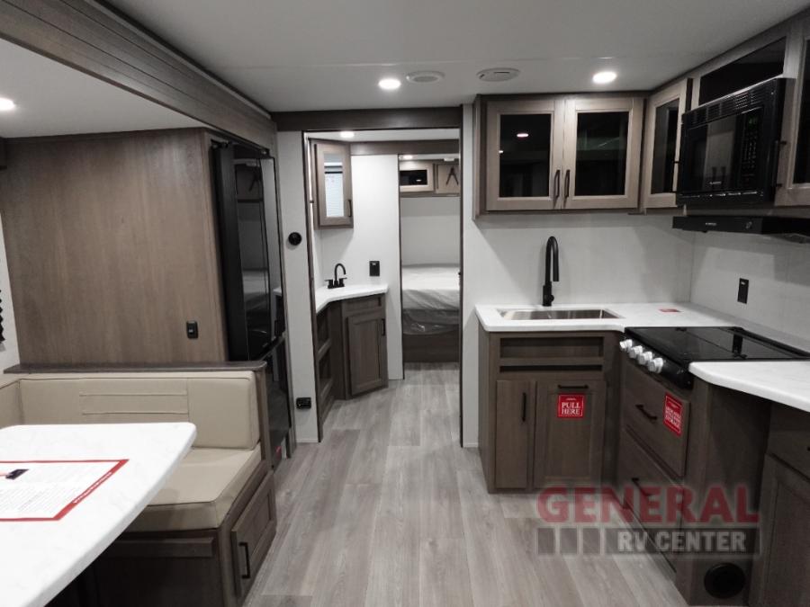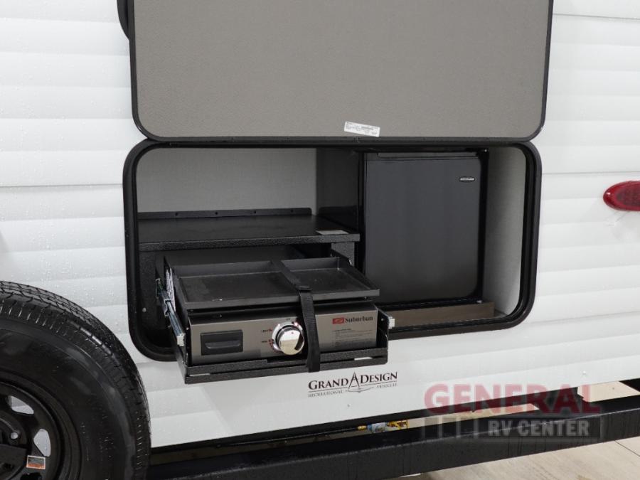 Your crew of eight will love camping in this spacious travel trailer! There are double-size bunks in the back with step storage and an added wardrobe for your guests' things plus exterior storage for camp gear galore. A walk-thru bath will create a front master bedroom you are sure to love, especially with its queen bed, wardrobe storage, and private exterior entry door! The main living area will be a favorite place to hang out with its U-shaped dinette, theater seating and 32" TV. If the weather is nice, you may just find yourselves outdoors since there is a rear exterior griddle and 1.7 cu. ft. refrigerator!