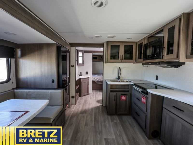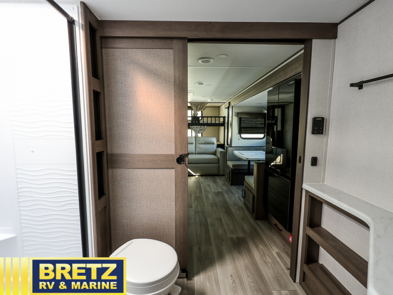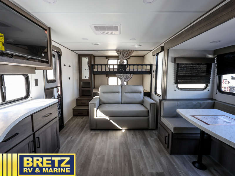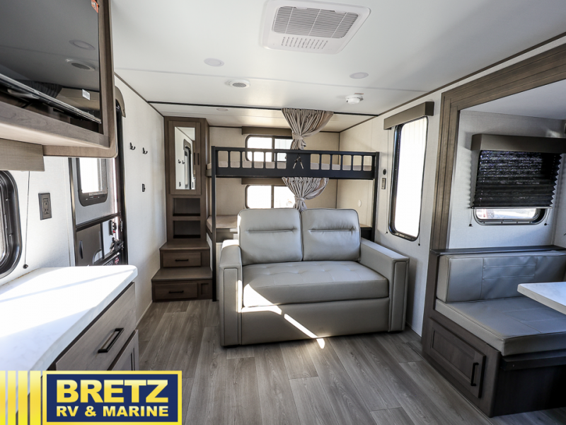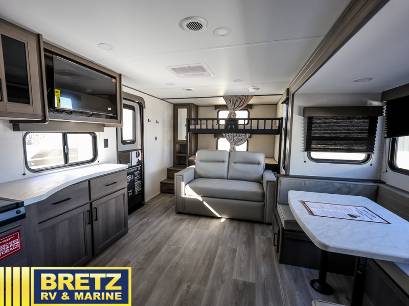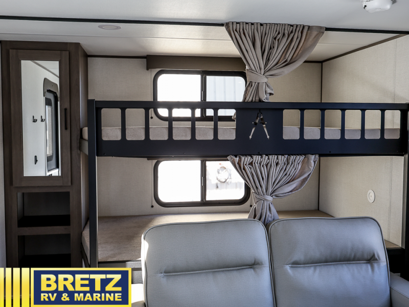 Your crew of eight will love camping in this spacious travel trailer! There are double-size bunks in the back with step storage and an added wardrobe for your guests' things plus exterior storage for camp gear galore. A walk-thru bath will create a front master bedroom you are sure to love, especially with its queen bed, wardrobe storage, and private exterior entry door! The main living area will be a favorite place to hang out with its U-shaped dinette, theater seating and 32" TV. If the weather is nice, you may just find yourselves outdoors since there is a rear exterior griddle and 1.7 cu. ft. refrigerator!