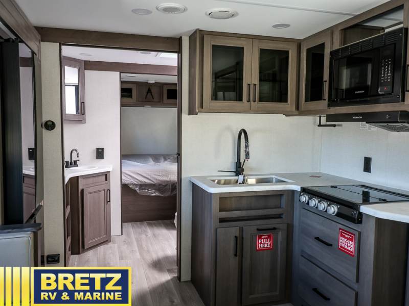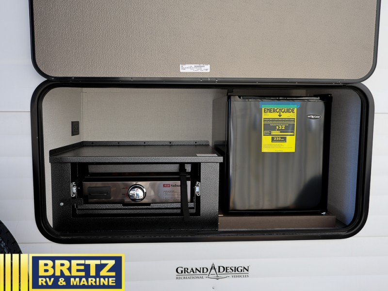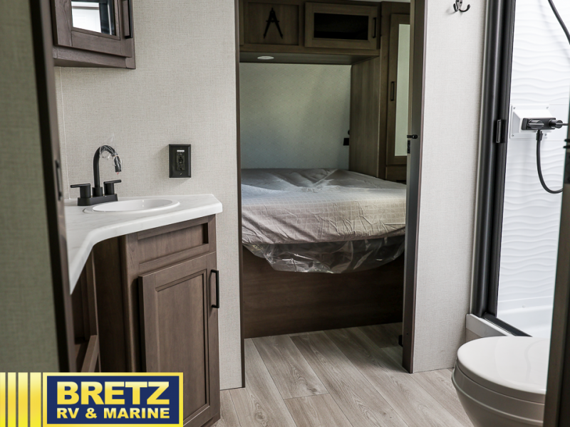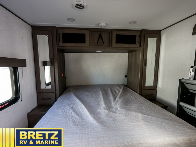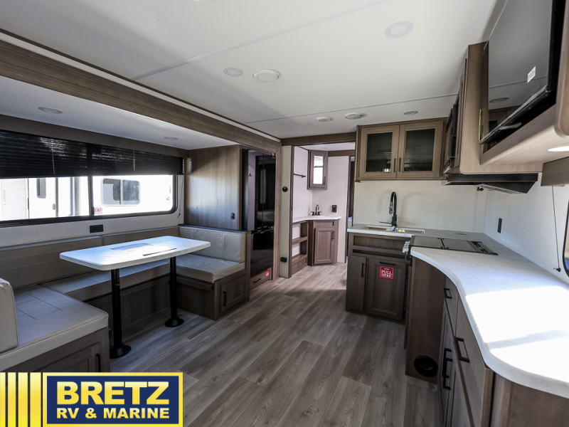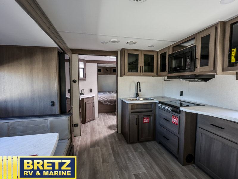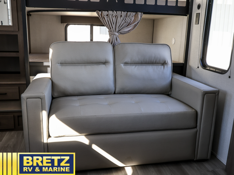 Your crew of eight will love camping in this spacious travel trailer! There are double-size bunks in the back with step storage and an added wardrobe for your guests' things plus exterior storage for camp gear galore. A walk-thru bath will create a front master bedroom you are sure to love, especially with its queen bed, wardrobe storage, and private exterior entry door! The main living area will be a favorite place to hang out with its U-shaped dinette, theater seating and 32" TV. If the weather is nice, you may just find yourselves outdoors since there is a rear exterior griddle and 1.7 cu. ft. refrigerator!