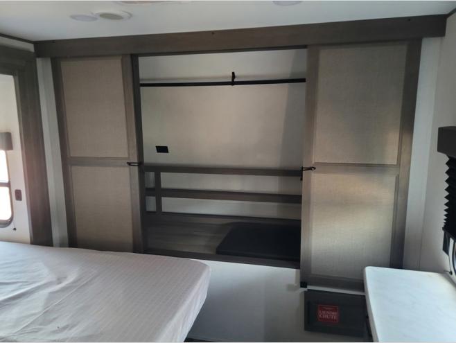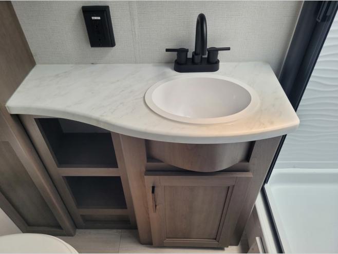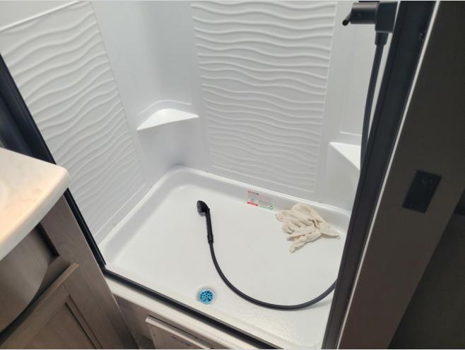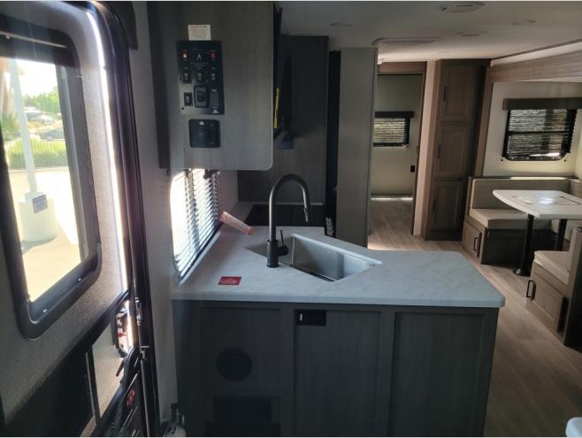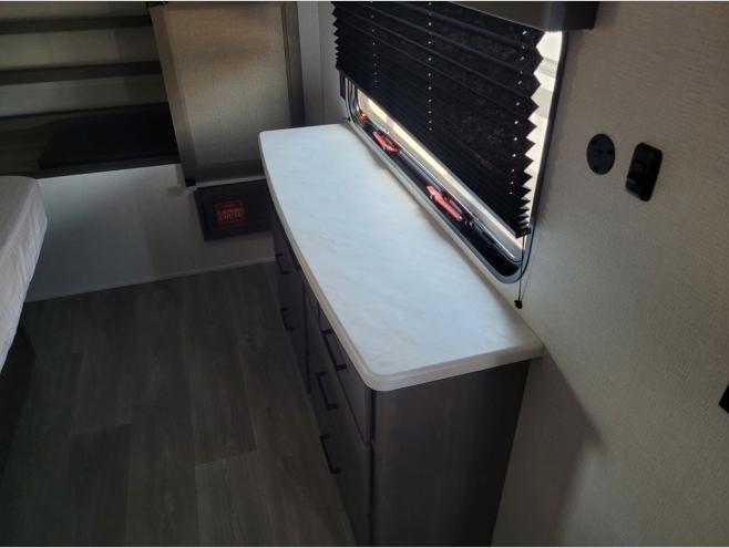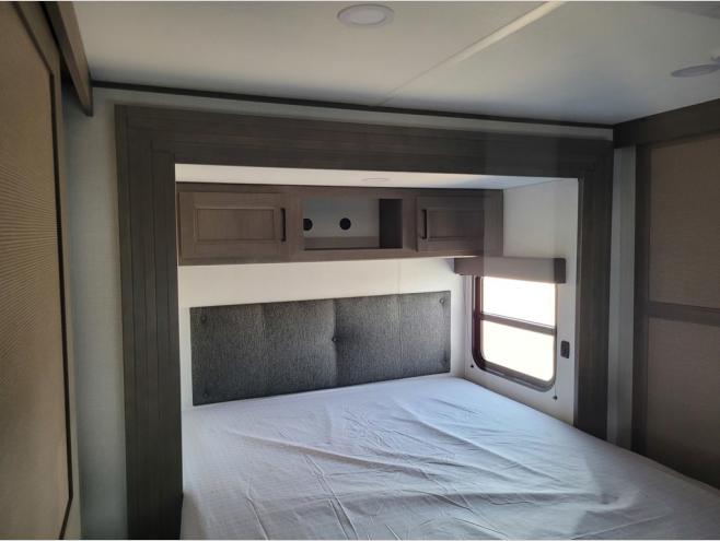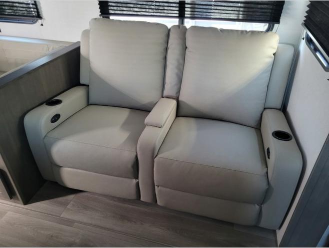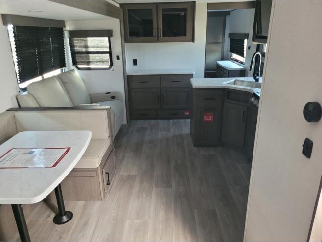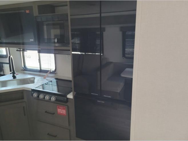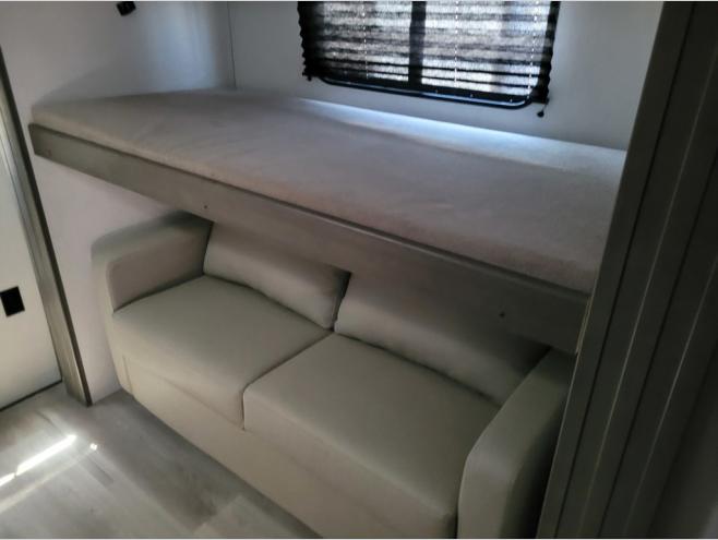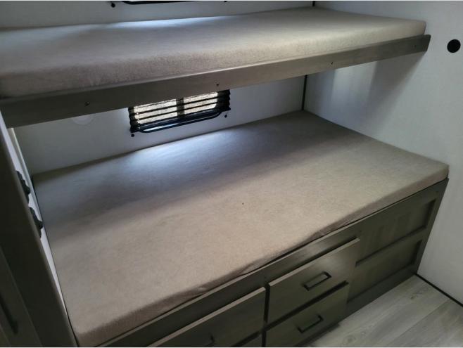 If you're looking for a travel trailer that can house your whole gang, this unit is the one! The rear private bunkhouse can sleep up to five since there is a sleeper sofa and three bunks, plus there are storage drawers for your guests' things. A front private bedroom will be perfect for the owners with a queen bed slide out and spacious front closet with washer and dryer prep! Whether you cook outside on the exterior griddle or inside on the three burner range, you'll be able to make your best meals. There is also a 12V French door refrigerator with a glass front and bottom freezer and a convection microwave/combo air fryer to enjoy some crispy fries! A U-shaped dinette and 60" sleeper sofa within the living room slide provides even more seating and sleeping space!