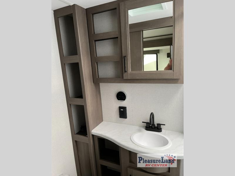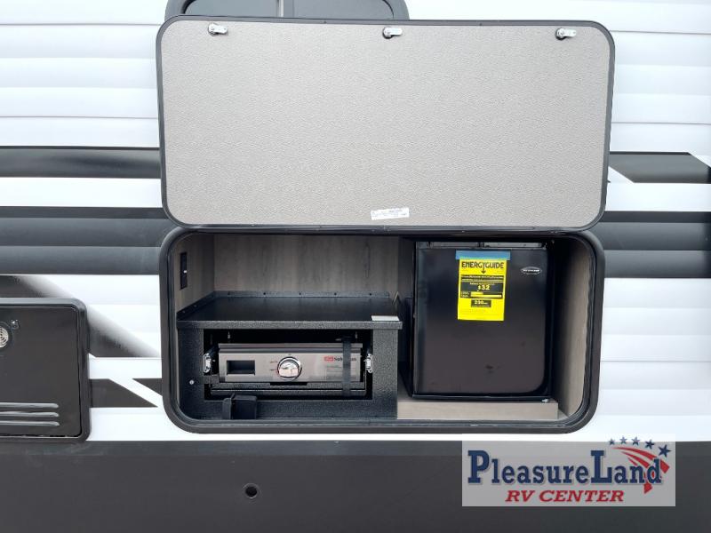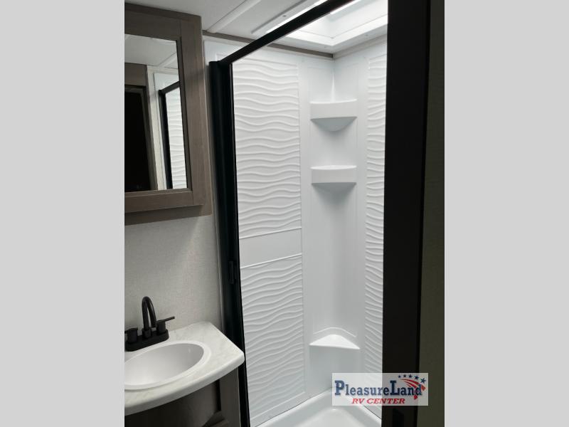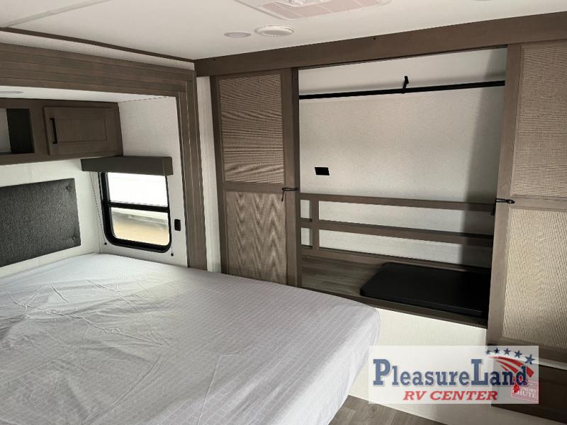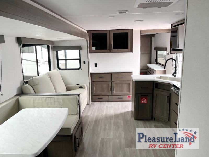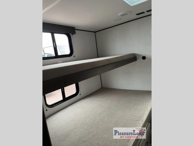 If you're looking for a travel trailer that can house your whole gang, this unit is the one! The rear private bunkhouse can sleep up to five since there is a sleeper sofa and three bunks, plus there are storage drawers for your guests' things. A front private bedroom will be perfect for the owners with a queen bed slide out and spacious front closet with washer and dryer prep! Whether you cook outside on the exterior griddle or inside on the three burner range, you'll be able to make your best meals. There is also a 12V French door refrigerator with a glass front and bottom freezer and a convection microwave/combo air fryer to enjoy some crispy fries! A U-shaped dinette and 60" sleeper sofa within the living room slide provides even more seating and sleeping space!