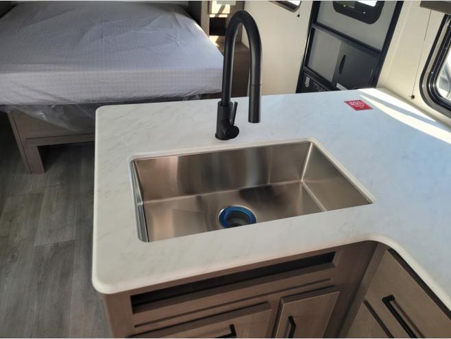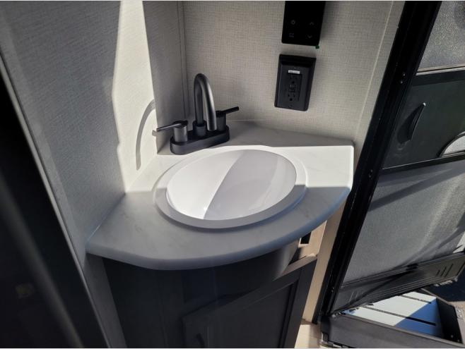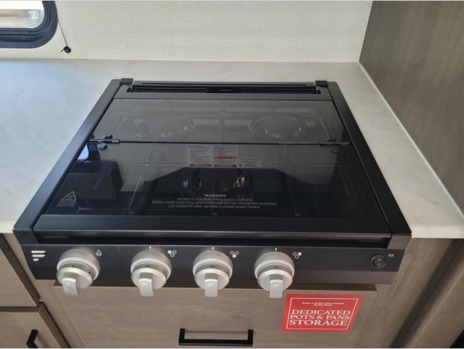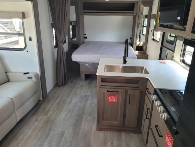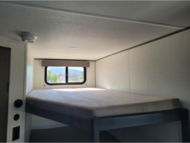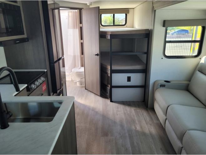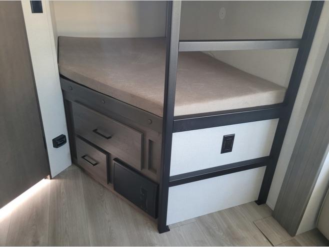 This fantastic travel trailer is designed to provide the ultimate in comfort, convenience, and adventure! The double-size bunk beds are perfect for kids, providing ample sleeping space and an under-bed storage space for all your belongings. The full bathroom features a linen closet, providing convenient storage for towels and toiletries. In the kitchen area, the U-shaped dinette is a great spot for creating memories that will last a lifetime, the refrigerator keeps your food and drinks fresh, while the microwave provides a quick and easy way to prepare meals. And for major convenience, the pull-out trash makes cleaning up a simple task. Take a nap in the comfortable front queen bed, which is a serene retreat, providing a comfortable spot to rest and relax. Jump to the exterior in a comfortable way with the double entry/exit door providing added convenience and flexibility, while the exterior awning provides shade and protection from the elements. The pass-through storage offers ample space for your outdoor gear and equipment.