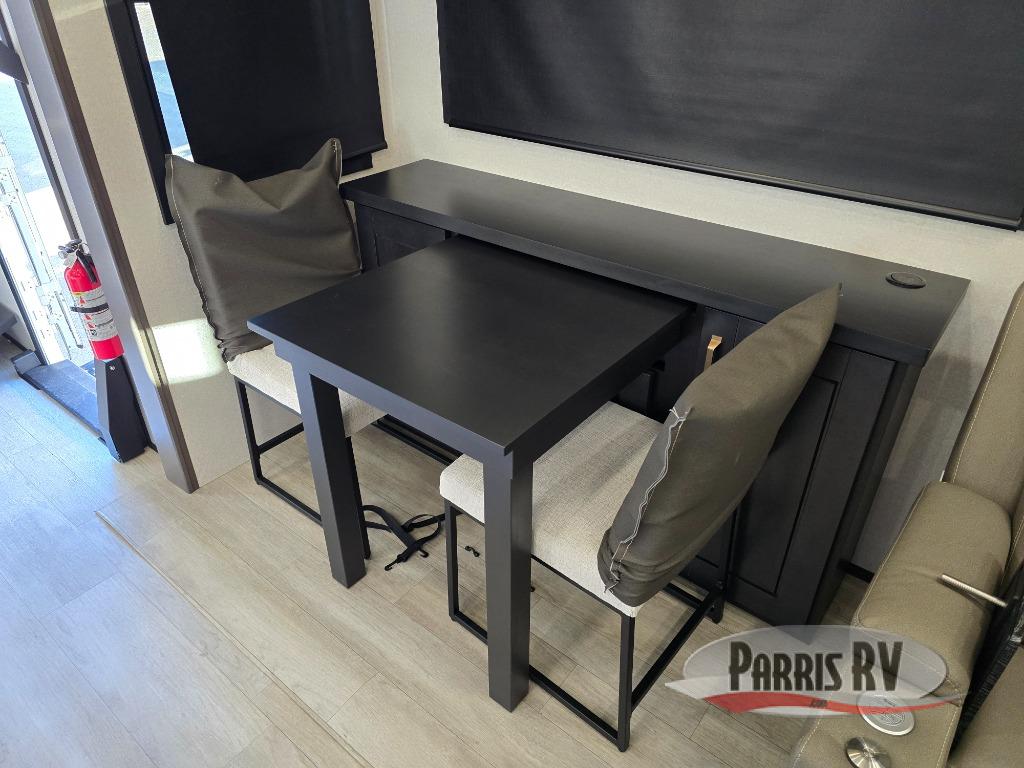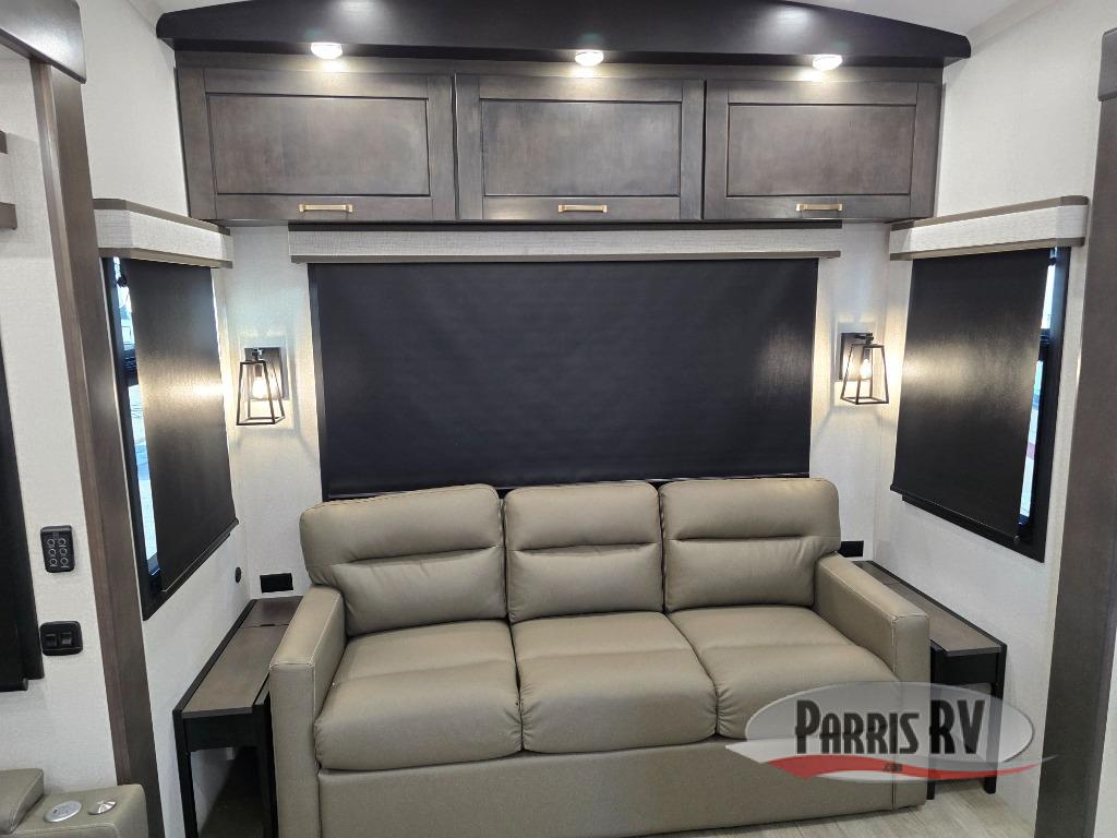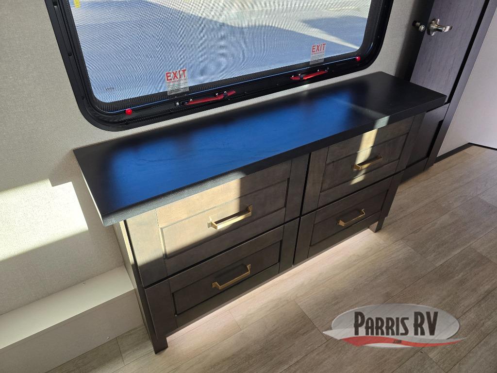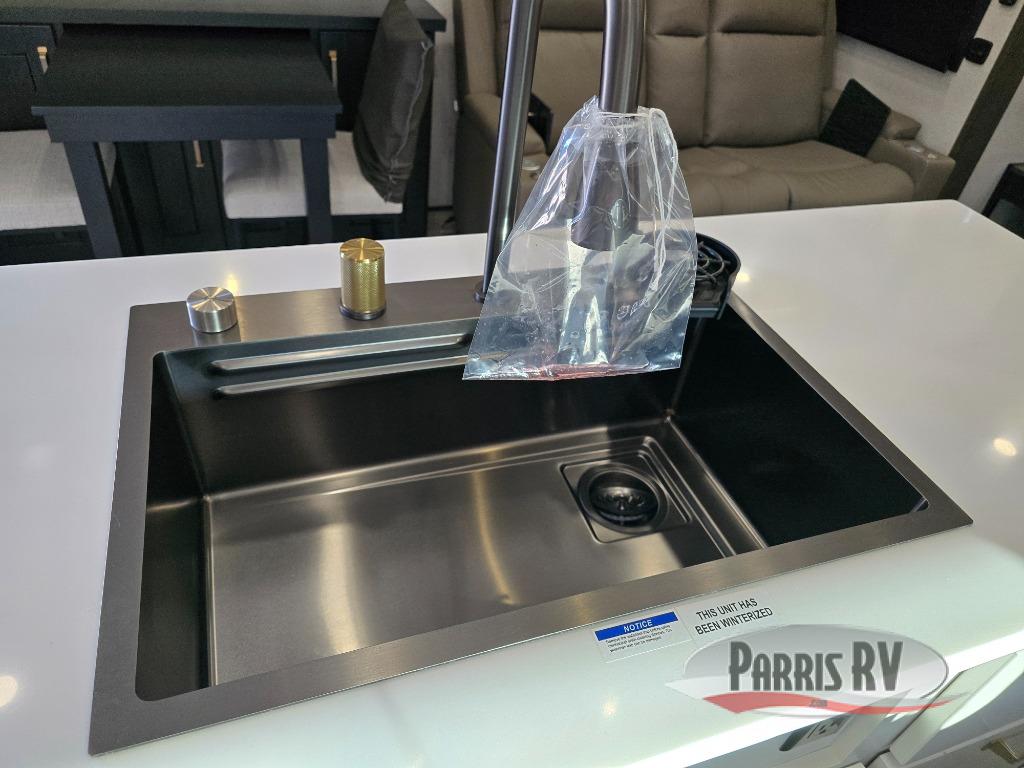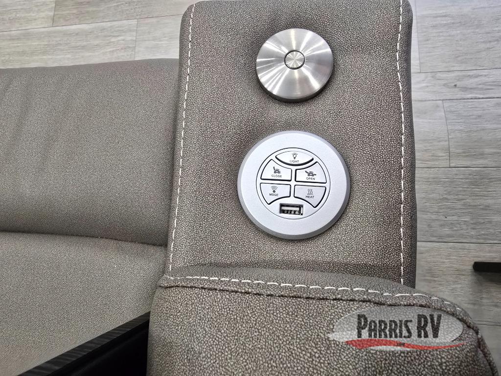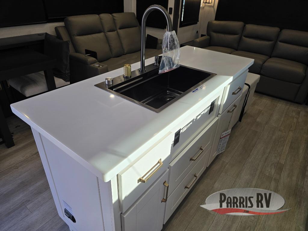At the front of the unit, the spacious main bedroom offers a 72" x 80" king bed, providing ample room to relax and unwind. A wardrobe with drawers and a built-in hamper ensures plenty of organized storage for clothing and essentials, while a flip-up dresser across from the bed adds even more convenience. Moving down the hall, you’ll find a full bathroom featuring a large 36" x 48" shower with a built-in seat for added comfort. Toward the rear, the main living area has dual opposing slides that open up the space for maximum comfort and functionality. One slide hosts the fully equipped kitchen, complete with overhead cabinets, a convection microwave with built-in air fryer, a 24" range, and a 21-cu. ft. residential refrigerator, everything you need to cook in comfort. The central kitchen island features a residential “Do-It-All” sink with a pull-out faucet, glass rinse, vegetable rinse, and a pull-out cutting board for easy meal prep, while the corner pantry provides generous storage. Opposite the kitchen, you can relax in the theater seating or enjoy meals at the roll-out table. At the rear, a 78" hide-a-bed sofa offers additional lounging space or converts into extra-sleeping accommodations when needed.